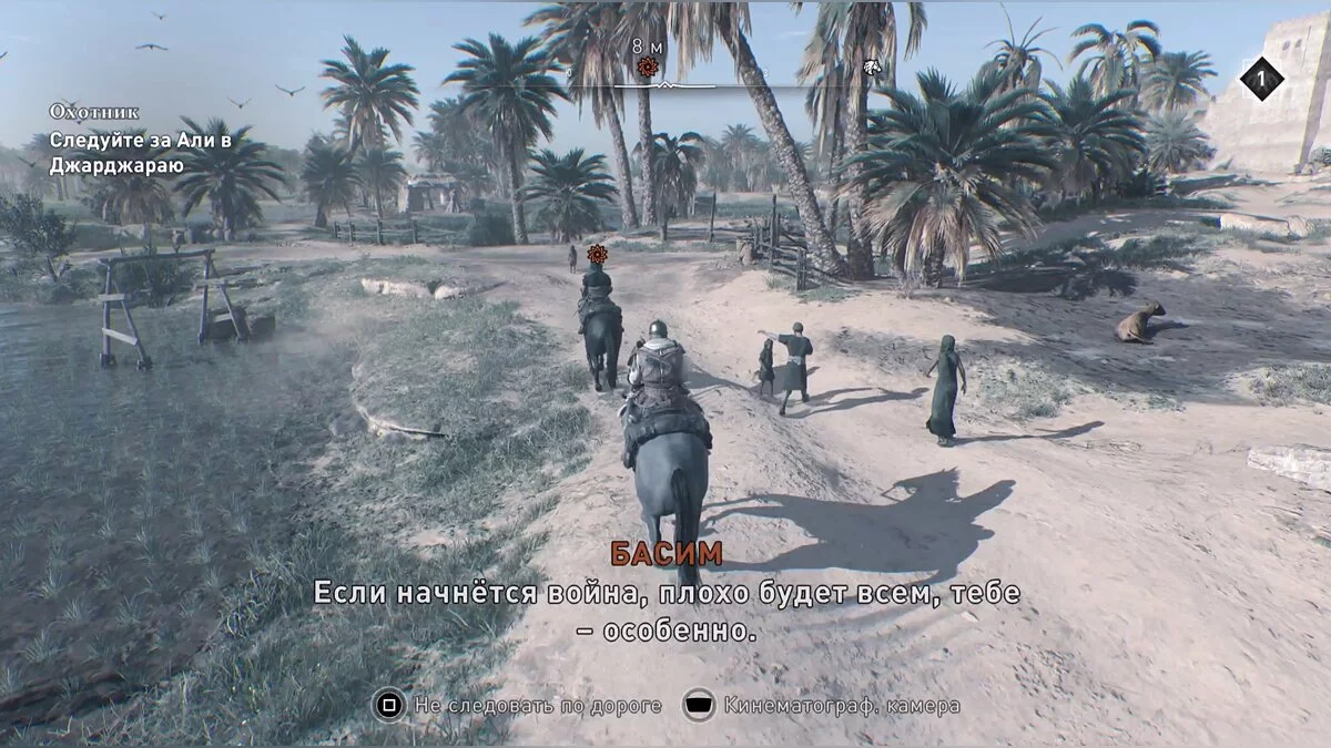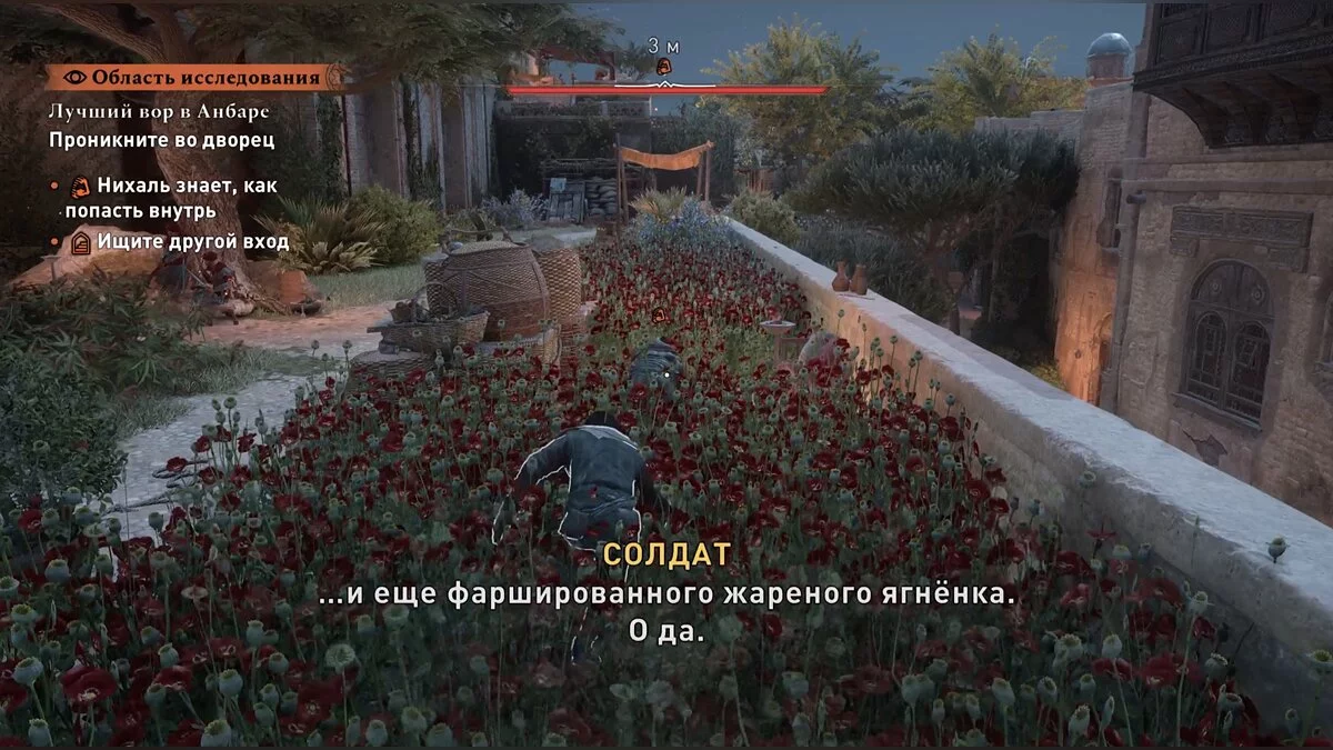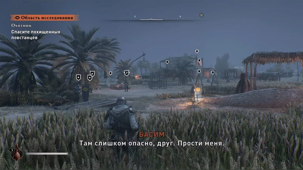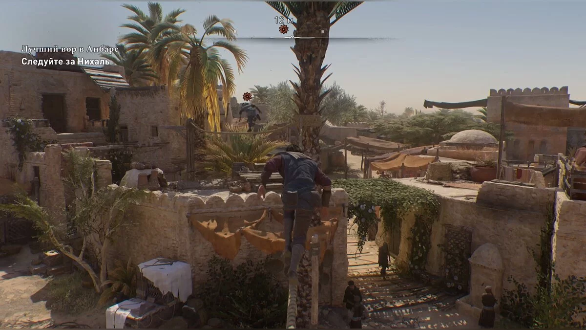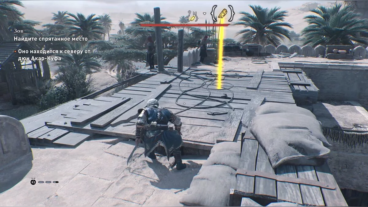 Перед уходом из караван-сарая Басим заметил Нихаль. Отправляйтесь в свой старый дом в Анбаре. Девушка уже ждет вас. После заставки нужно выяснить, что же ее так влечет. Это место расположено правее Анбара — в оазисе. Найти его будет просто, так как там есть точка синхронизации.