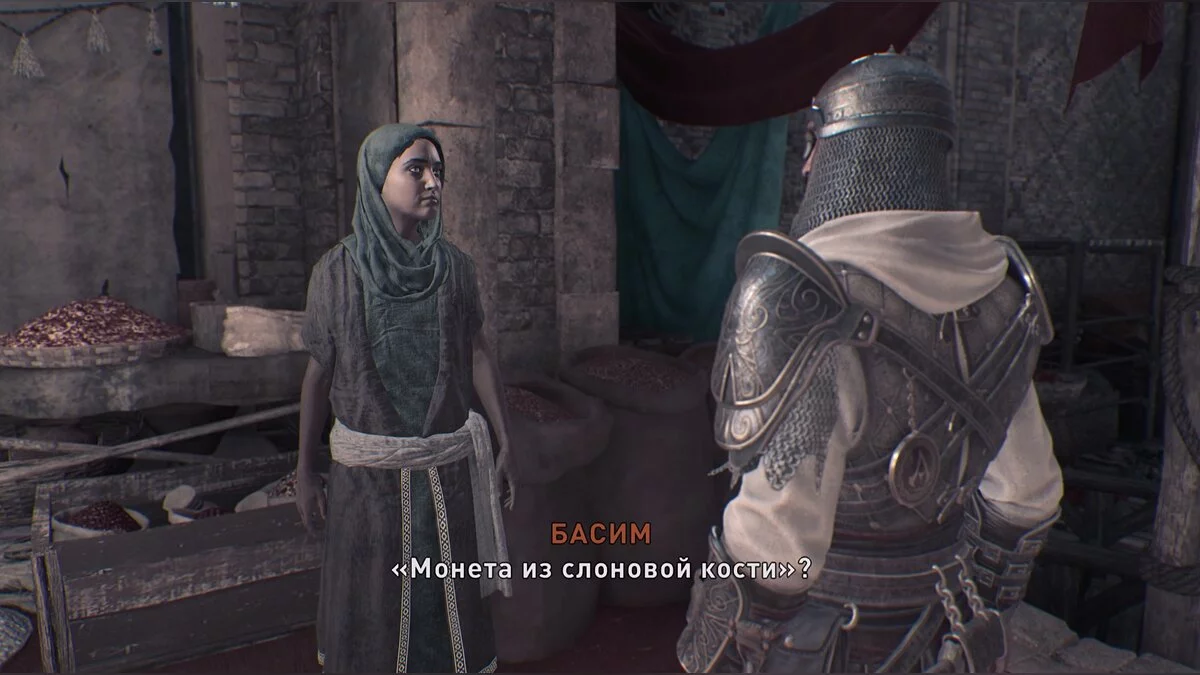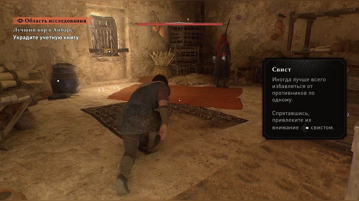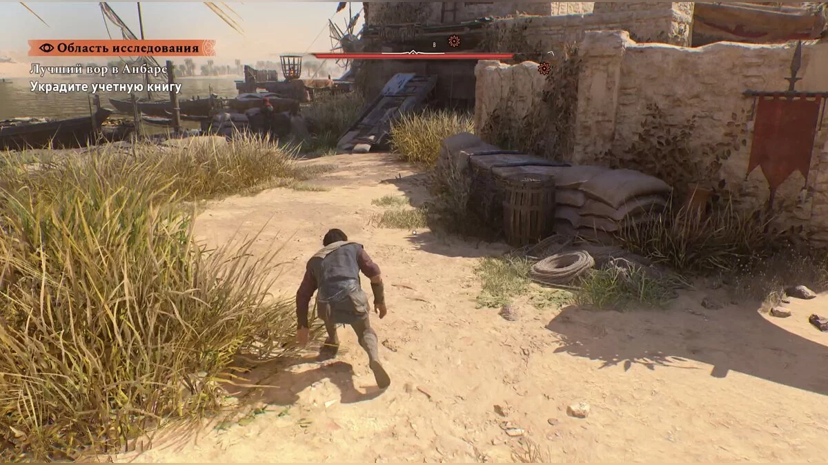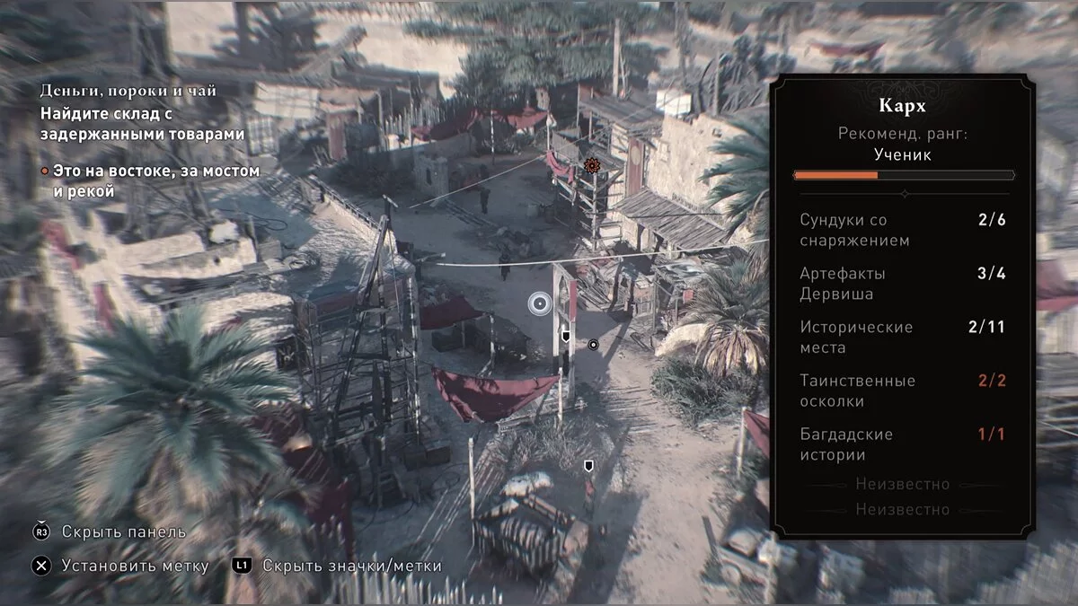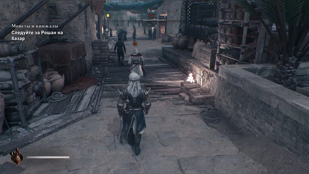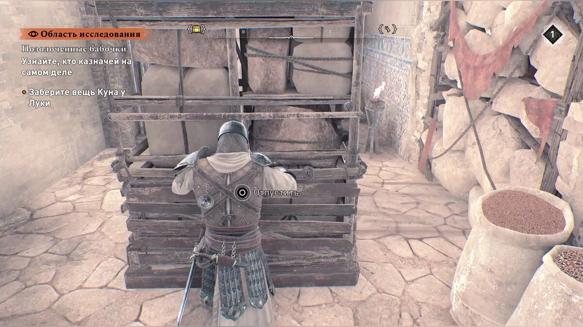 Используя орлиное зрение, найдите мешок с деньгами, оставленный купцом. Далее следуйте за Нихаль, пока она не найдет еще одну цель для кражи. Освойте эту механику и двигайтесь к Дервишу. Снова посмотрите кат-сцену и двигайтесь на склад за учетной книгой.