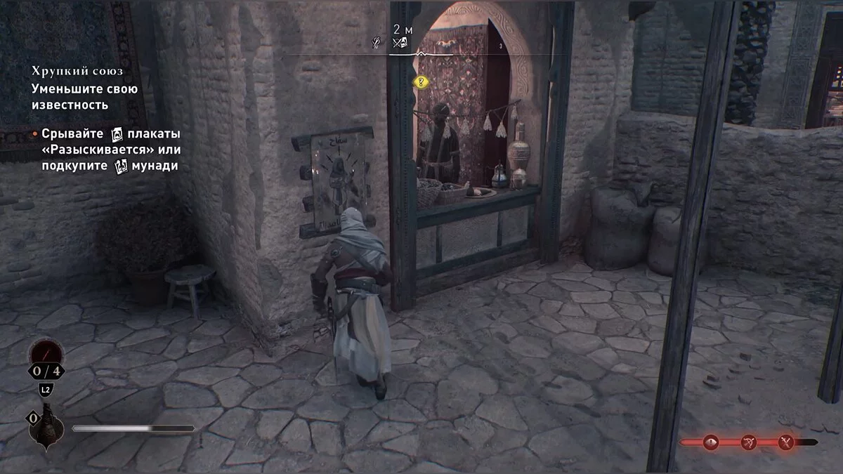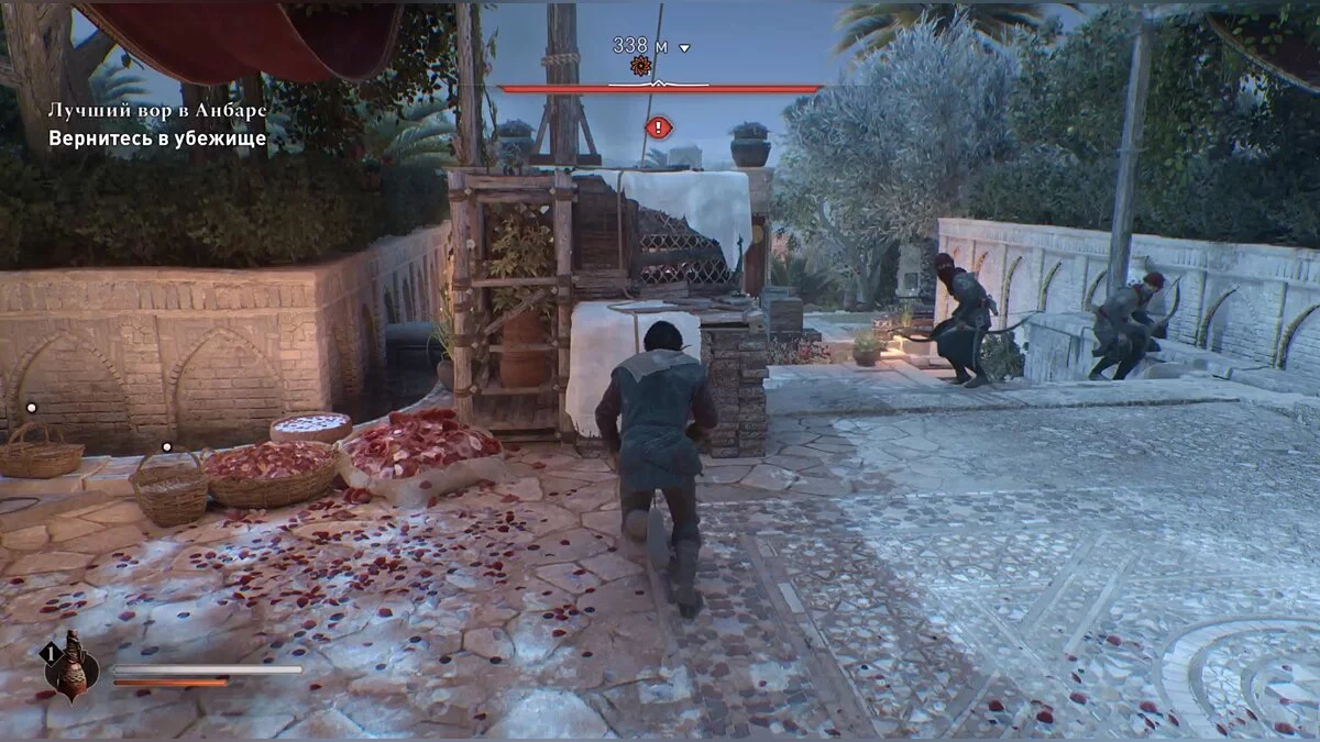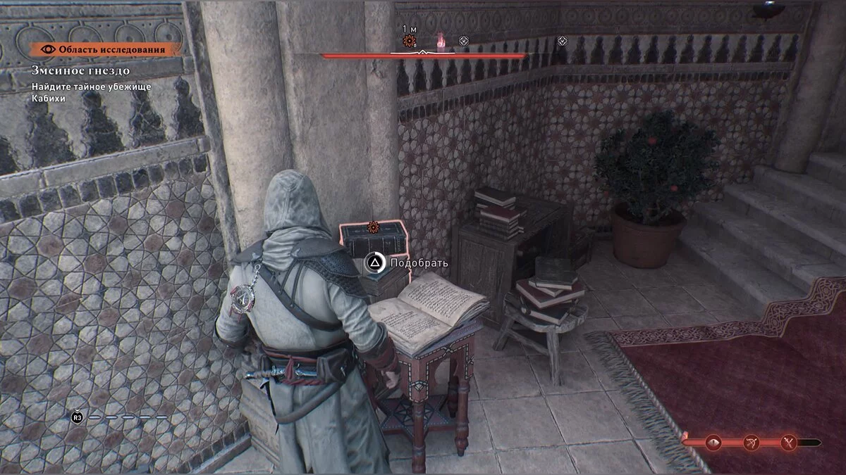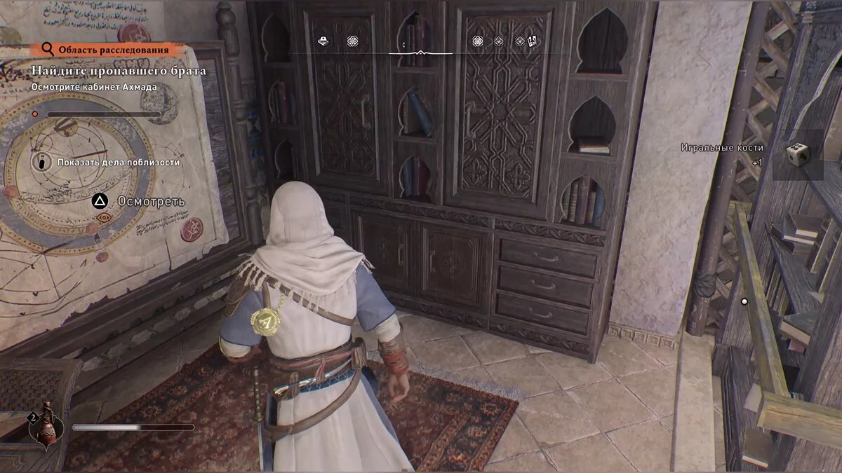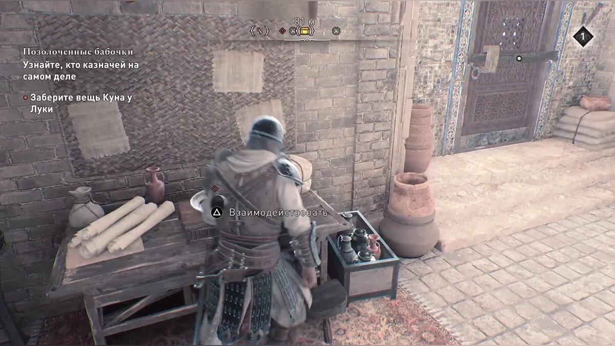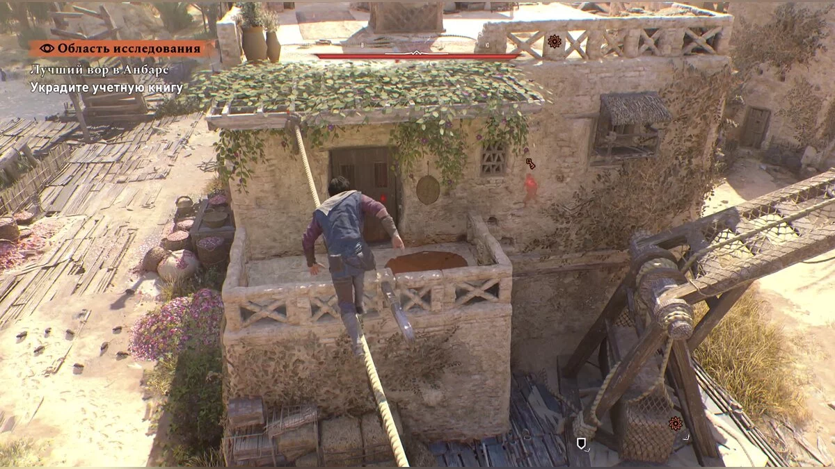 Используя орлиное зрение, найдите мешок с деньгами, оставленный купцом. Далее следуйте за Нихаль, пока она не найдет еще одну цель для кражи. Освойте эту механику и двигайтесь к Дервишу. Снова посмотрите кат-сцену и двигайтесь на склад за учетной книгой.