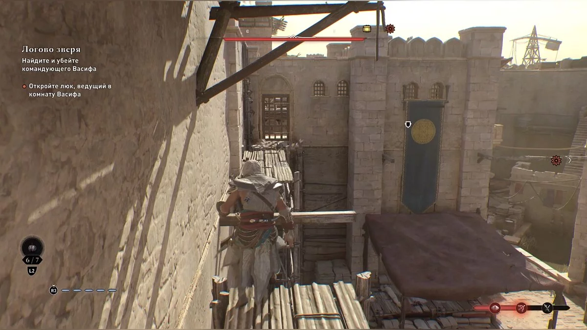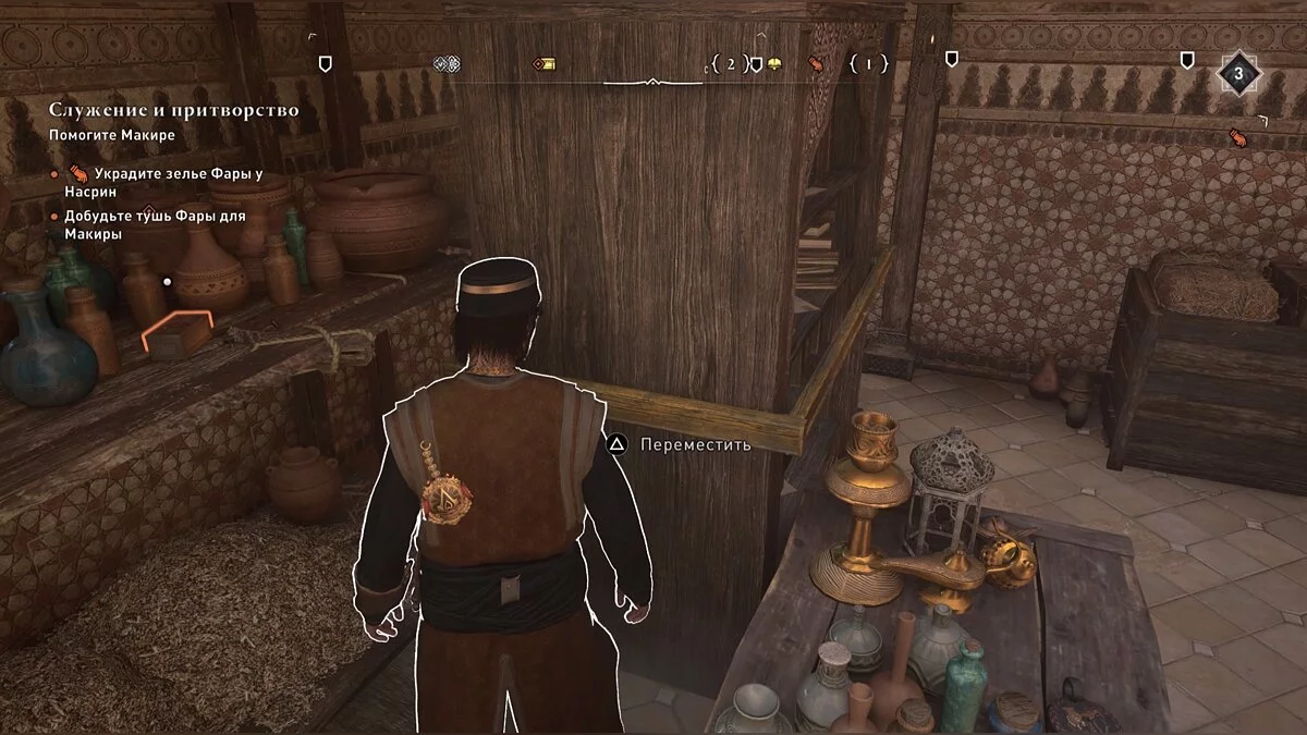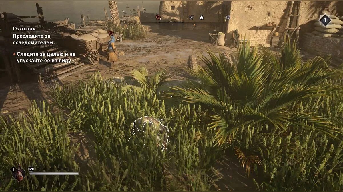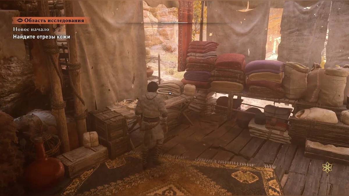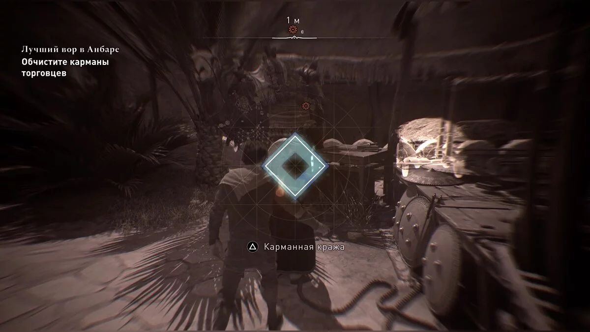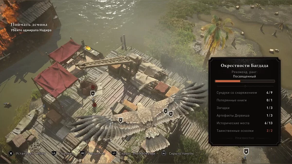 Используя орлиное зрение, найдите мешок с деньгами, оставленный купцом. Далее следуйте за Нихаль, пока она не найдет еще одну цель для кражи. Освойте эту механику и двигайтесь к Дервишу. Снова посмотрите кат-сцену и двигайтесь на склад за учетной книгой.