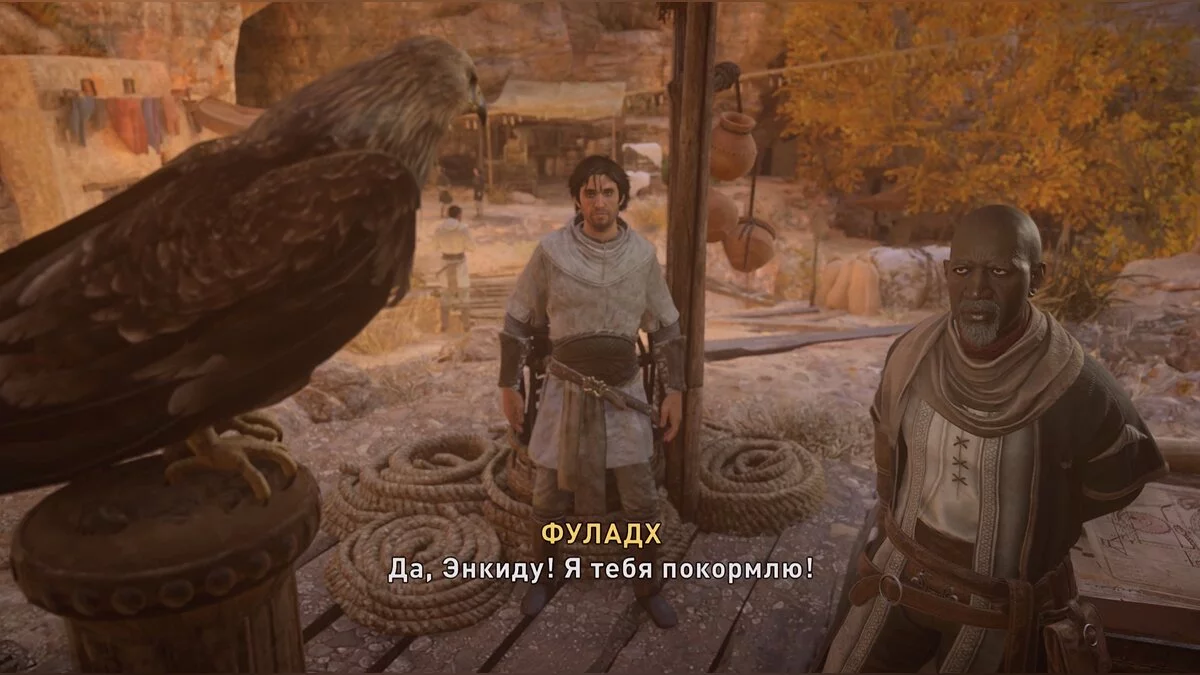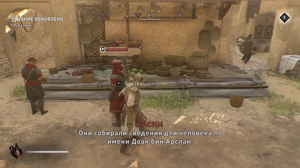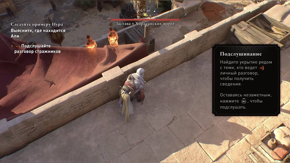 Вместе с учителем Басим приедет к караван-сараю. Ваша цель находится внутри, однако ее нужно выманить. Входы охраняют стражники, поэтому нужно придумать, как попасть внутрь. Используйте орла, чтобы отметить места для отвлечения внимания. Их два — перед входом стоит торговец и просит вернуть ему товар, внутри караван-сарая работник недоволен тем, что его и других мастеров используют как рабскую силу.