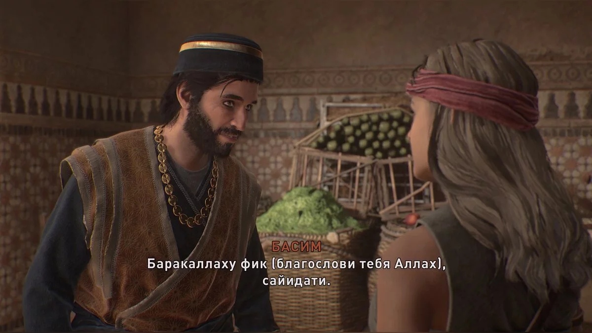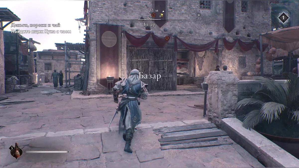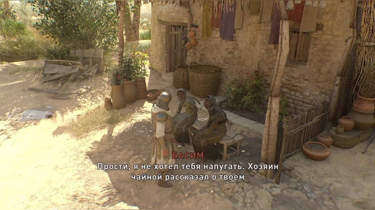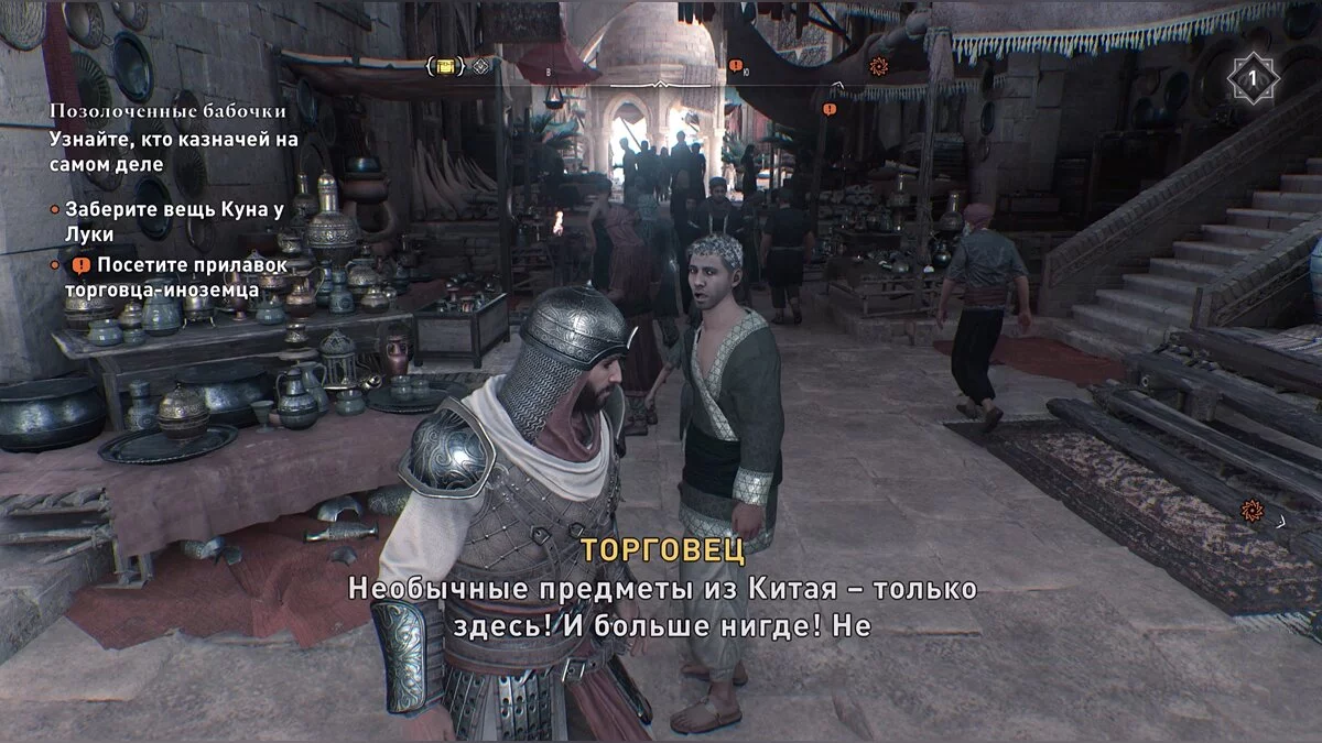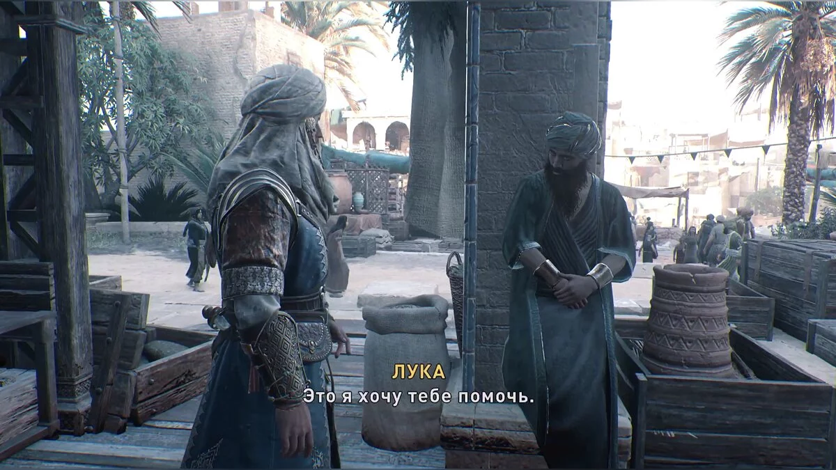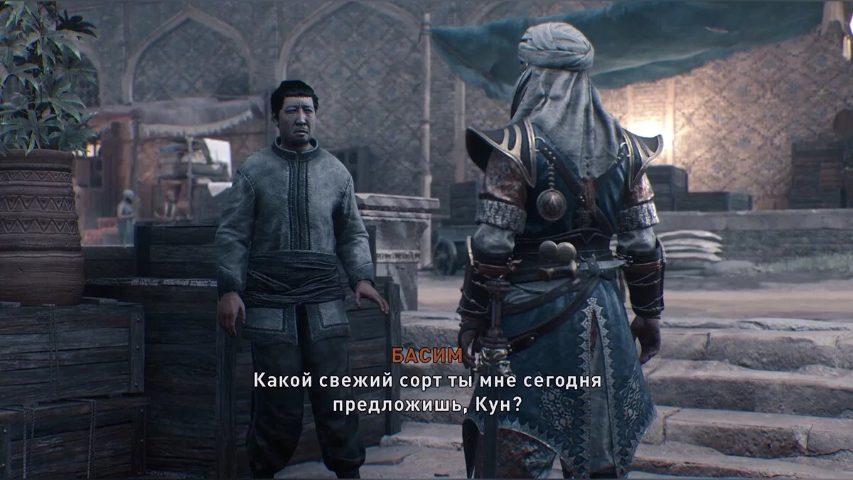 Приятеля Басима найти не составит труда. Пройдите базар насквозь и подойдите к маркеру цели, чтобы услышать конфликт Куна с Лукой. Поговорите с Куном. Ему нужно вернуть ящик с чаем.