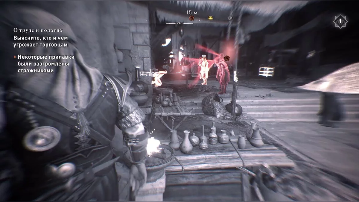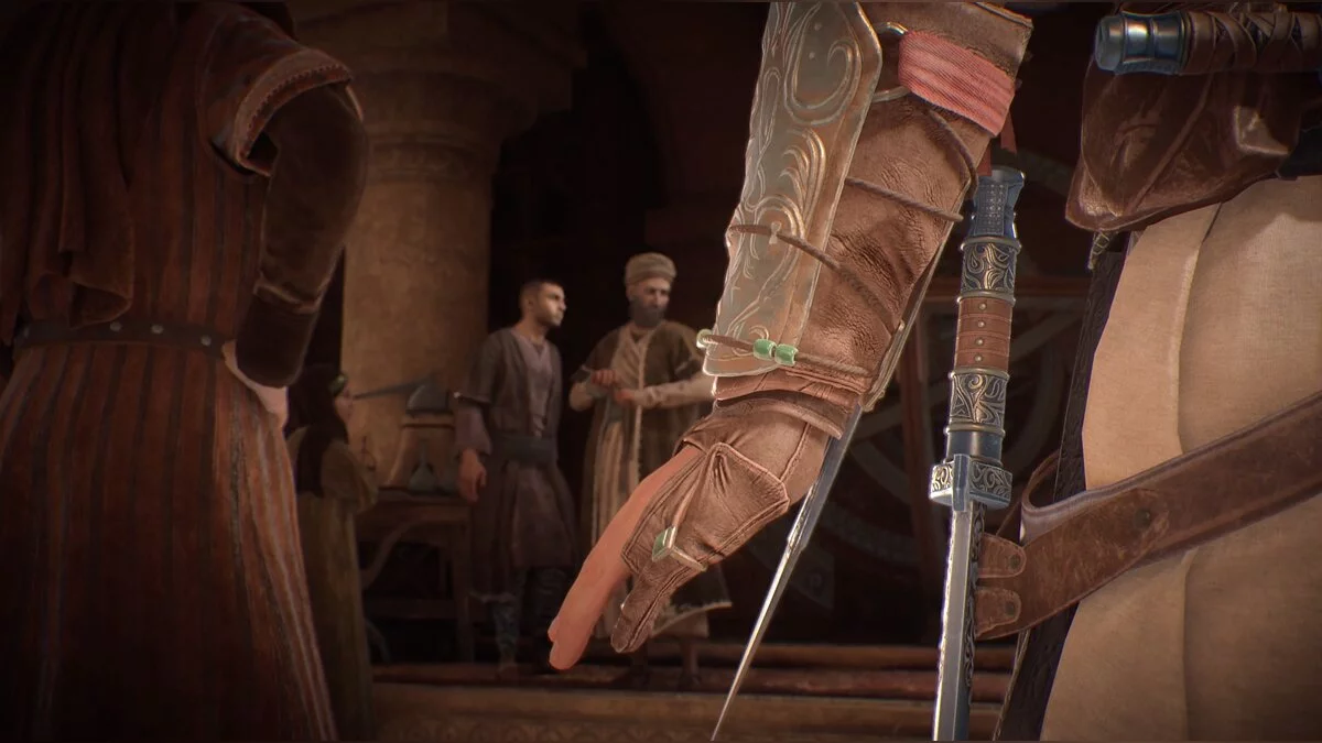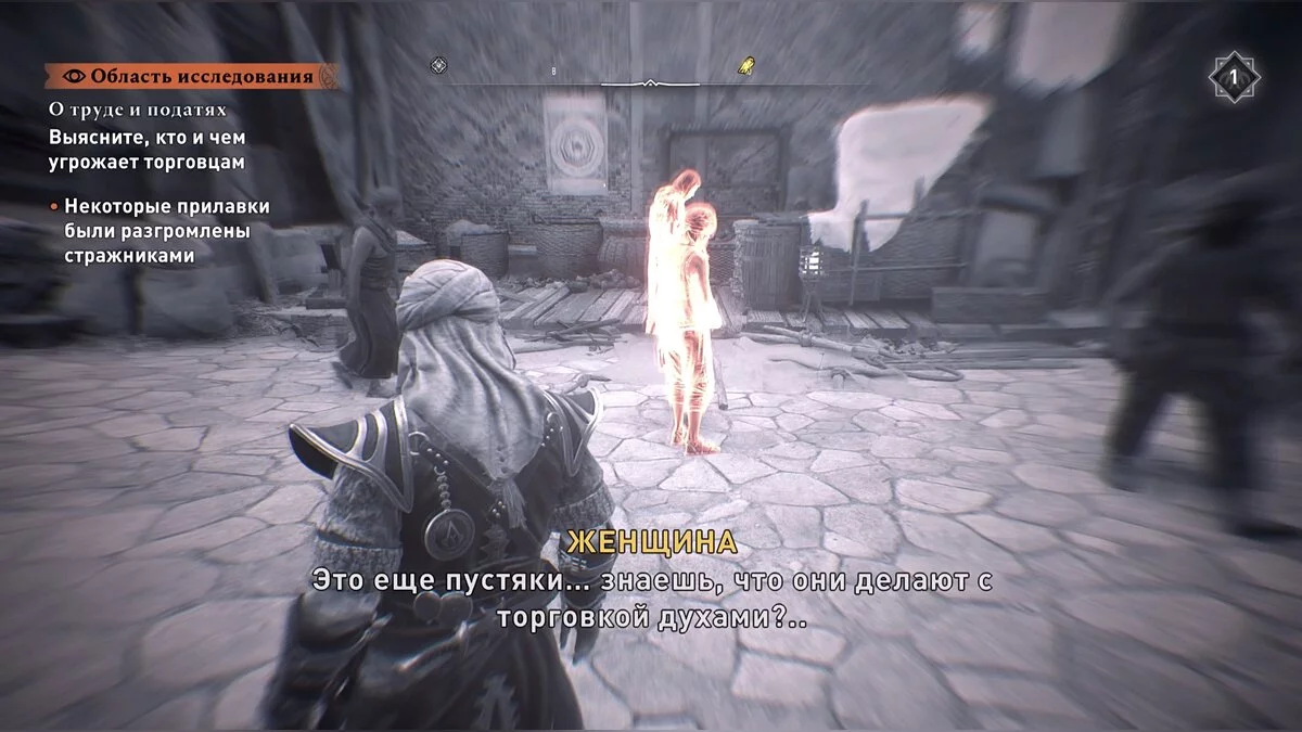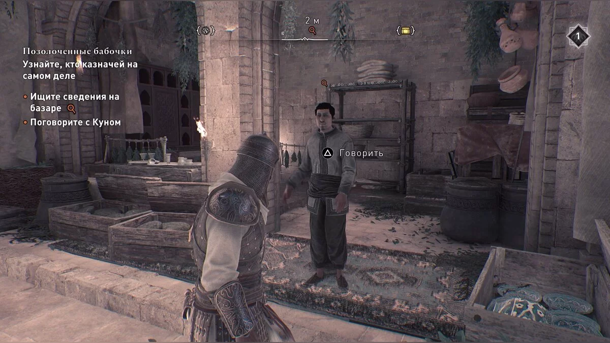 На базаре можно проверить вторую зацепку, полученную от ассасинов. Отправляйтесь к точке и используйте орлиное зрение. Группа торговцев стоит слева от вас. Еще одна группа будет по прямой. В обоих случаях нужно просто послушать.