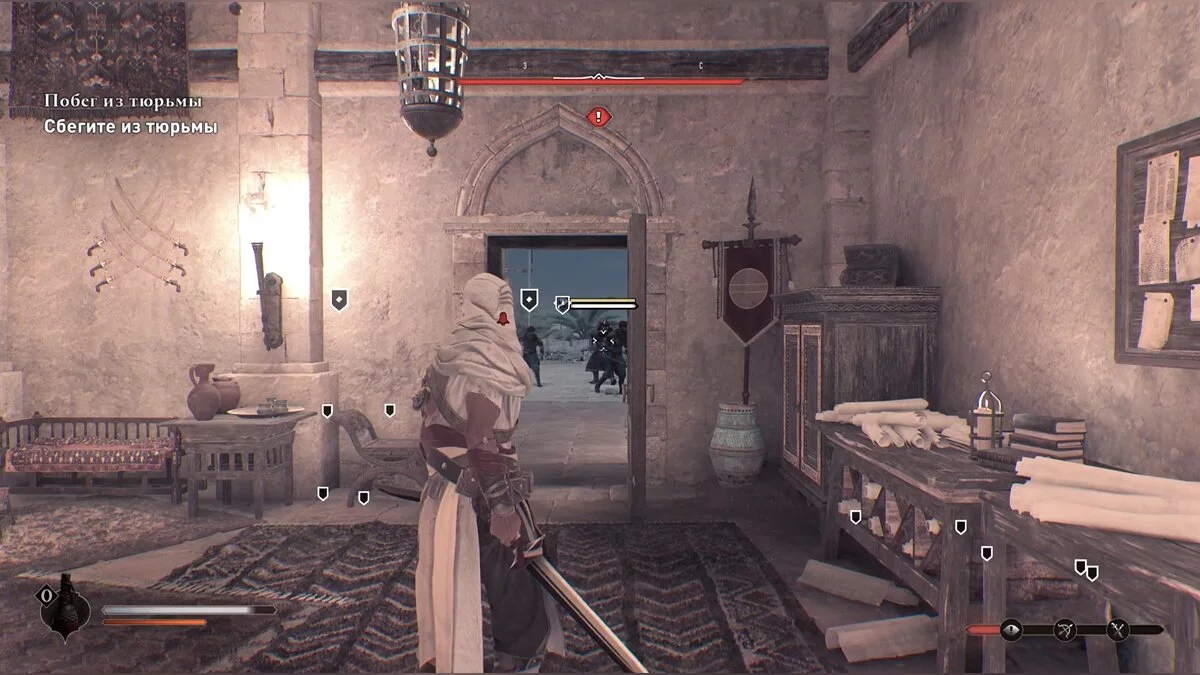 Теперь придется поискать списки заключенных. Они на первом этаже на противоположной стороне от вас. Напрямик лучше не идти, внизу много охраны. Проберитесь по стене заставы, аккуратно устраняя стражников по одному. Проникнув в комнату, заберите книгу и возвращайтесь в контору. Вы знаете месторасположение Али и можете его спасти. Прежде чем приступать, улучшите у ассасинов свои гаджеты, а также изучите ковер с контрактами.
