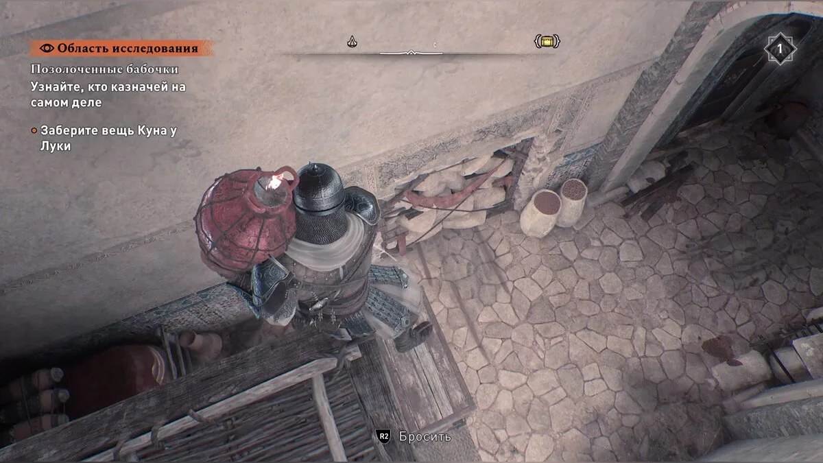 Теперь можно подвинуть стеллаж в другую комнату к сетке на стене, а затем направо, к деревянному каркасу. Заберитесь по нему наверх. Подберите блюдце и возвращайтесь к Куну. Вы получите всю информацию, чтобы опознать казначея, пора двигаться на Торги.