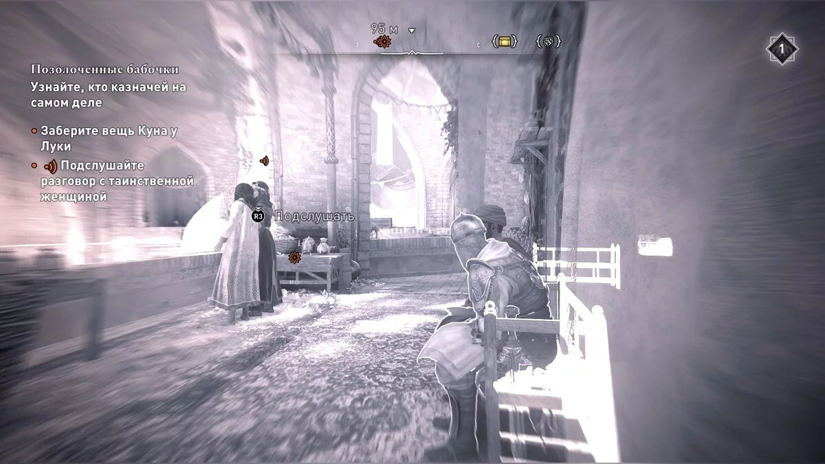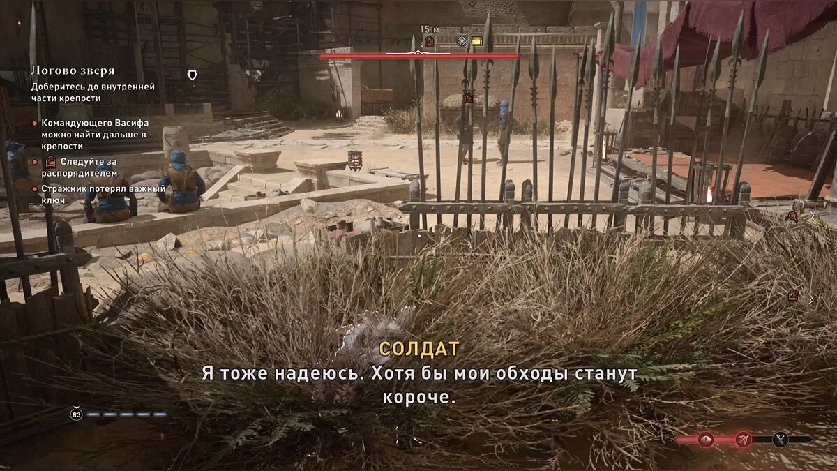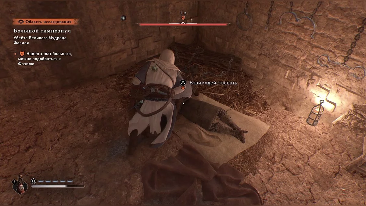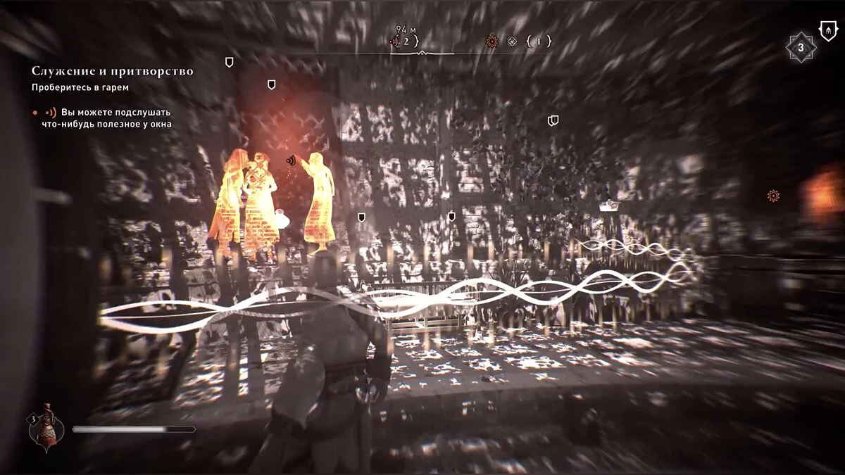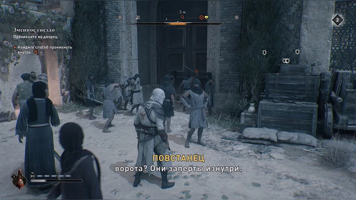Предводитель повстанцев в тюрьме, но непонятно, какой именно. Отправляйтесь на точку в Заставу у Хорасанских ворот, чтобы подслушать диалог стражников. Лучше заходить с крыши, там есть удобный проход на территорию. Чтобы подслушать, вы должны либо спрятаться, либо слиться с окружением. В этом конкретном случае рядом с охранниками есть стог сена, прыгните в него и сконцентрируйтесь, чтобы разобрать слова.