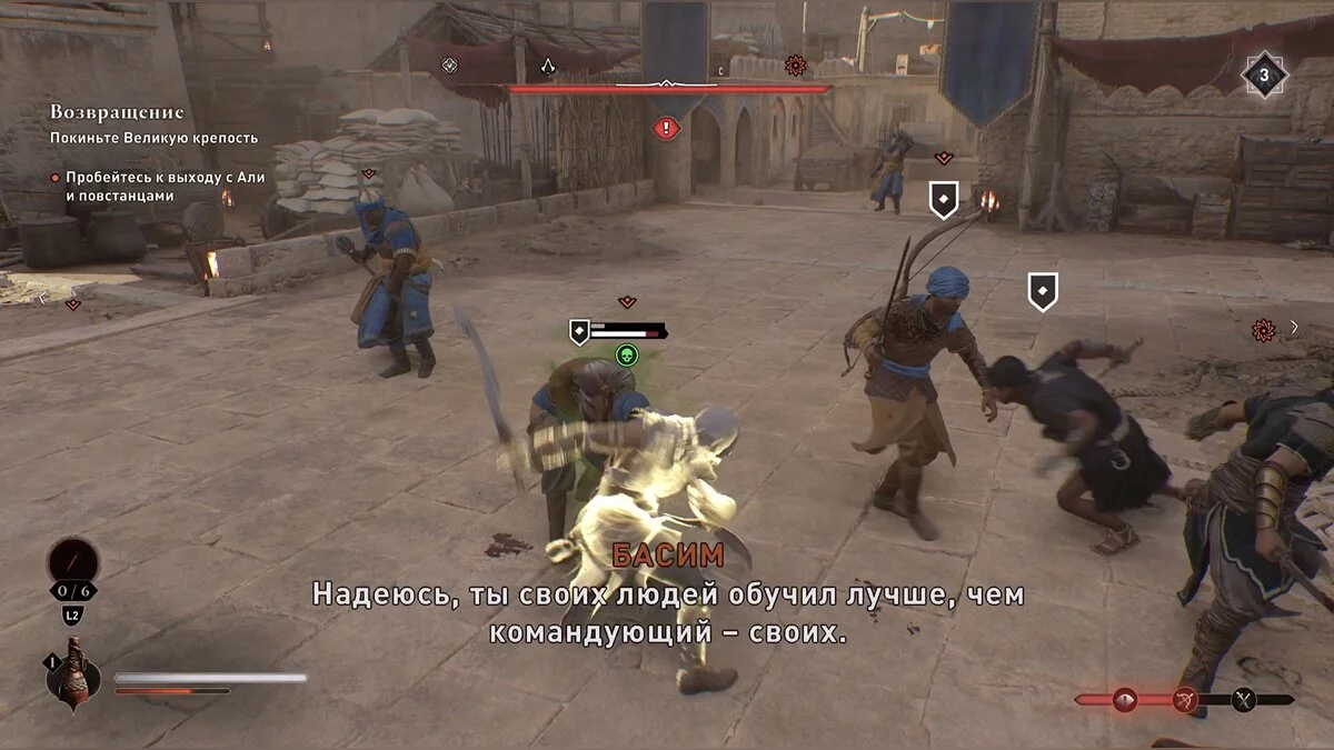 Спустившись, вы попадете к Васифу. Метка черепа показывает, откуда проще всего его убить, однако вы можете попробовать любой другой способ. После победы пробивайтесь с Али и повстанцами к выходу.