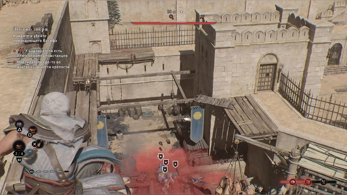 Пройти вы можете несколькими способами, но в любом случае сначала используйте орла. Он покажет, где находятся пленники, а также отметит всех врагов. Лучше действовать скрытно, но не обязательно. Не забывайте применять орлиное зрение. Так вы увидите окружение, которое можно использовать. Например, можно ножом перерубить канат, который держит тяжелый груз над охранниками, или бросить нож в красный горшок, чтобы тот взорвался.