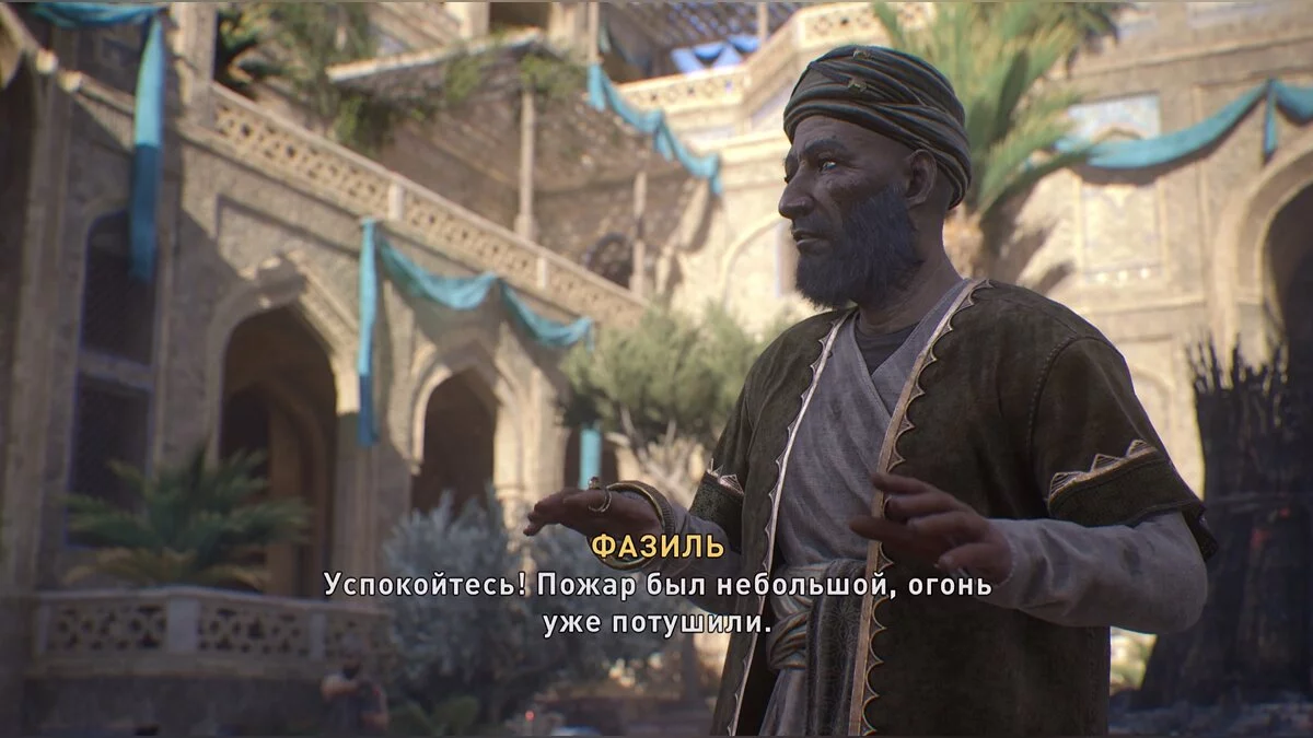 Отдав книгу, придется вернуть зелье назад Насрин — наложнице, у которой вы стащили флягу. После этого вы наконец-то попадете внутрь. Осмотрите все активные предметы и выходите на звук голосов. Посмотрите кат-сцену и выходите. Задание завершено.