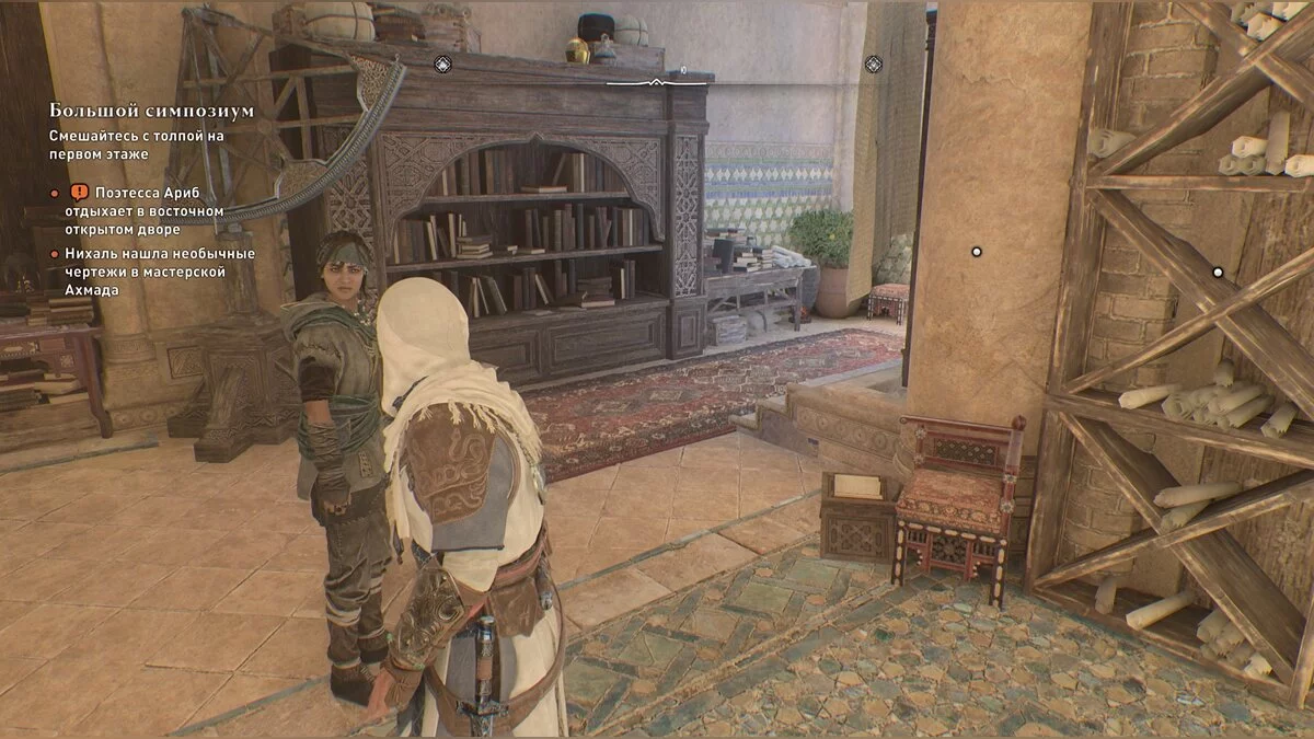 По дороге вы встретите Нихаль. Она хочет показать что-то интересное. Следуйте за девушкой в кабинет Ахмада и изучите свитки.