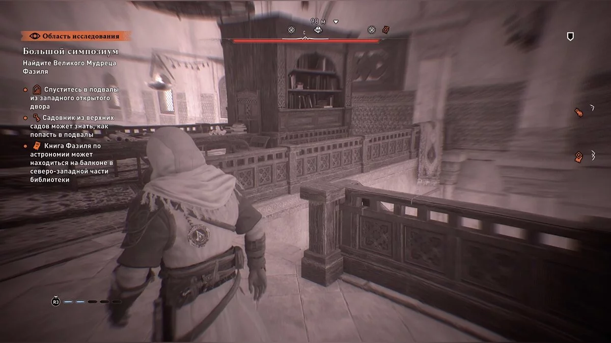 Идите за ним в помещение и попадете в охраняемую зону. Вам нужна книга — главный научный труд Мудреца. Для этого пройдите зону до конца. По ходу из документов вы узнаете, что нужный том — исследование по астрономии. Доберитесь до двери с засовом и пройдите в закрытую часть здания. Держитесь левой стены и сверните на балкон, когда появится проход. Там нужная книга. Получив вторую часть пароля, возвращайтесь к охраннику.