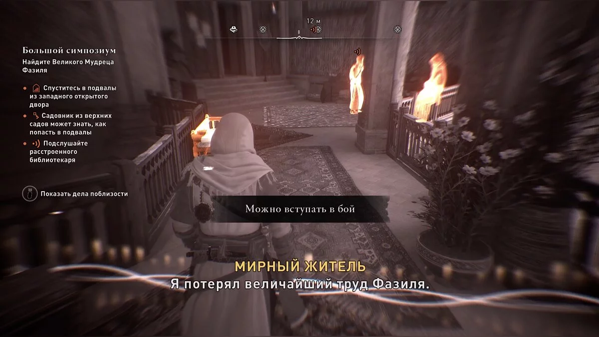 Поговорите с помощником Фазиля и подкупите его. Пройдите немного дальше и пообщайтесь с охранником, который не дает попасть в комнату. Вам нужно закончить кодовую фразу. В этом же зале лежит листок — прочитайте его. Поднимитесь на второй этаж и подслушайте расстроенного библиотекаря.