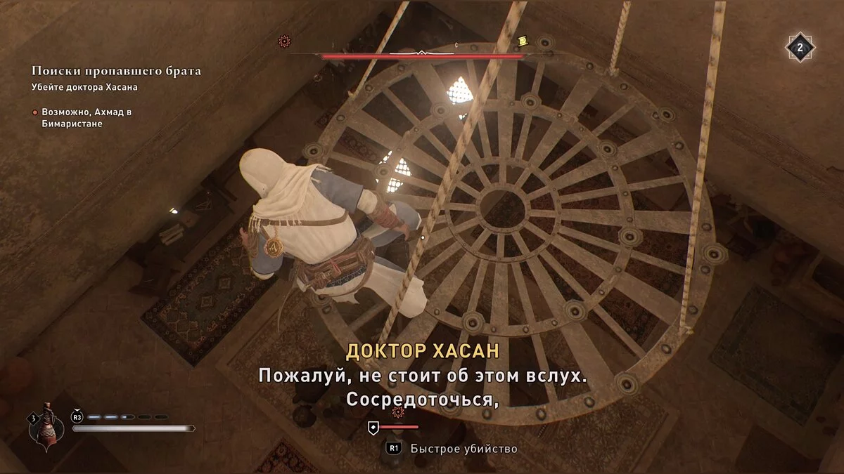 Заберитесь немного выше и беспрепятственно попадете внутрь. Убейте Хасана и поговорите с Ахмадом. Покиньте Бимаристан, чтобы выполнить квест.