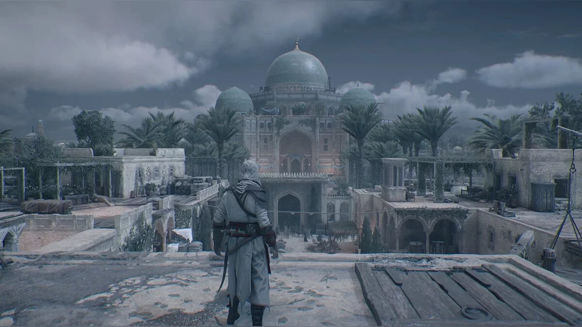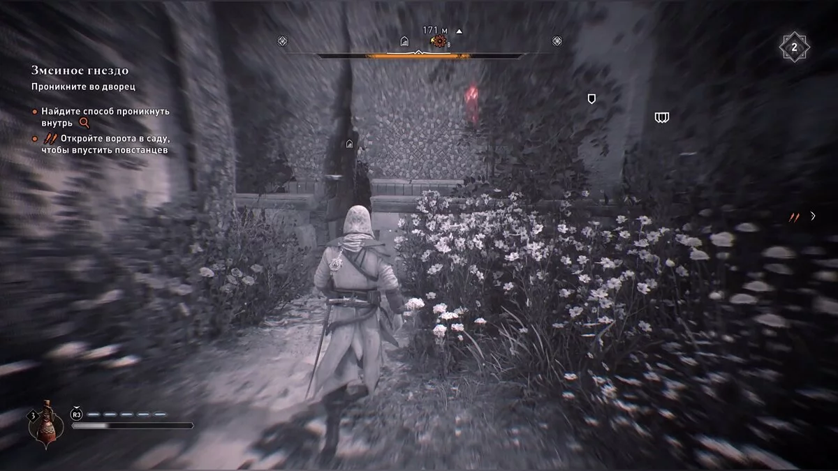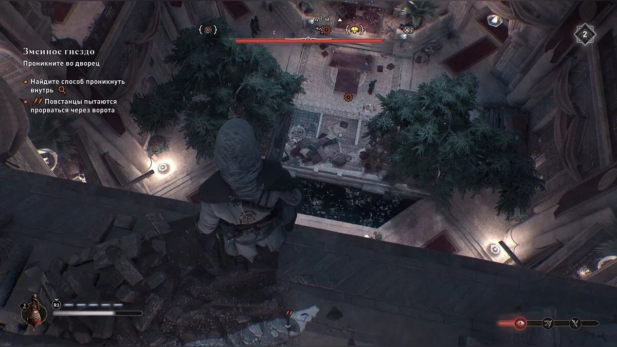 Оказавшись внутри, идите к воротам и впустите повстанцев. Начнется драка, но союзники вновь упрутся в закрытые двери. Осмотрите орлом территорию и найдите точку входа в здание. По строительным лесам заберитесь наверх к куполу. Обойдите зону, чтобы найти балкон, с которого можно спрыгнуть внутрь дворца. Сделайте это и откройте ворота.