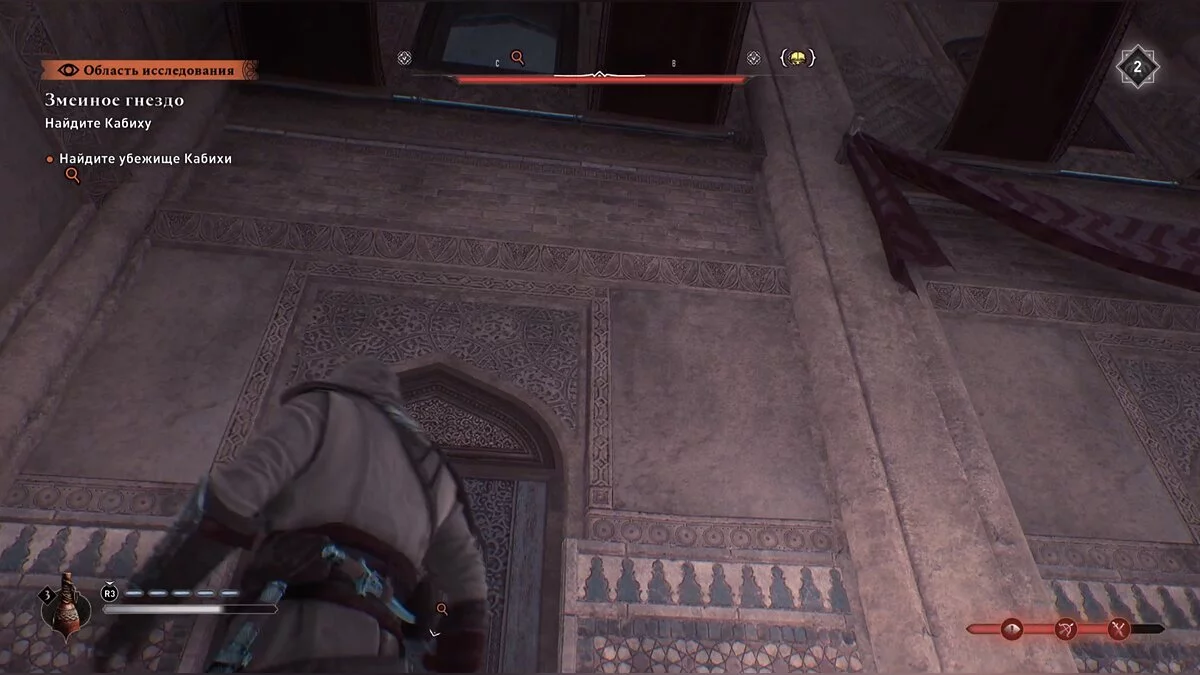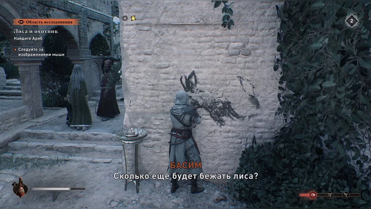 Басим передаст письмо, и Ариб отправится на встречу. Путь ей преградит покровитель с наемниками, убейте их. Когда дело будет сделано, поищите на стенах изображение мыши. Вам нужно двигаться по этим картинкам, чтобы обнаружить место встречи. Для удобства используйте орлиное зрение.