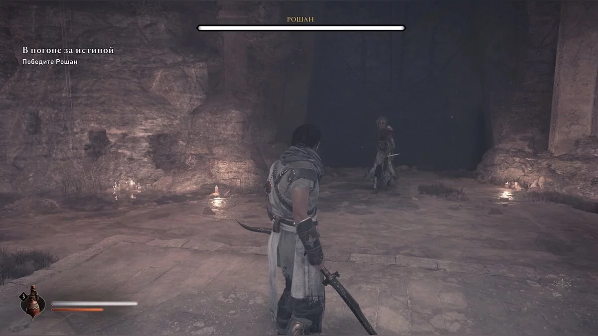 Как только Басим прикоснется к стене, придет Рошан, которая не хотела, чтобы молодой ассасин спускался в храм. Бой с ней довольно вялый, но это финальная схватка. В начале Рошан бросает в вас ножи. Их можно отбивать мечом.
