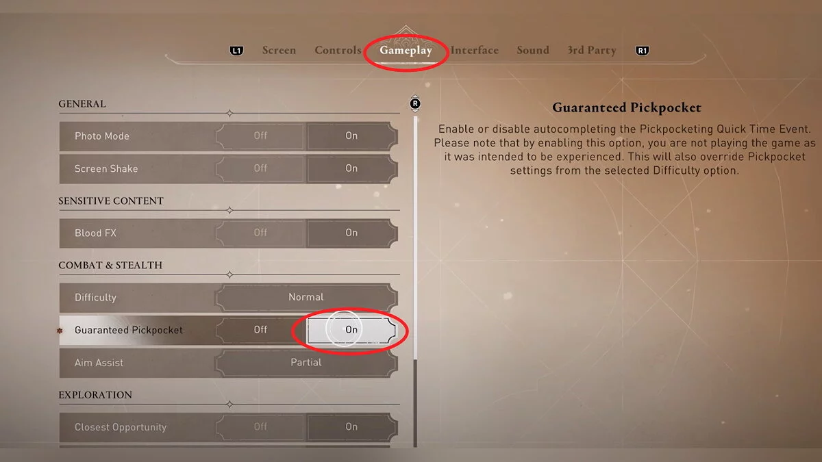 Если вы хотите избежать этой рутины, откройте меню Настроек (Options), найдите пункт «Игровой процесс» (Gameplay) и включите «Гарантированные карманные кражи» (Guaranteed Pickpocket). В этом случае все ваши попытки воровства окажутся удачными. Способ можно считать узаконенным читерством, но он позволит ускорить процесс заработка денег.
