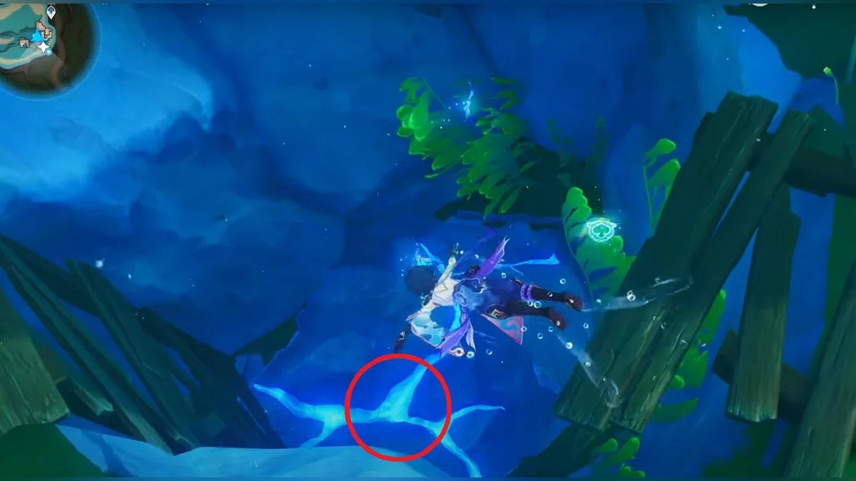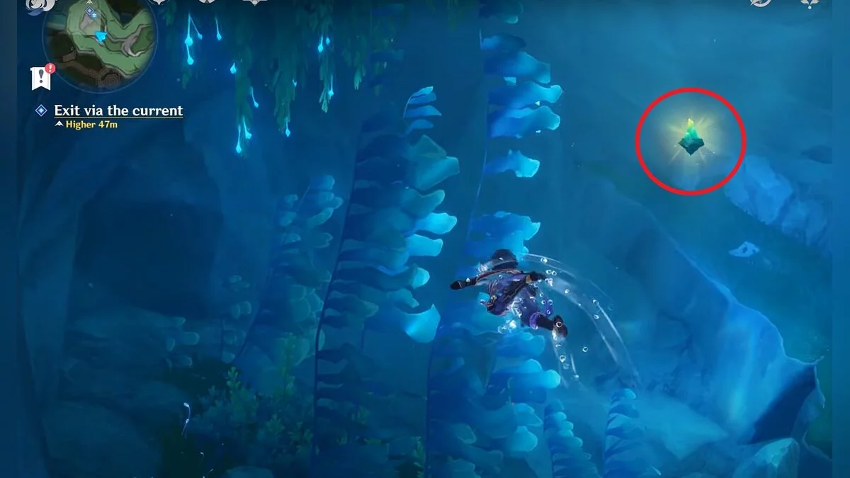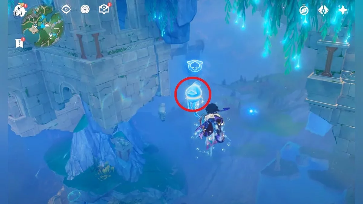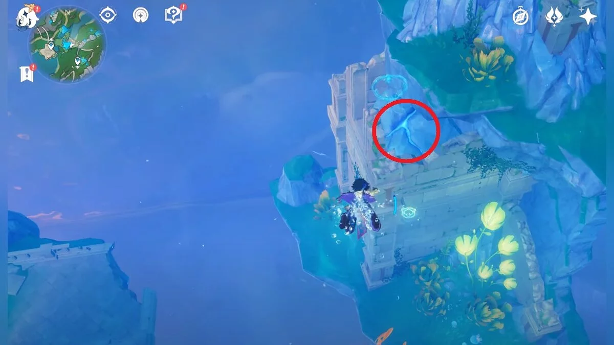 От телепорта плывите на восток. Воспользуйтесь медузой, чтобы расколоть камни в затопленном здании и заберите последний кусок таинственной руды.