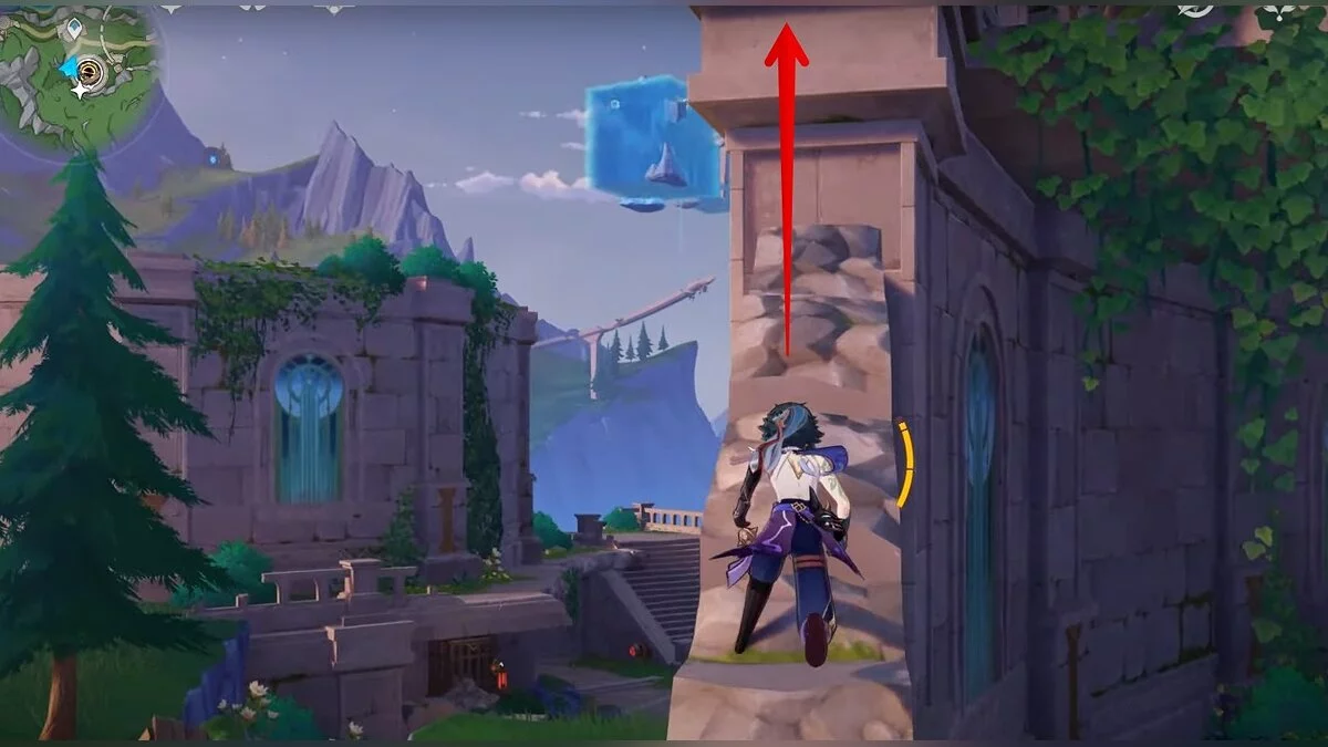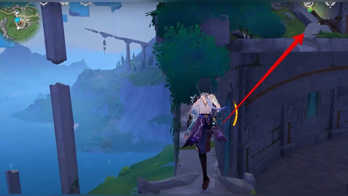Забирайтесь на статую. Кусок руды находится на ней. При желании можно забраться на ближайший утёс и спланировать вниз.