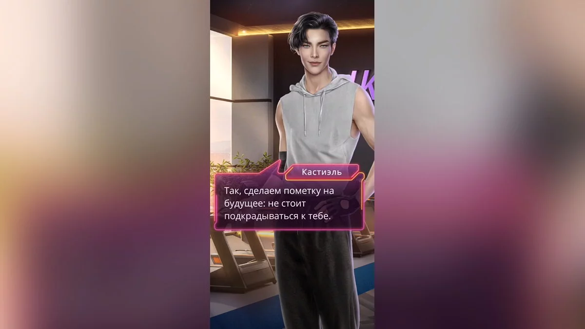 Заниматься спортом после долгого перерыва не просто. Но вы заставили себя встать на беговую дорожку. Кастиэль окликнут вашу героиню, из-за чего вы чуть не упали. К счастью, парень сразу же пришёл на помощь. Впрочем, его действия, скорее раздражают, чем нравятся вам.