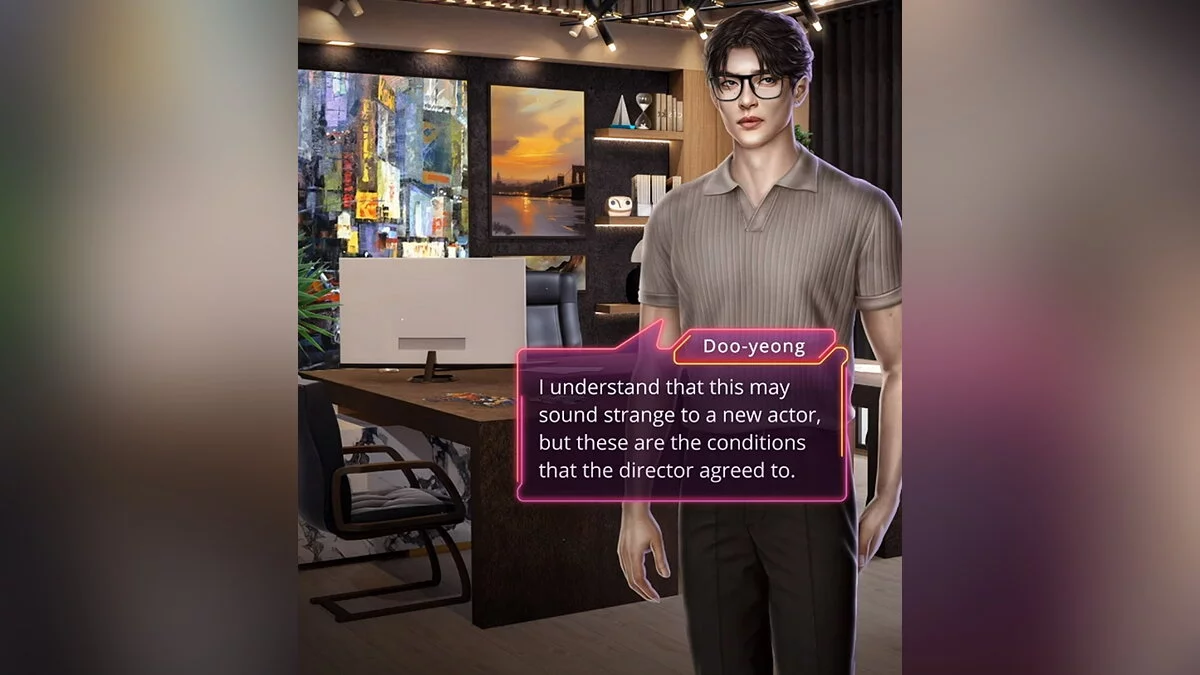 Во время поездки госпожа Пак сообщила, что вас ждет встреча с Туеном и его менеджером Чжоном. Вы заметили, что все немного взволнованы. Они готовы подписать контракт, который посвящен вашему участию в съемках дорамы.