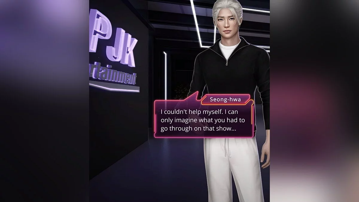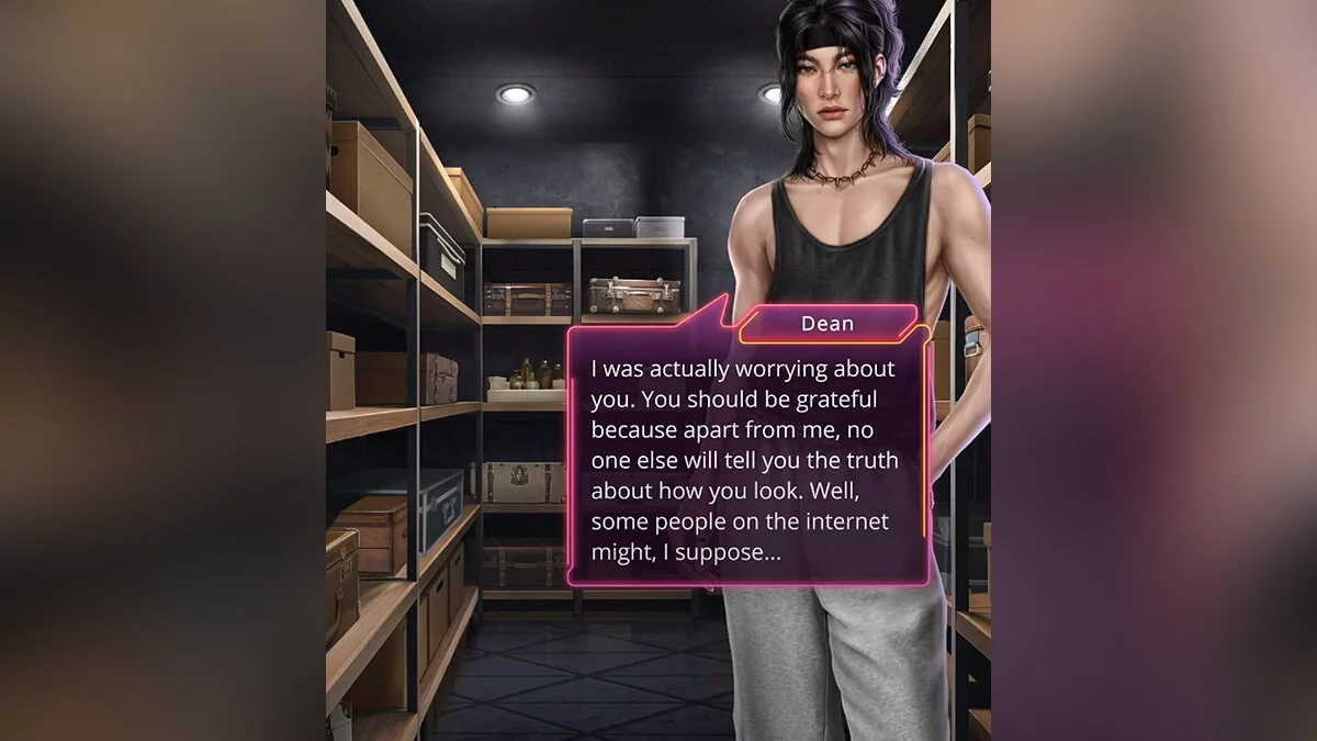 Вместе с Дином вы уединились в кладовке. Там парень смог насладиться горячим раменом. Заодно он поинтересовался, почему ваша героиня выглядит иначе. В процессе разговора Дин заявил, что знает много информации о том, что происходит за пределами агенства. И ему кажется, что вы в итоге плохо кончите. Из-за этого у вашей героини началась мигрень. Певец предложил помощь.