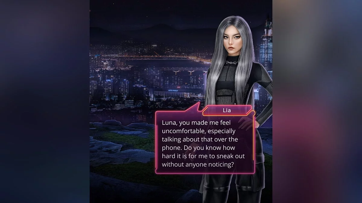Если вы согласились пересечься с Лией, она приедет к вам на мотоцикле. Вы отправитесь за пределы города, где вас никто не увидит и не услышит. Певица заявила, что хотела оградить вашу героиню от возможной опасности. По ее словам, Кас не может признаться, что был в том клубе, ведь это ухудшит его положение. Вы попросили рассказать о заведении, где была Союн.