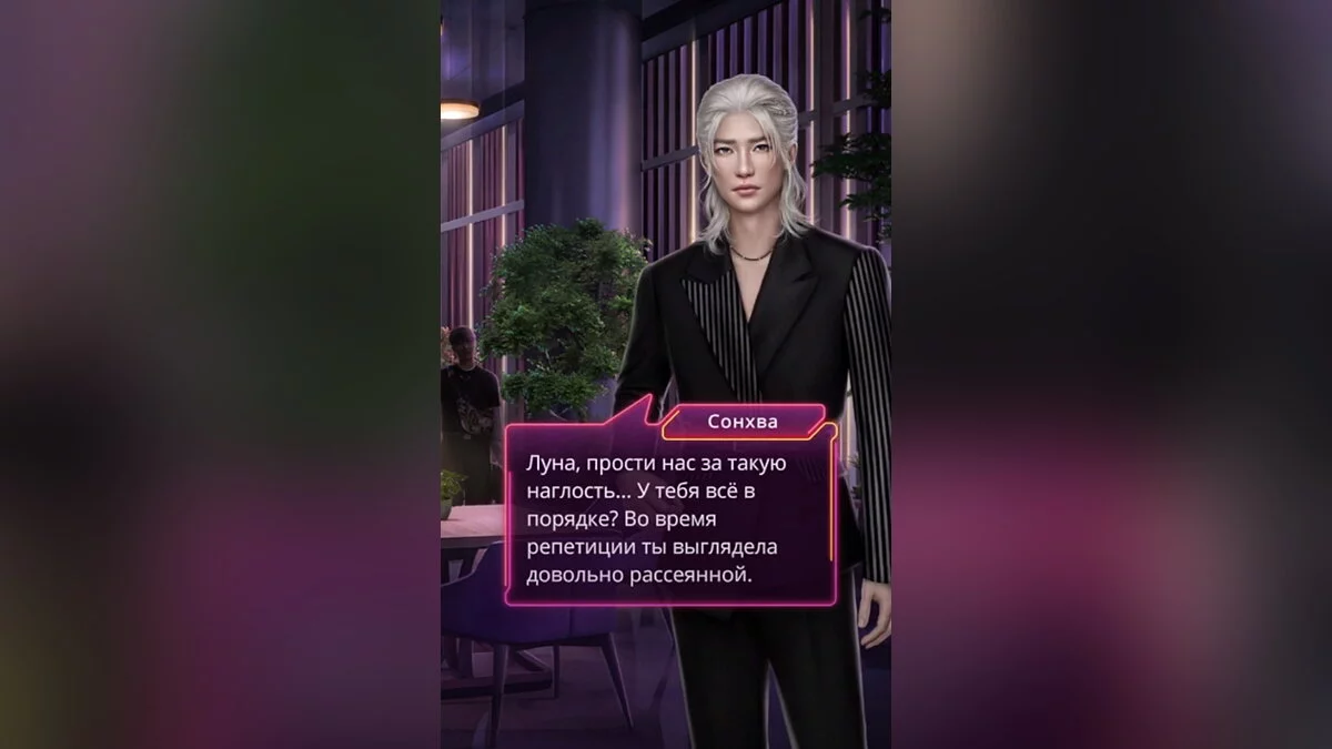 Во время перерыва вы отправились в кафе, чтобы перекусить и побыть одной. Однако поесть в одиночестве не получилось — к вам подошли Сонхва и Дин. Они посмеялись над тем, что испугали вас. Ваша героиня не ожидала увидеть парней, ведь певцы должны быть в агентстве. Оказывается, они приехали пораньше, чтобы поработать над следующей песней. Оказывается, ребята подглядывали за вами во время репетиции. Сонхва поинтересовался, почему ваша героиня была такой рассеянной.