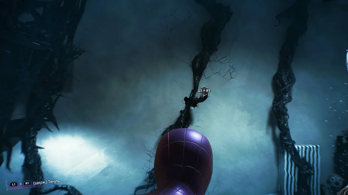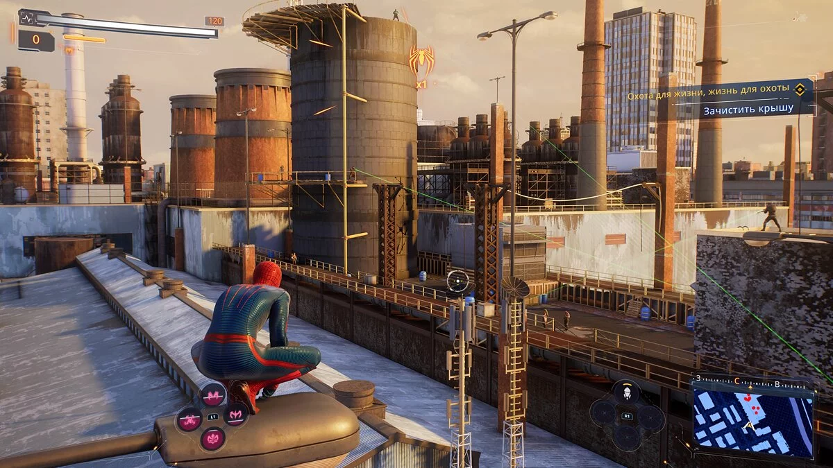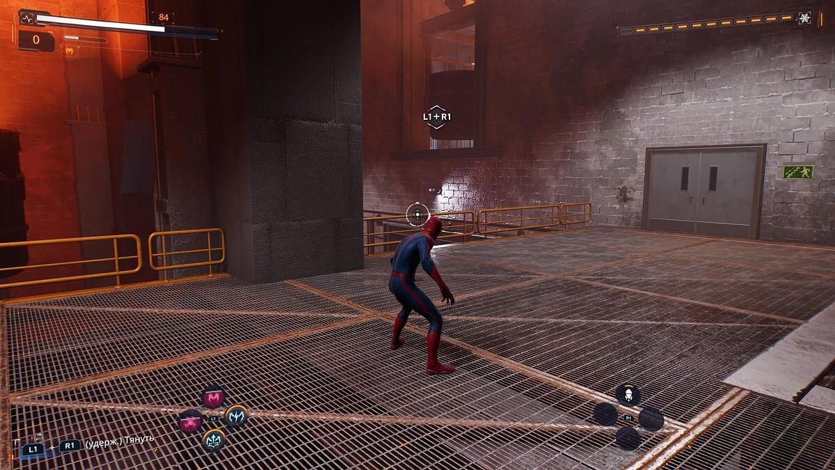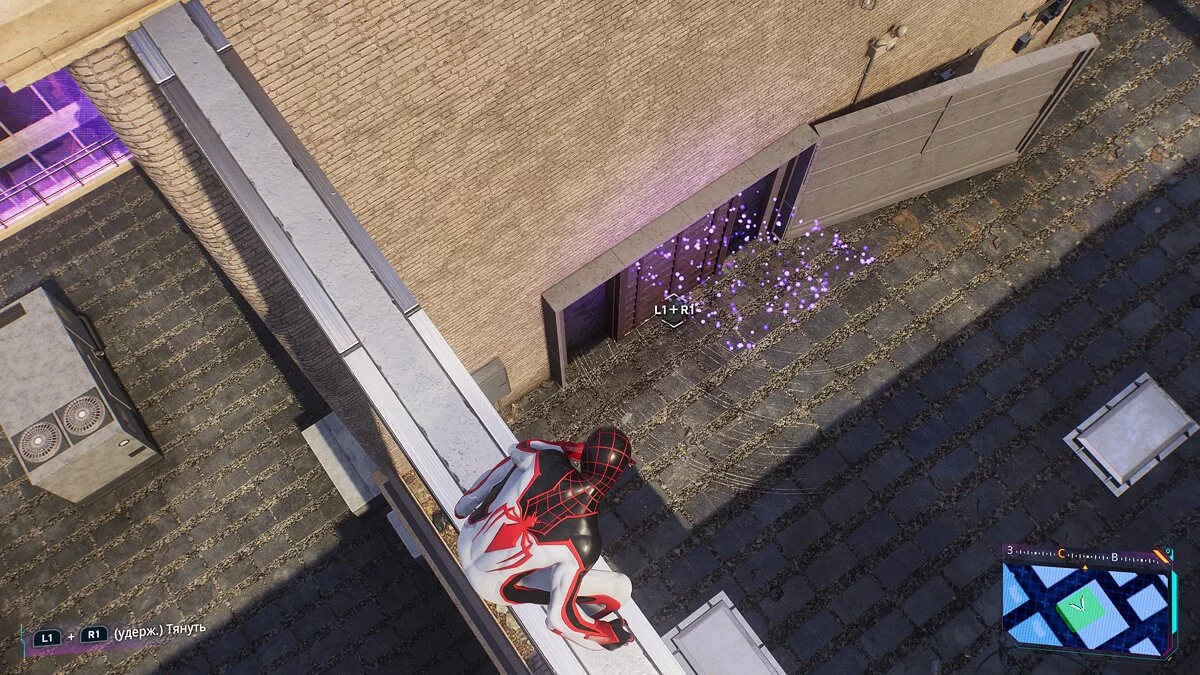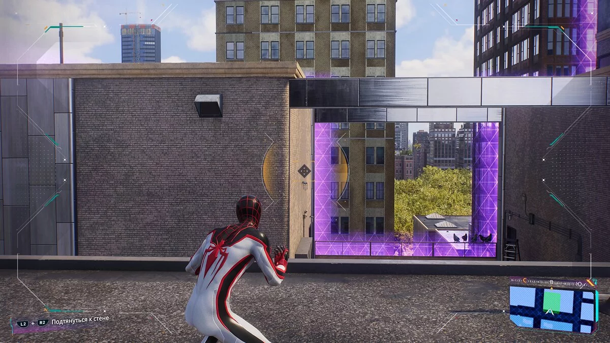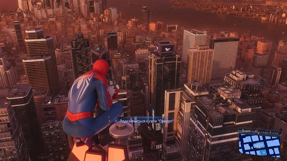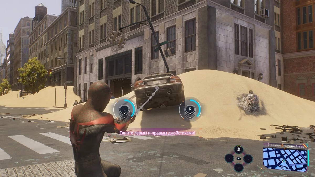 После вступительного ролика двигайтесь к указанной точке. Раскачивайтесь на паутине при помощи кнопки R2, затем отпускайте её, летите вперёд и снова нажимайте R2, чтобы зацепиться за здание паутиной. Если вы упали — ничего страшного. Совершите прыжок кнопкой «крестик» и зажимайте R2. По стенам небоскребов можно бежать как по земле, если нажать R2. Иными словами, механика полётов на паутине со времён первой части не изменилась.