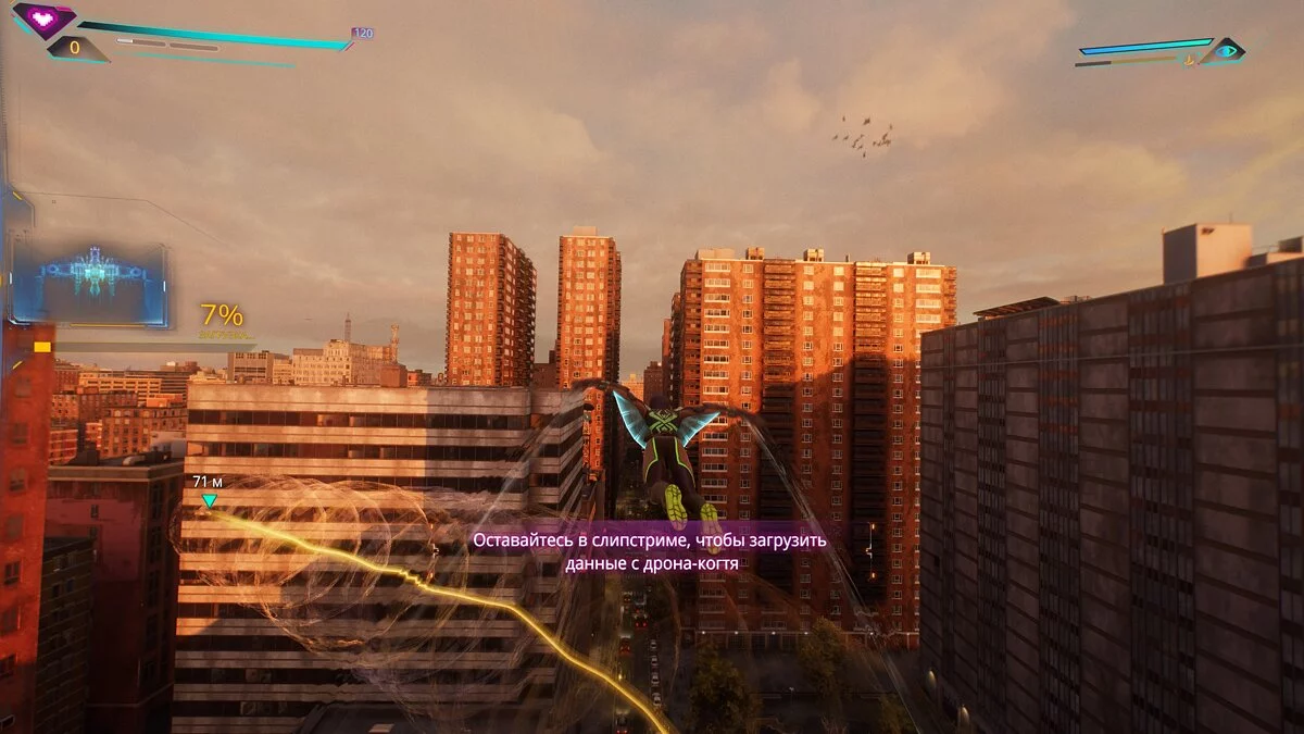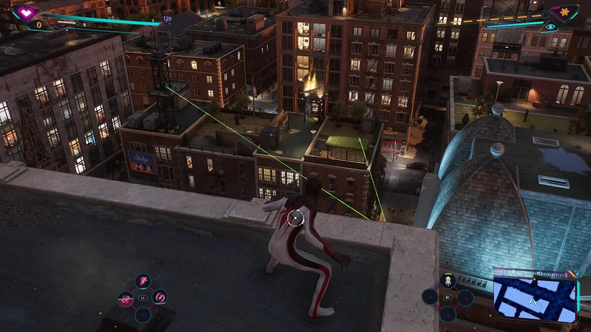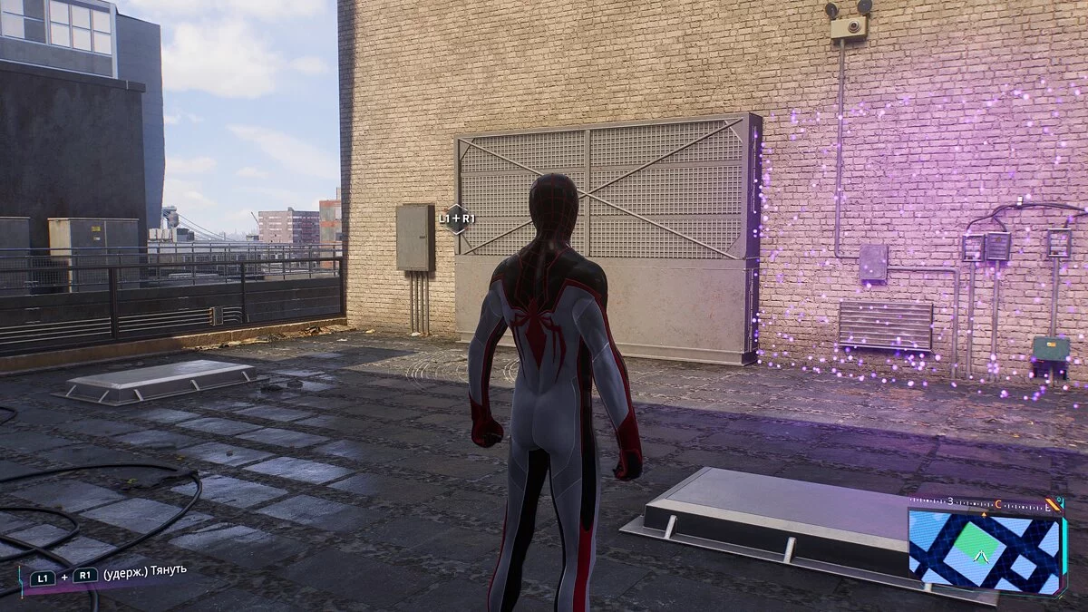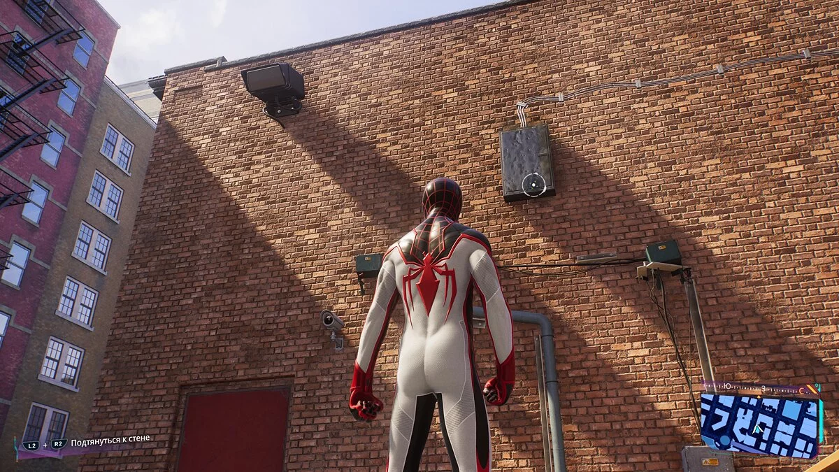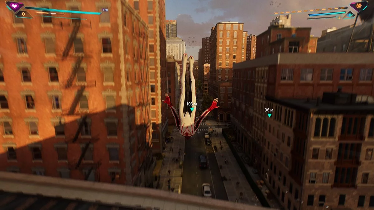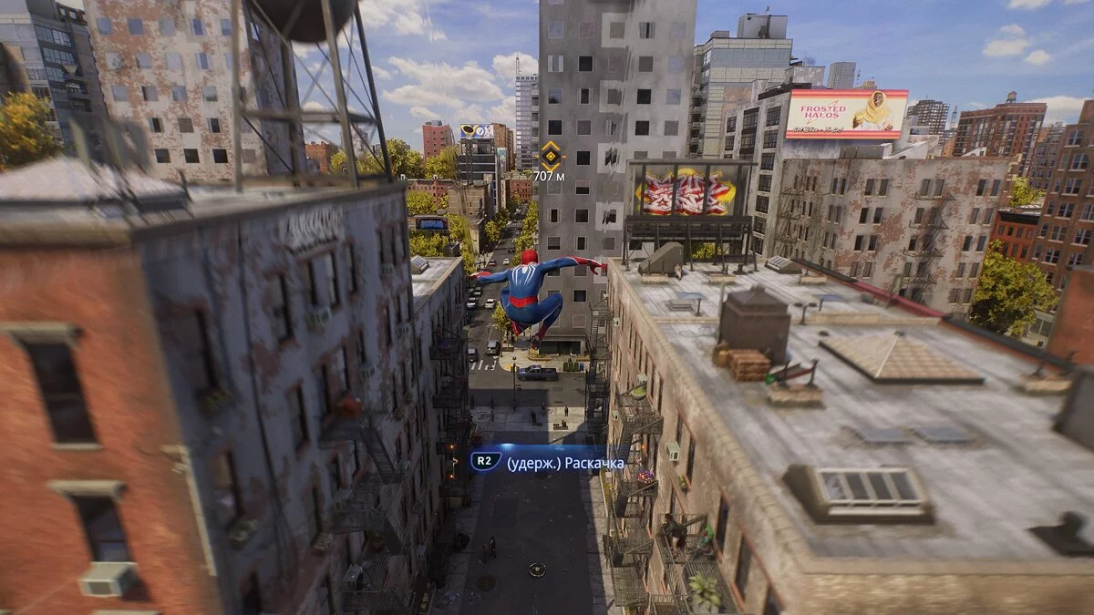 После вступительного ролика двигайтесь к указанной точке. Раскачивайтесь на паутине при помощи кнопки R2, затем отпускайте её, летите вперёд и снова нажимайте R2, чтобы зацепиться за здание паутиной. Если вы упали — ничего страшного. Совершите прыжок кнопкой «крестик» и зажимайте R2. По стенам небоскребов можно бежать как по земле, если нажать R2. Иными словами, механика полётов на паутине со времён первой части не изменилась.