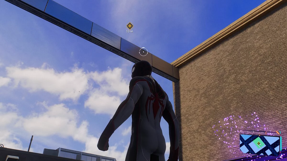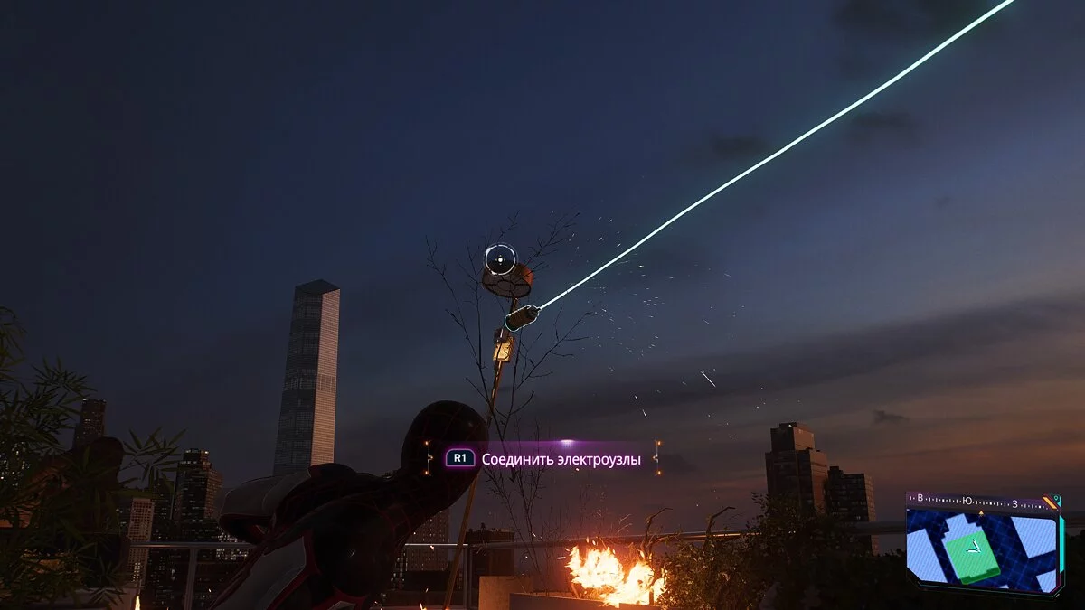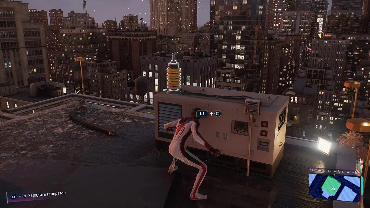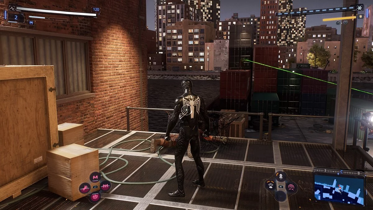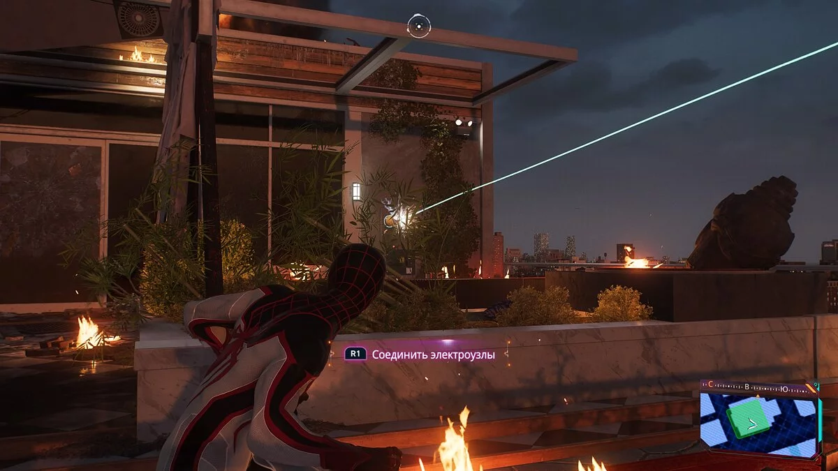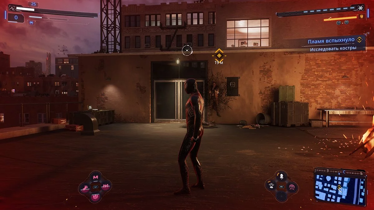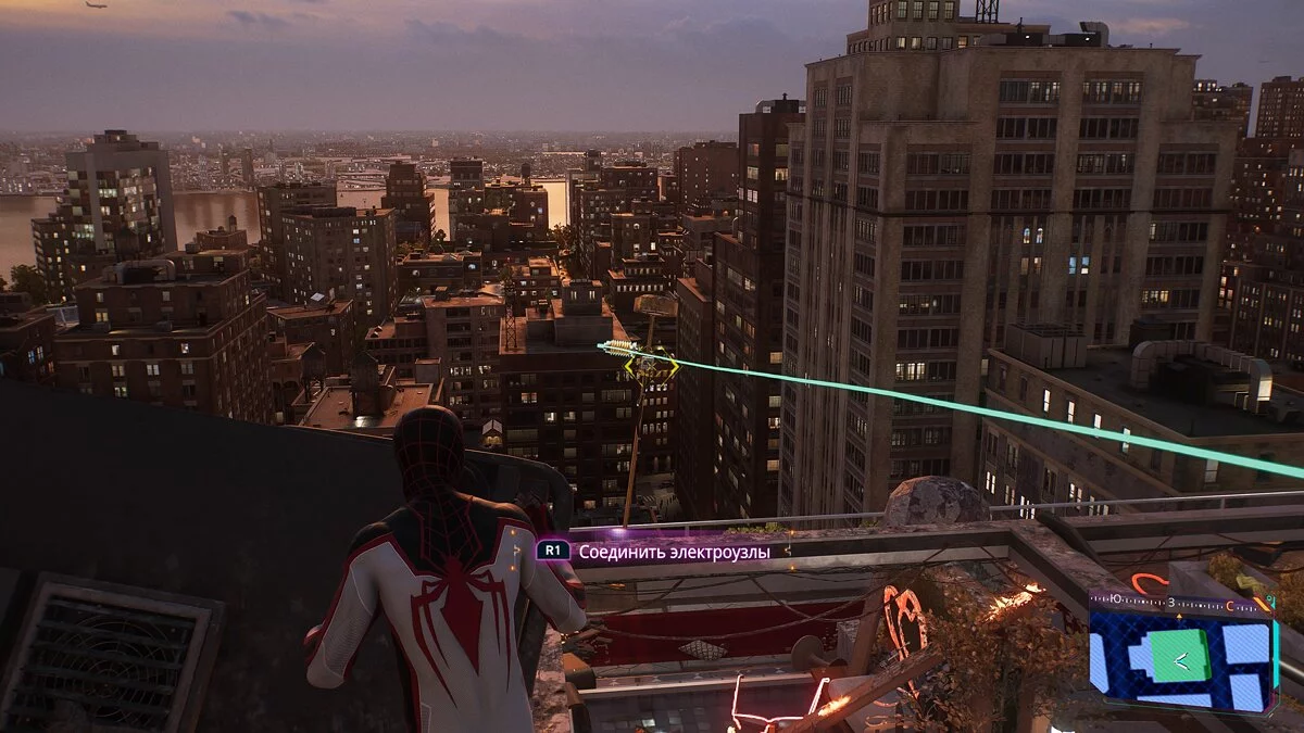 После вступительного ролика двигайтесь к указанной точке. Раскачивайтесь на паутине при помощи кнопки R2, затем отпускайте её, летите вперёд и снова нажимайте R2, чтобы зацепиться за здание паутиной. Если вы упали — ничего страшного. Совершите прыжок кнопкой «крестик» и зажимайте R2. По стенам небоскребов можно бежать как по земле, если нажать R2. Иными словами, механика полётов на паутине со времён первой части не изменилась.