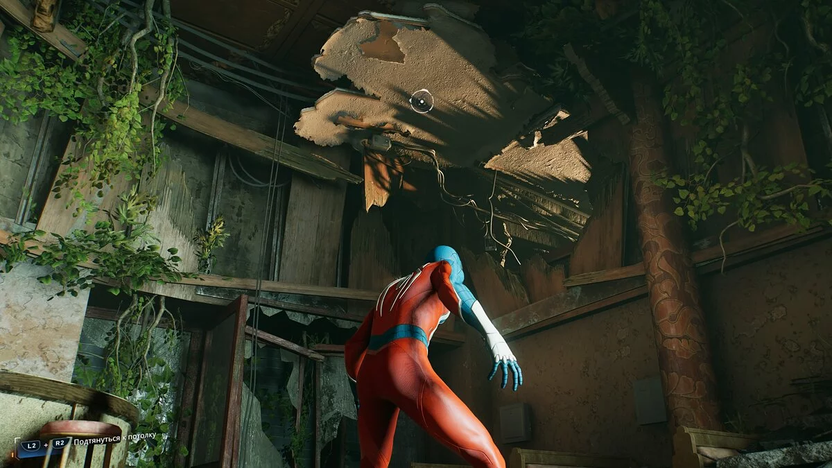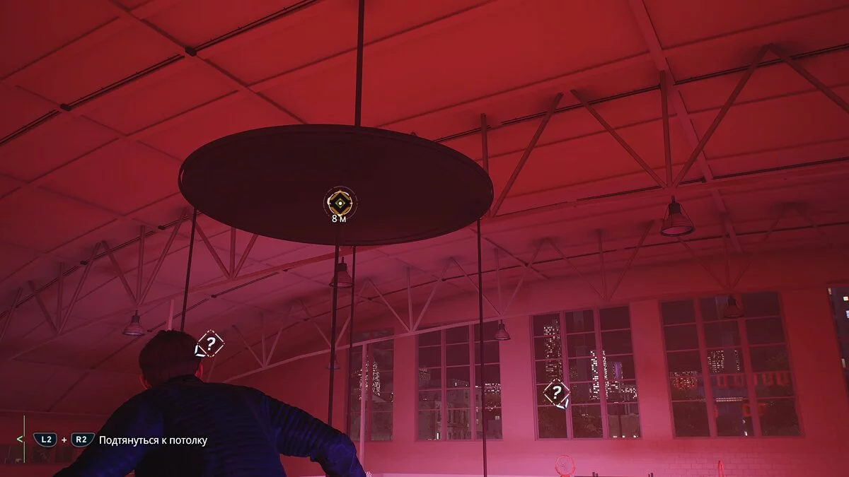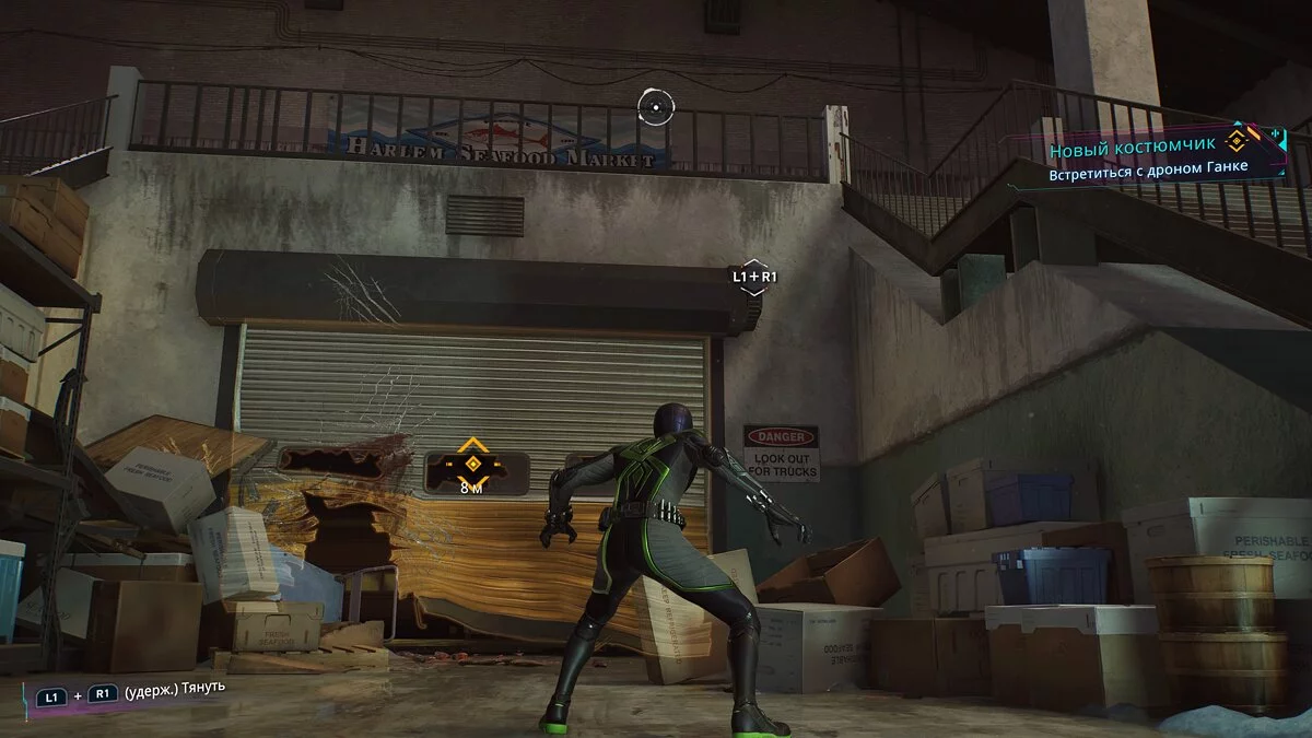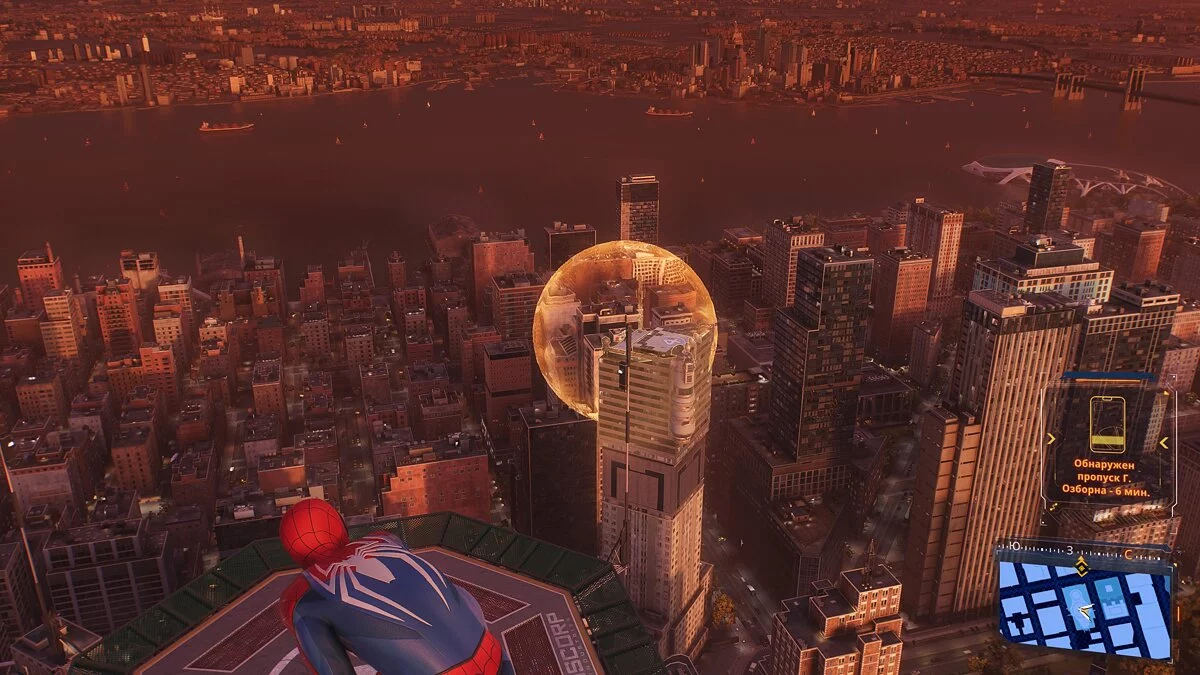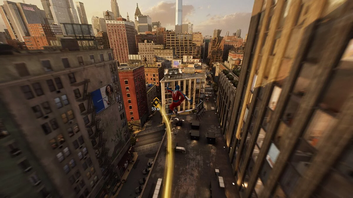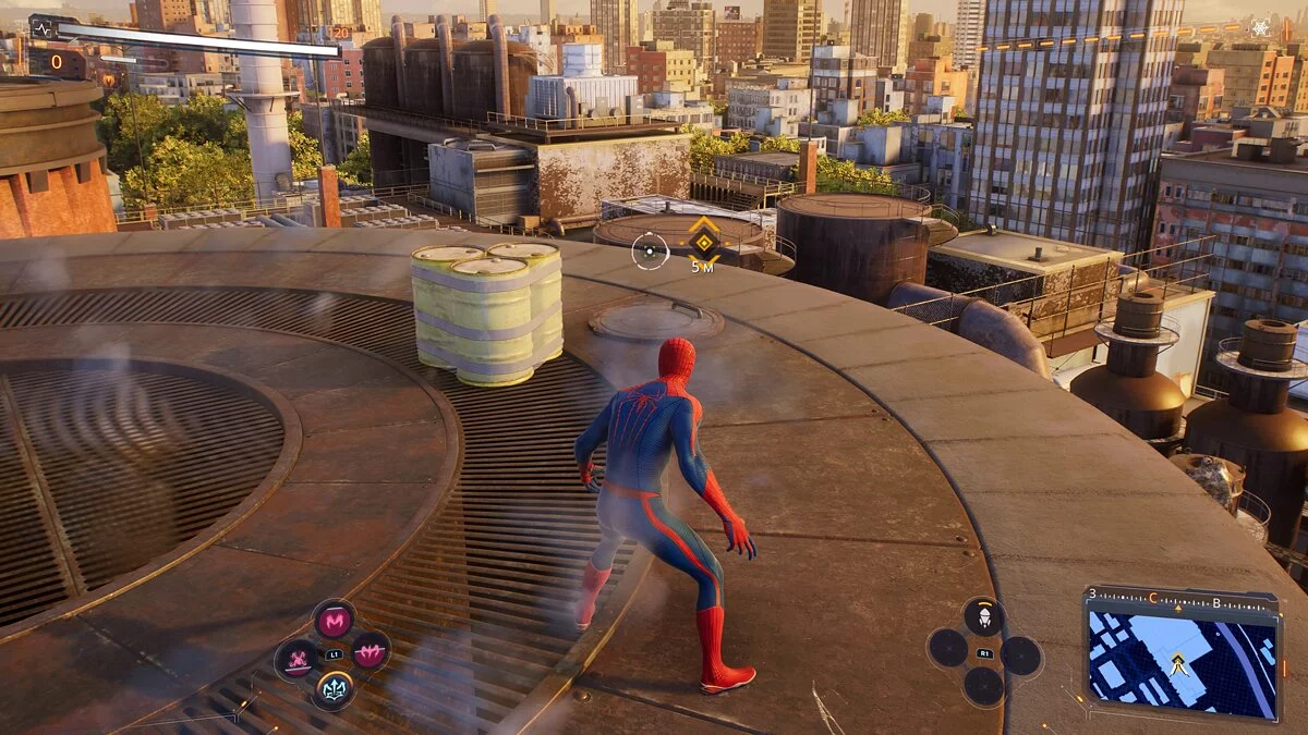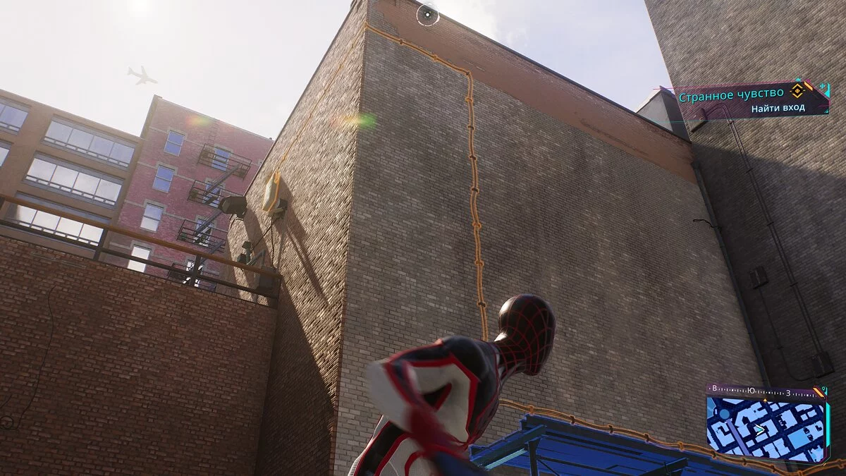После вступительного ролика двигайтесь к указанной точке. Раскачивайтесь на паутине при помощи кнопки R2, затем отпускайте её, летите вперёд и снова нажимайте R2, чтобы зацепиться за здание паутиной. Если вы упали — ничего страшного. Совершите прыжок кнопкой «крестик» и зажимайте R2. По стенам небоскребов можно бежать как по земле, если нажать R2. Иными словами, механика полётов на паутине со времён первой части не изменилась.