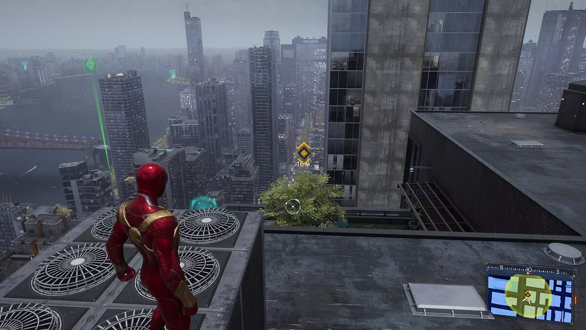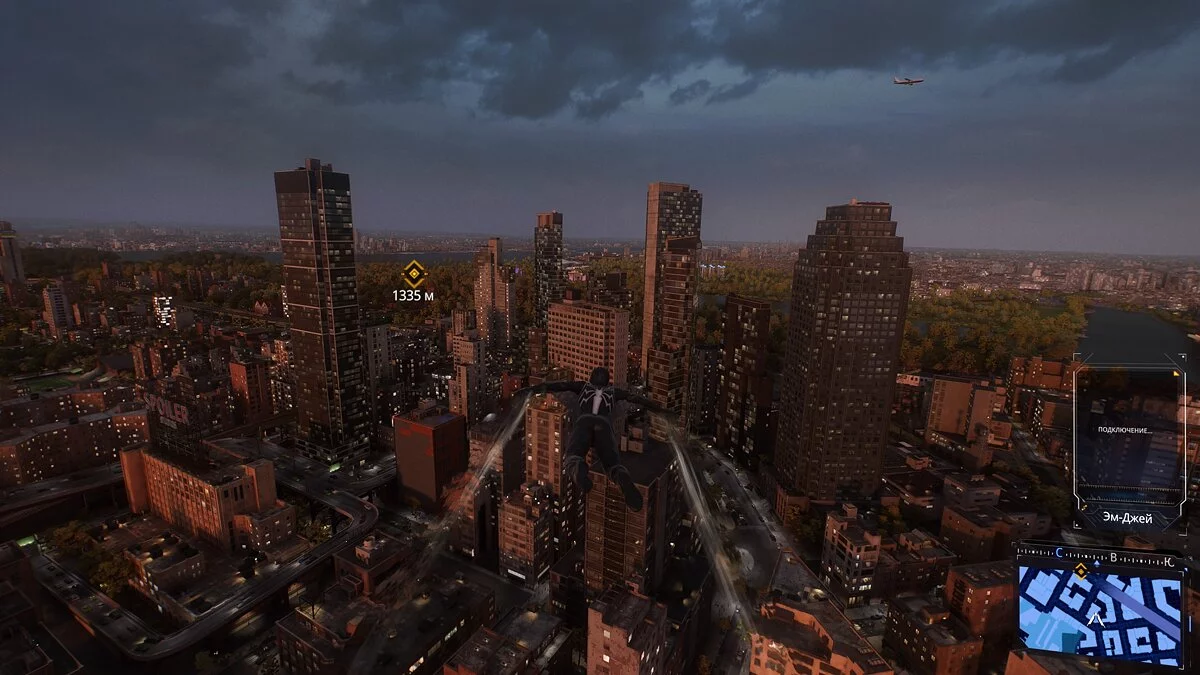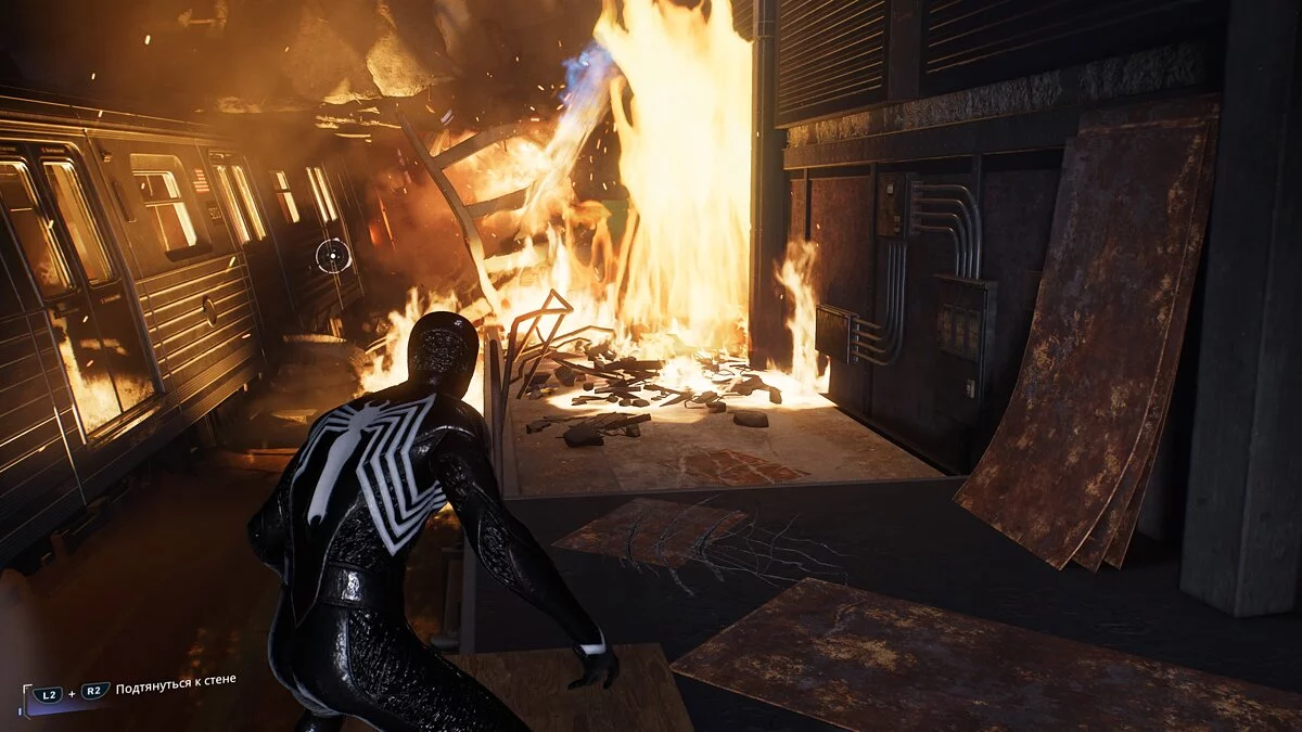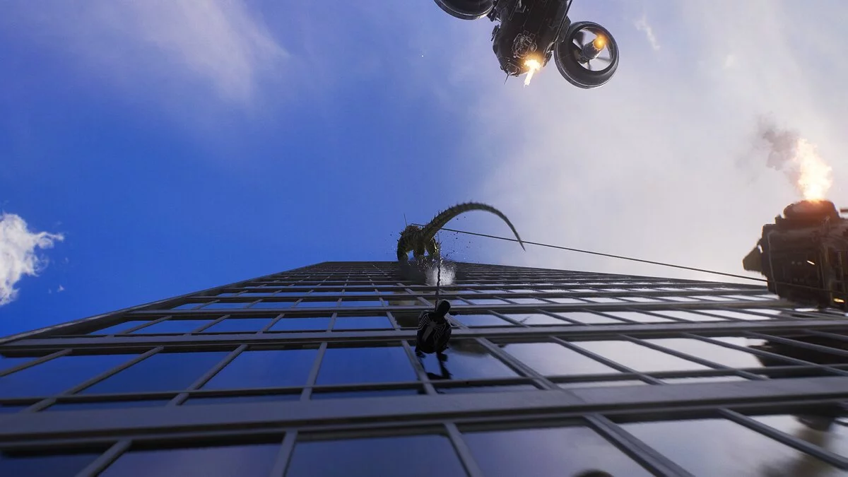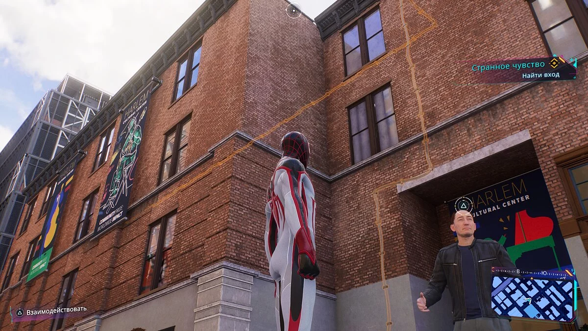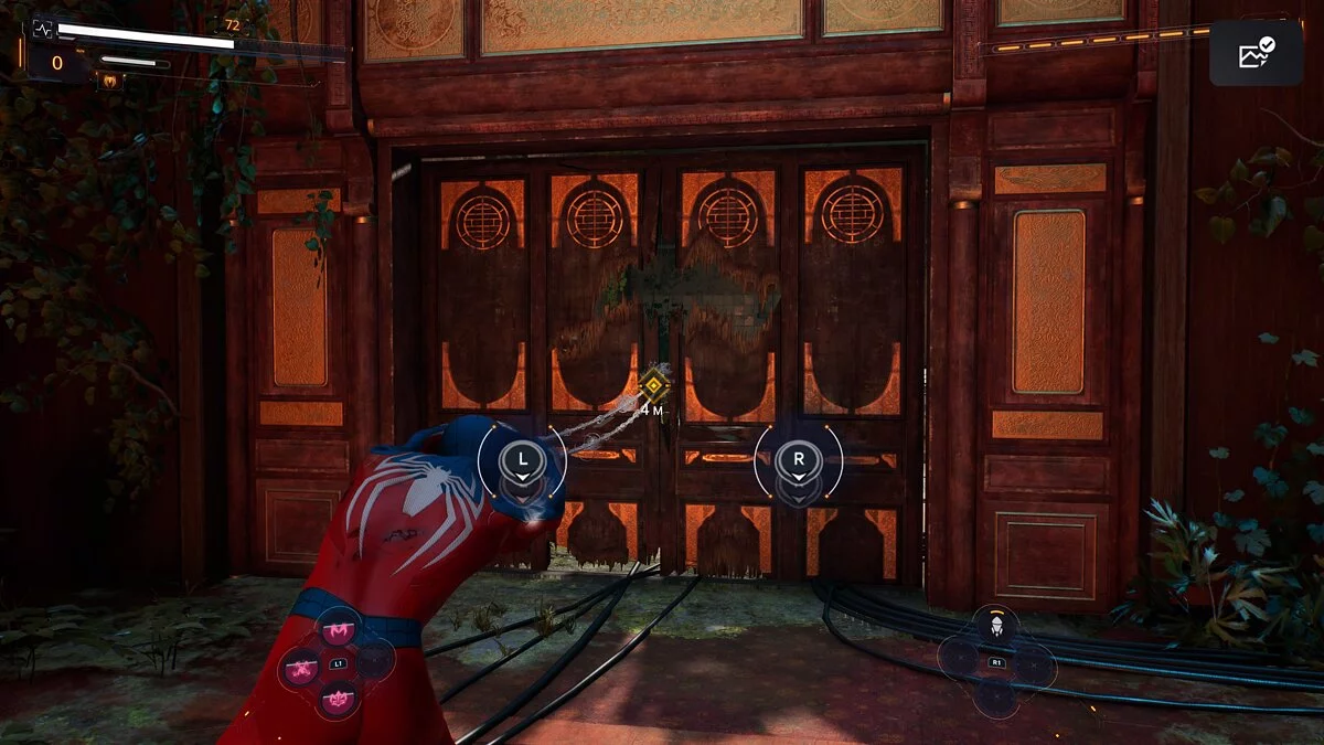 После вступительного ролика двигайтесь к указанной точке. Раскачивайтесь на паутине при помощи кнопки R2, затем отпускайте её, летите вперёд и снова нажимайте R2, чтобы зацепиться за здание паутиной. Если вы упали — ничего страшного. Совершите прыжок кнопкой «крестик» и зажимайте R2. По стенам небоскребов можно бежать как по земле, если нажать R2. Иными словами, механика полётов на паутине со времён первой части не изменилась.