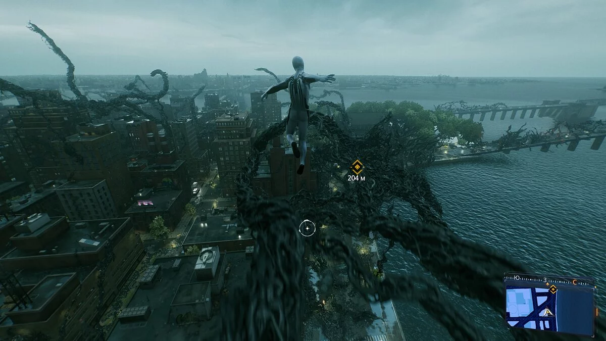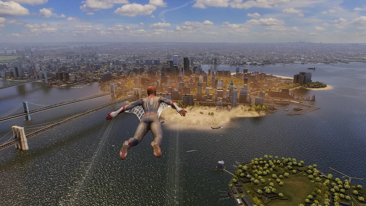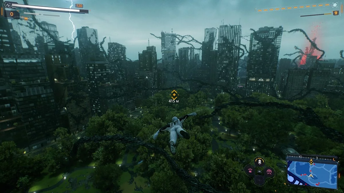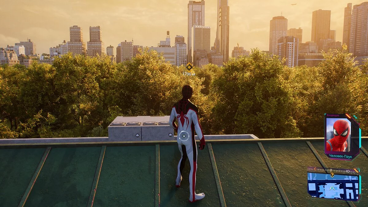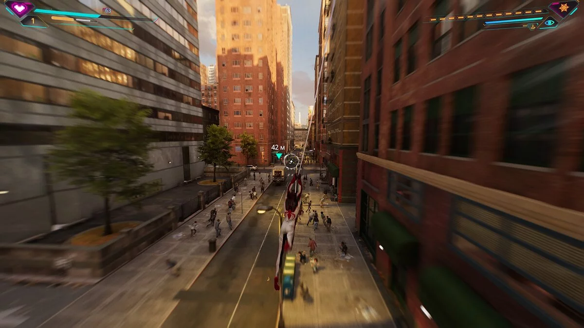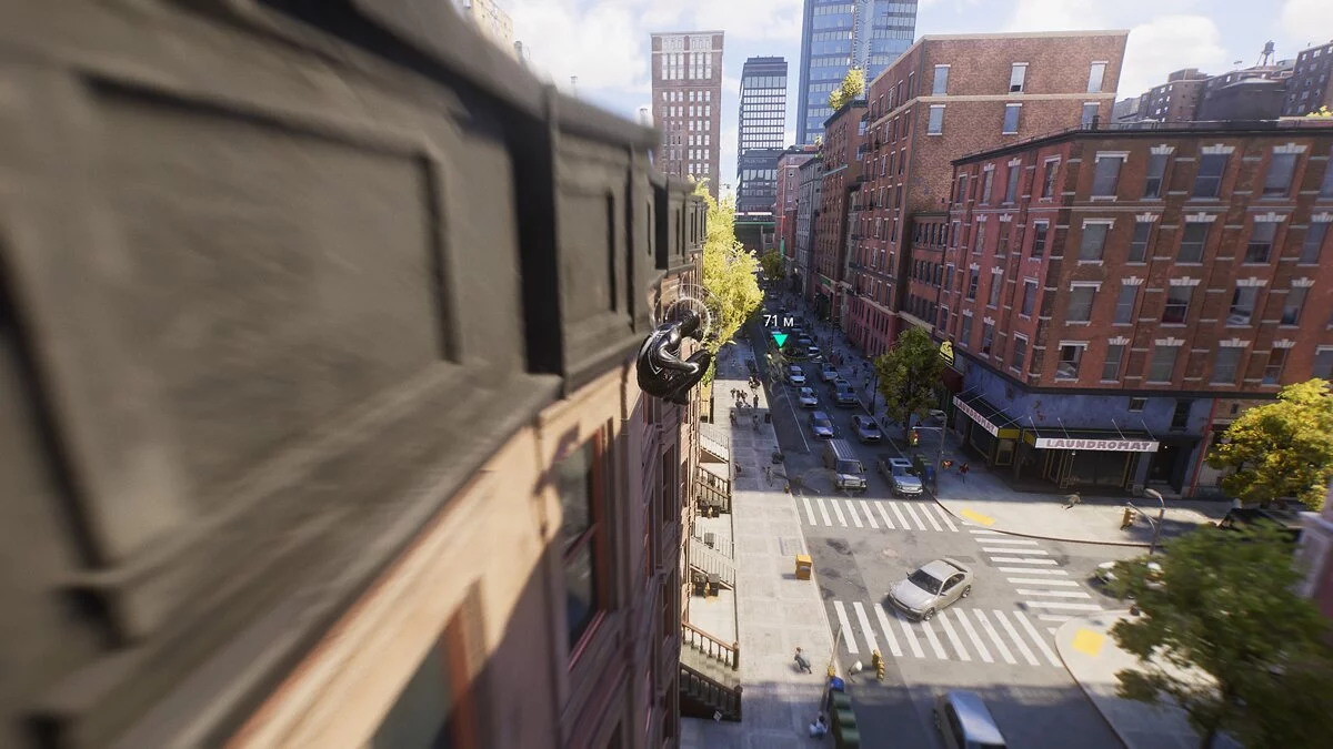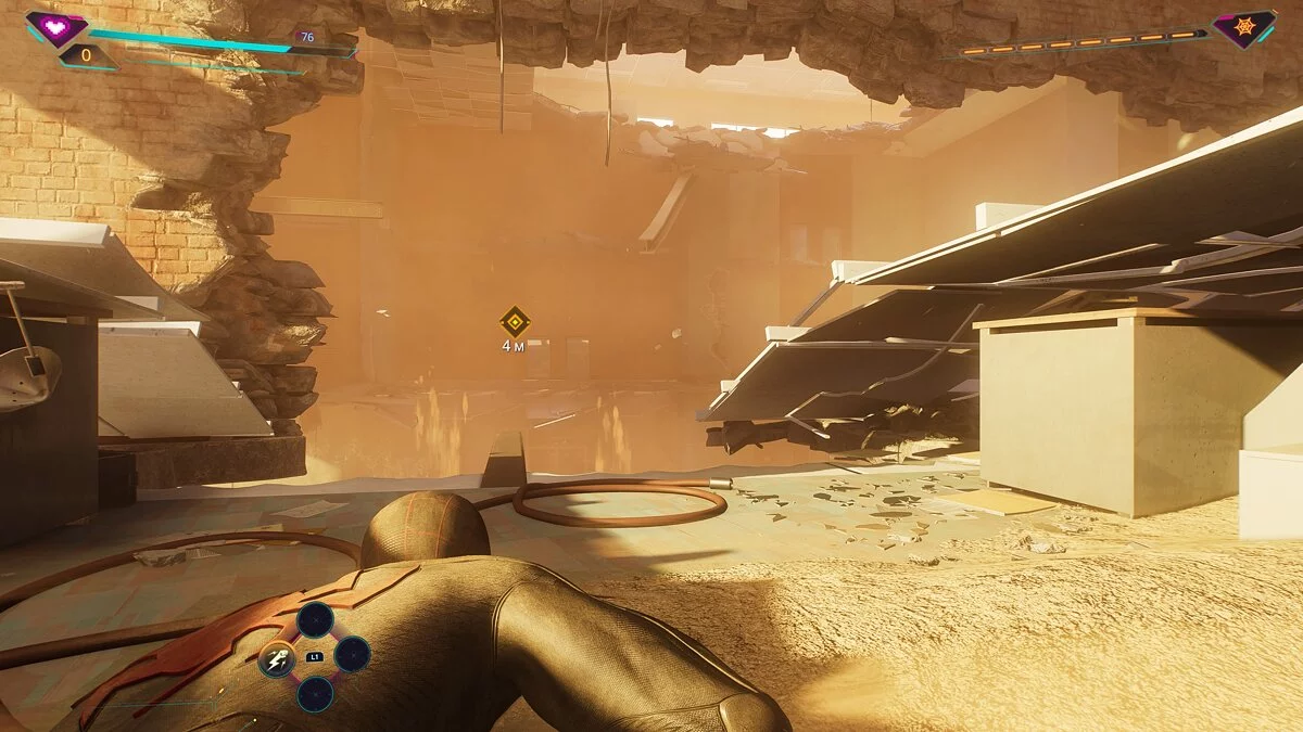 После вступительного ролика двигайтесь к указанной точке. Раскачивайтесь на паутине при помощи кнопки R2, затем отпускайте её, летите вперёд и снова нажимайте R2, чтобы зацепиться за здание паутиной. Если вы упали — ничего страшного. Совершите прыжок кнопкой «крестик» и зажимайте R2. По стенам небоскребов можно бежать как по земле, если нажать R2. Иными словами, механика полётов на паутине со времён первой части не изменилась.