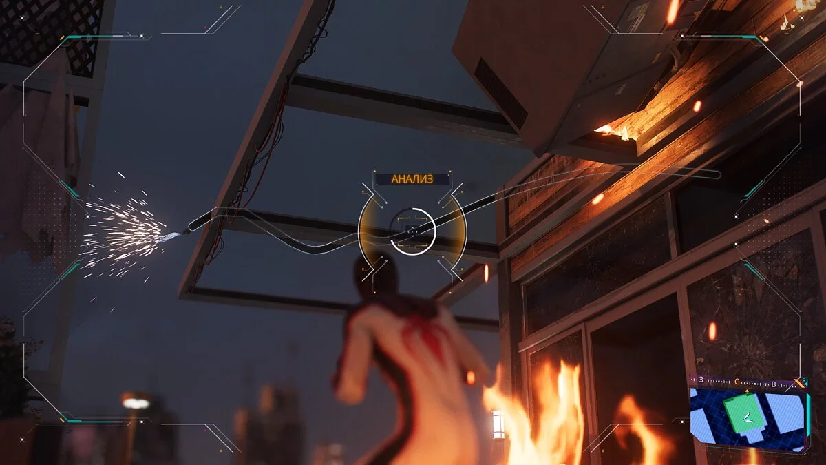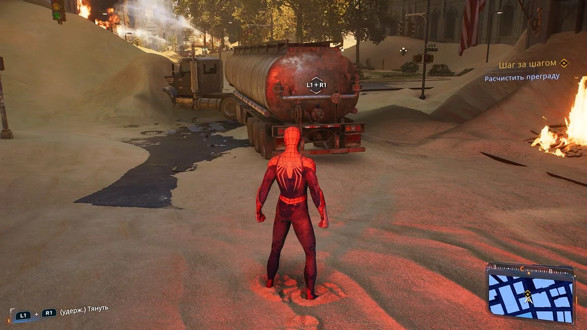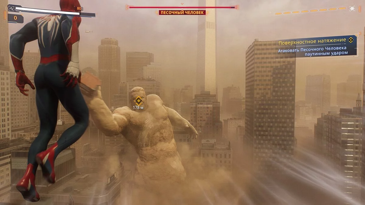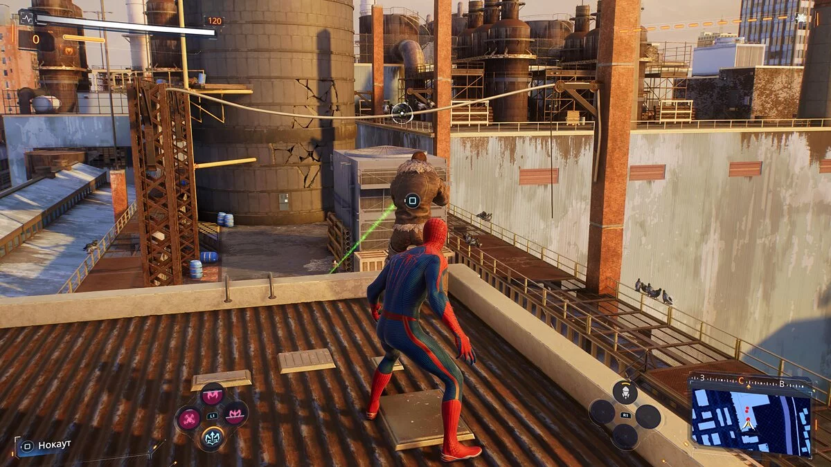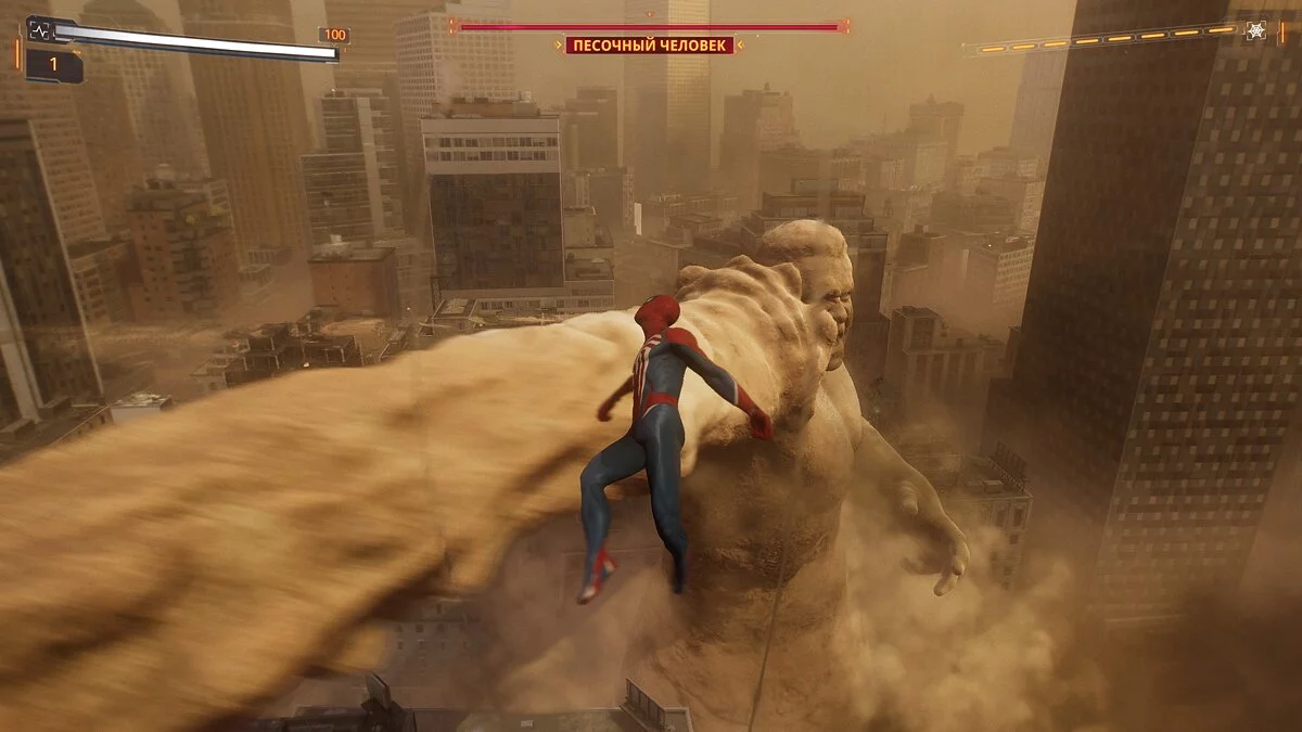 Питер Паркер скажет, что у него возникла идея. Подлетите к голове Песочного человека и нажмите на «треугольник», чтобы провести паутинный удар. Правда, всё пойдёт не по плану. После видеоролика бегите вперёд. Для этого удерживайте левый стик и клавишу R2. От всех препятствий герой будет уклоняться сам. Вам нужно будет лишь один раз вовремя нажать «треугольник».