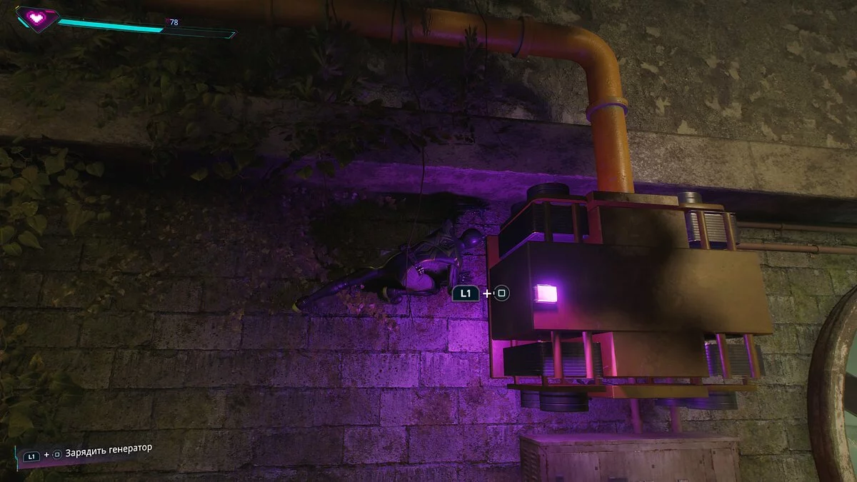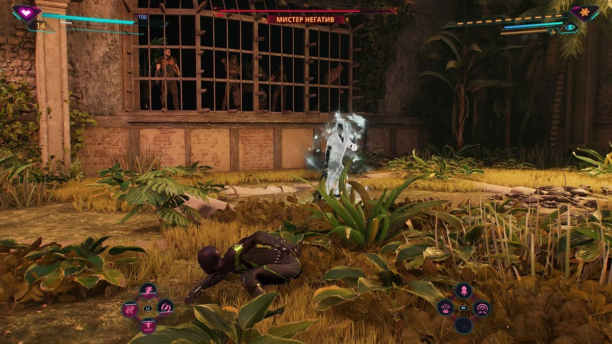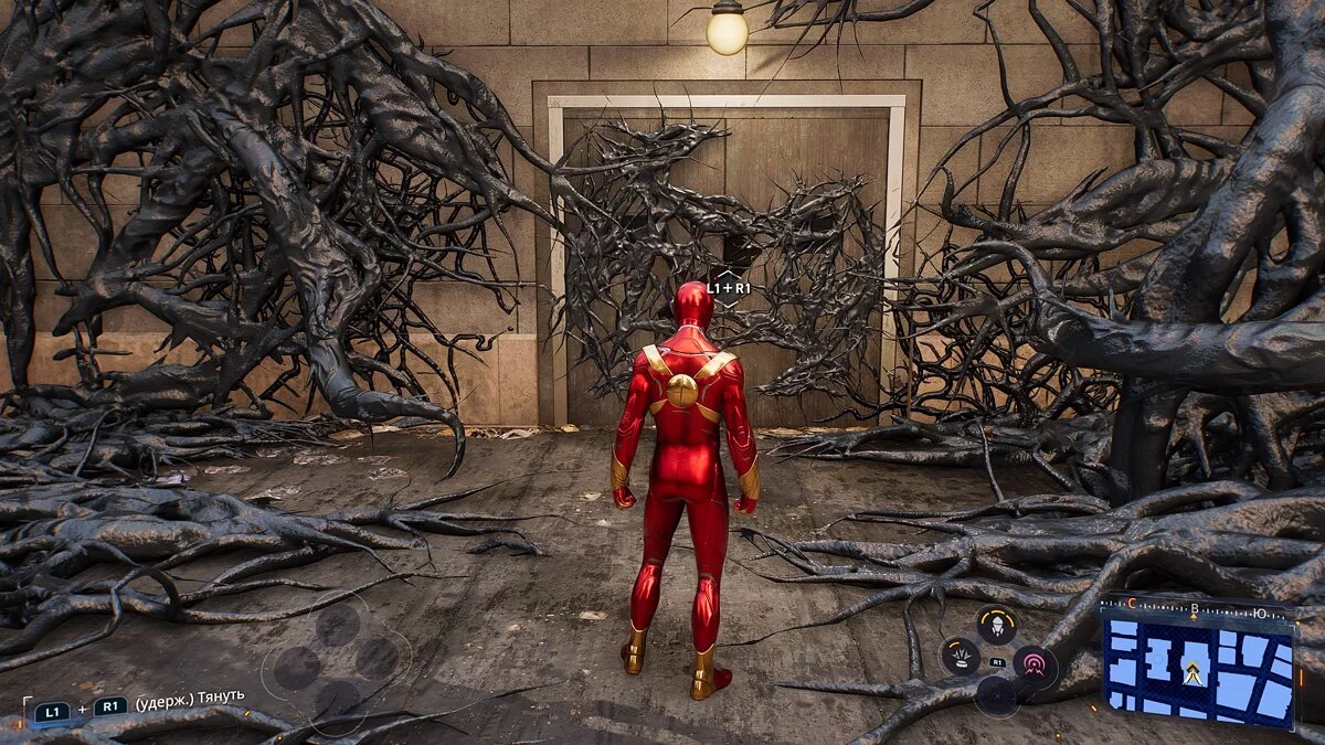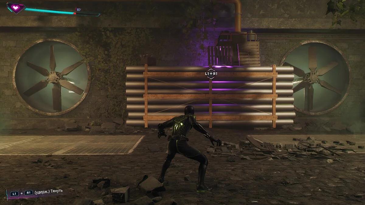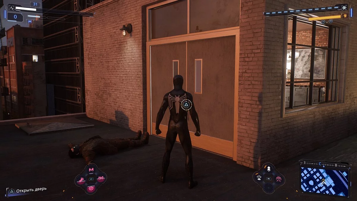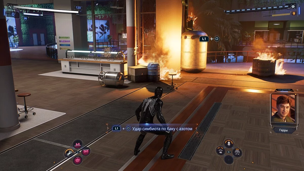 Управление переключится на Майлза Моралеса. Сочетание клавиш L1 + «квадрат» вызовет мощный биоудар по врагам. Воспользуйтесь им. Успешные удары будут заполнять шкалы концентрации. С её помощью вы сможете лечиться. Для этого нажмите кнопку «вниз» на крестовине. После победы над врагами нажмите L1+R1, чтобы выпустить воду, а затем — L2+R2. Таким образом вы подниметесь на этаж выше.