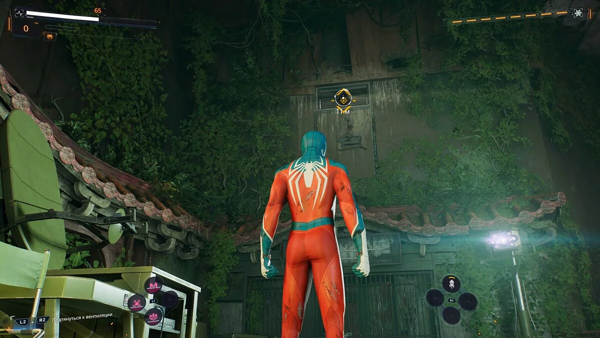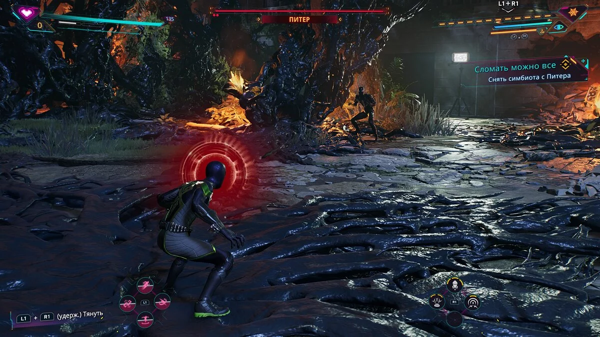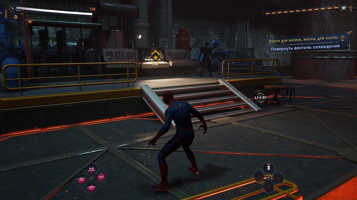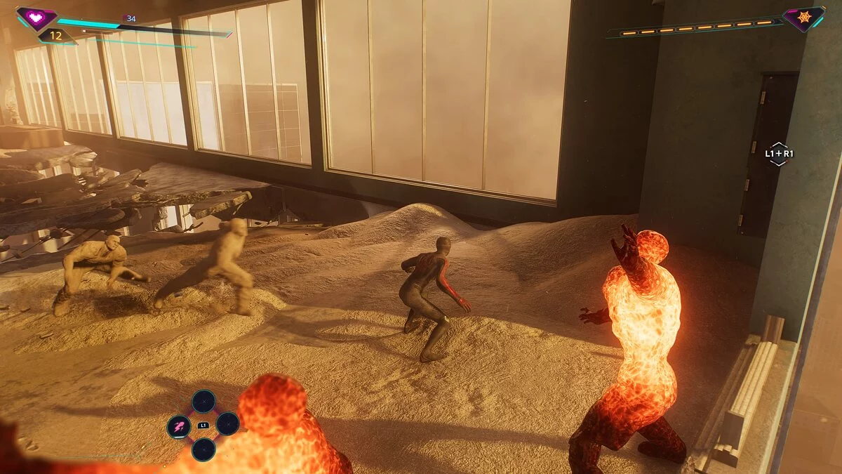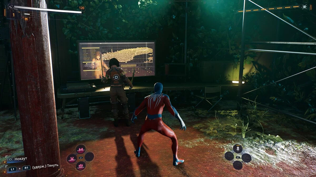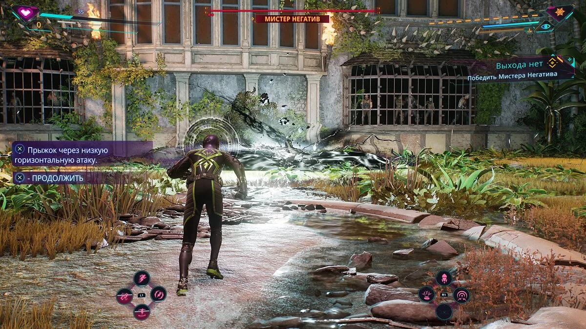 Управление переключится на Майлза Моралеса. Сочетание клавиш L1 + «квадрат» вызовет мощный биоудар по врагам. Воспользуйтесь им. Успешные удары будут заполнять шкалы концентрации. С её помощью вы сможете лечиться. Для этого нажмите кнопку «вниз» на крестовине. После победы над врагами нажмите L1+R1, чтобы выпустить воду, а затем — L2+R2. Таким образом вы подниметесь на этаж выше.