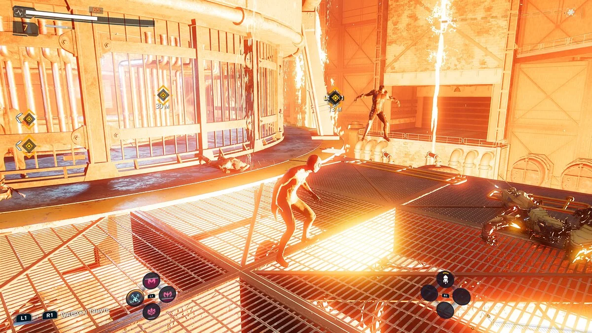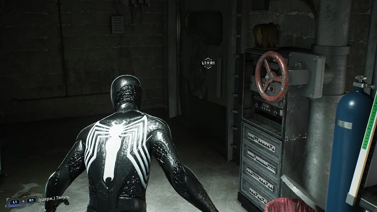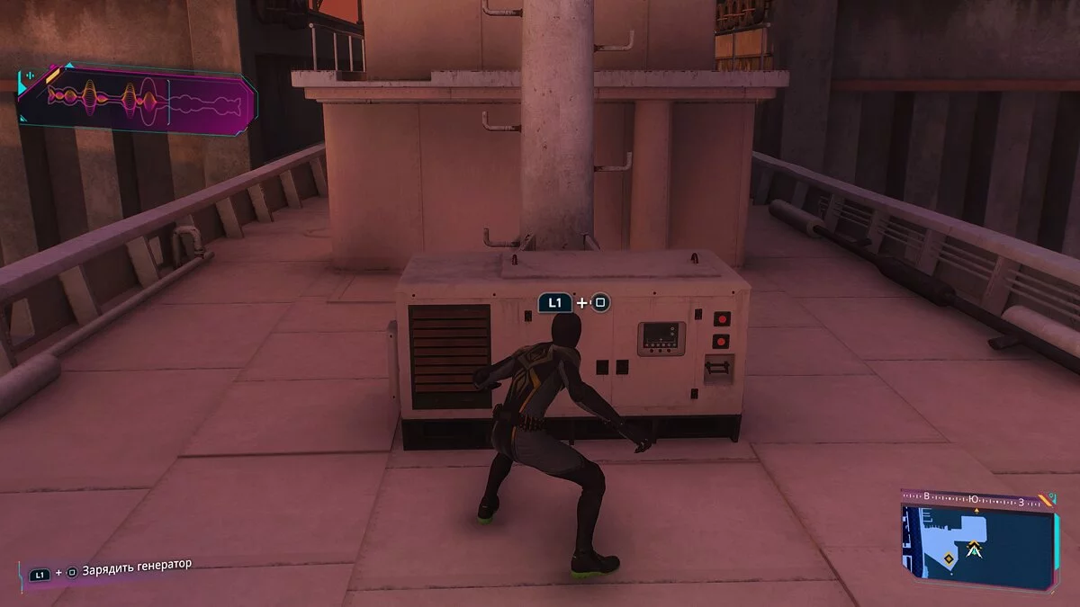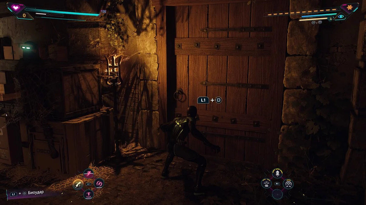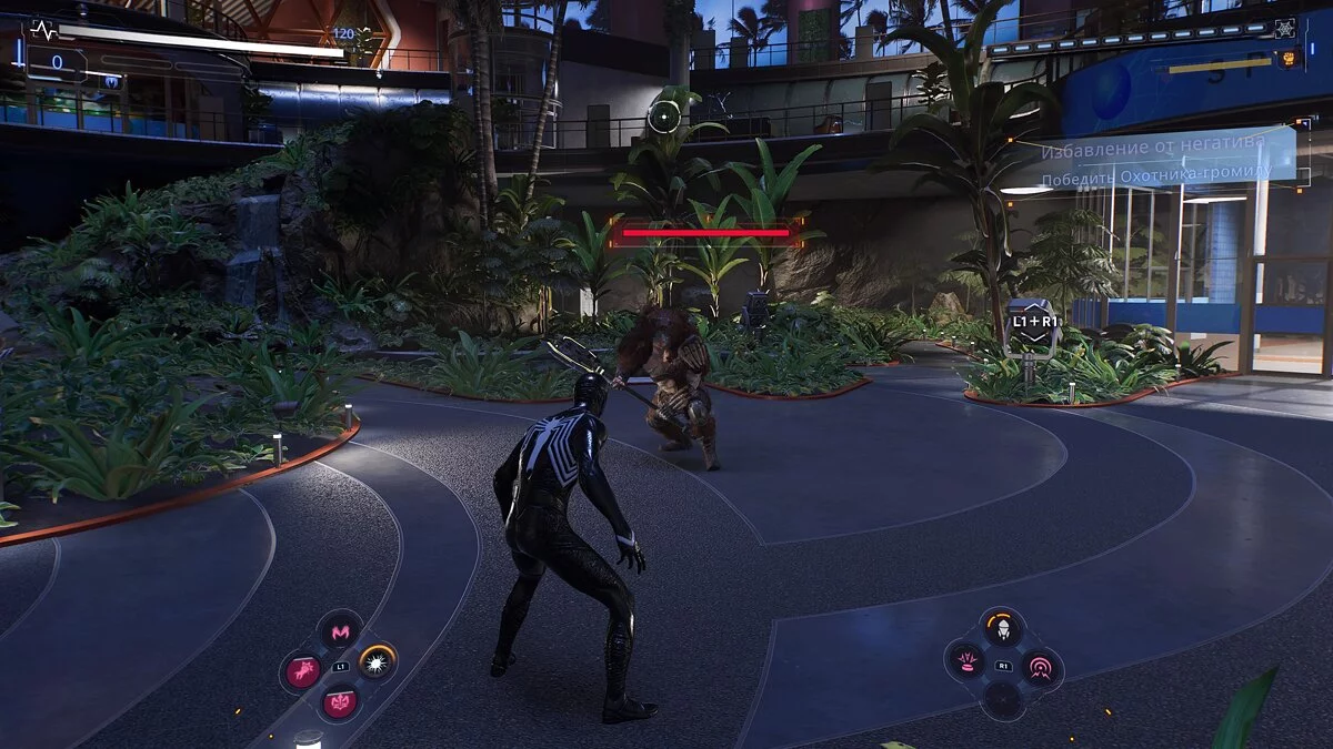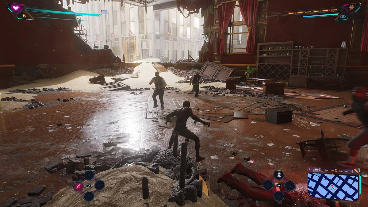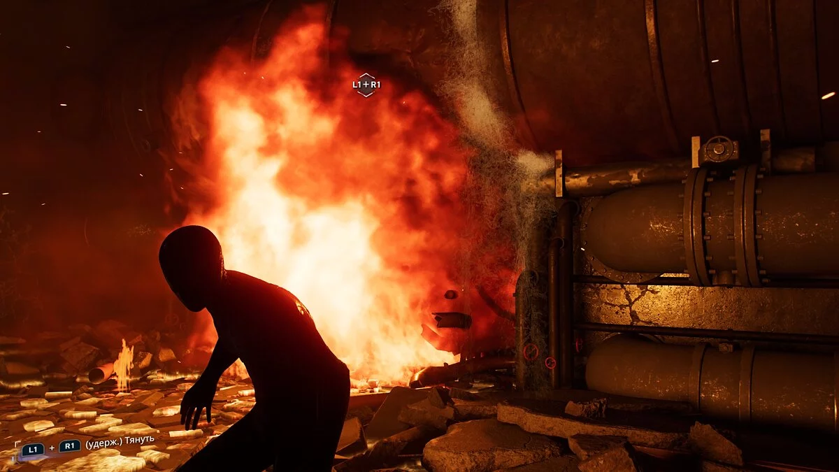 Управление переключится на Майлза Моралеса. Сочетание клавиш L1 + «квадрат» вызовет мощный биоудар по врагам. Воспользуйтесь им. Успешные удары будут заполнять шкалы концентрации. С её помощью вы сможете лечиться. Для этого нажмите кнопку «вниз» на крестовине. После победы над врагами нажмите L1+R1, чтобы выпустить воду, а затем — L2+R2. Таким образом вы подниметесь на этаж выше.
