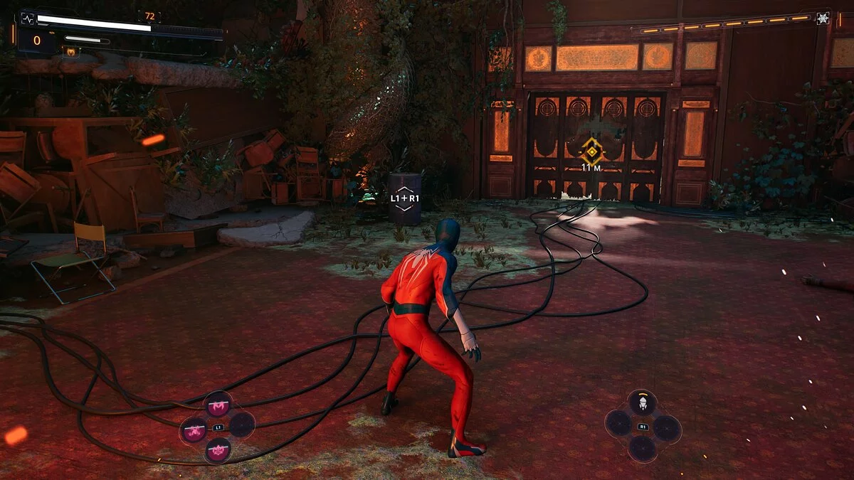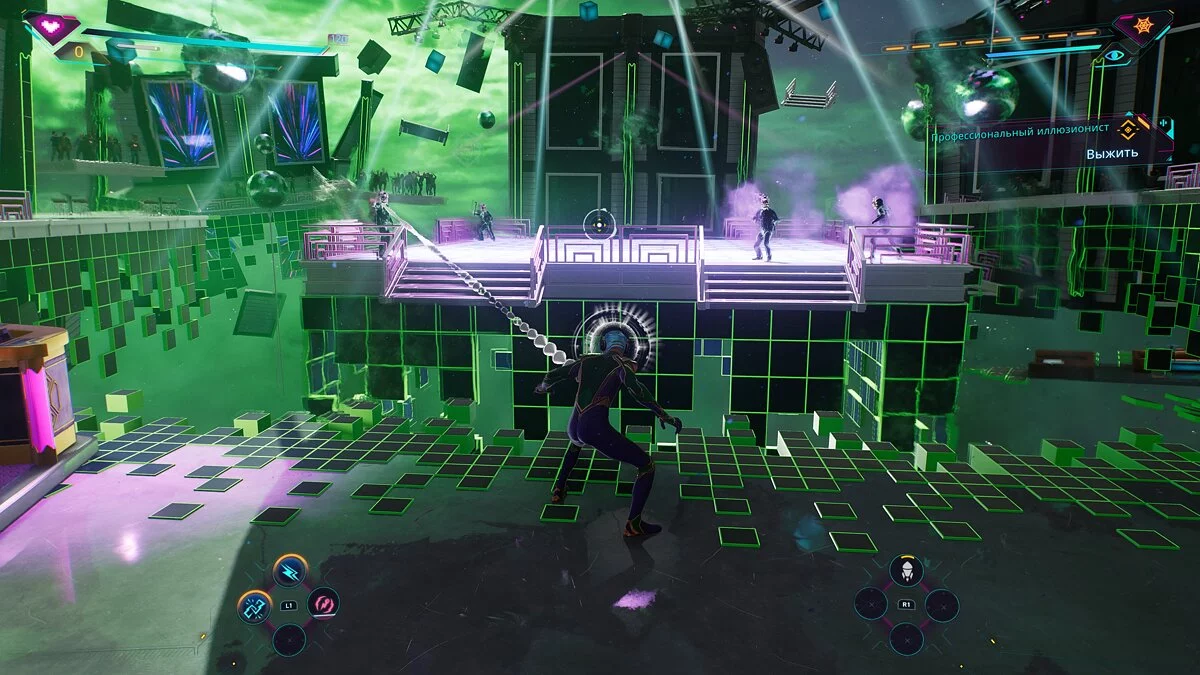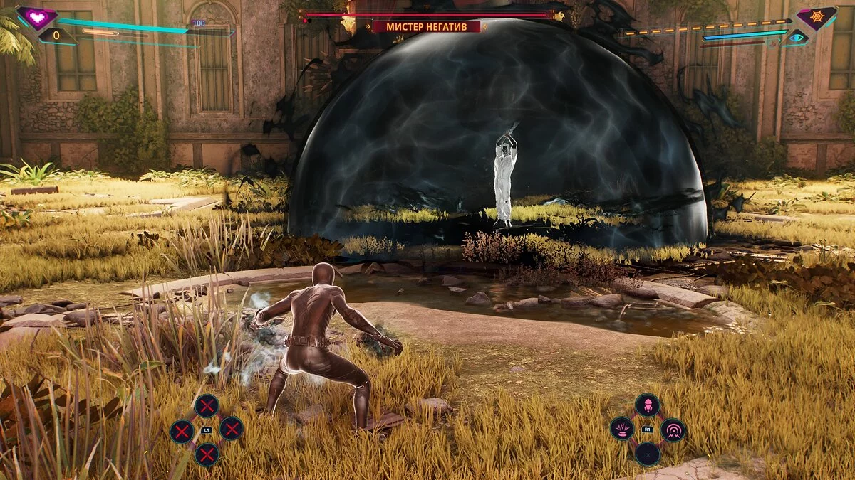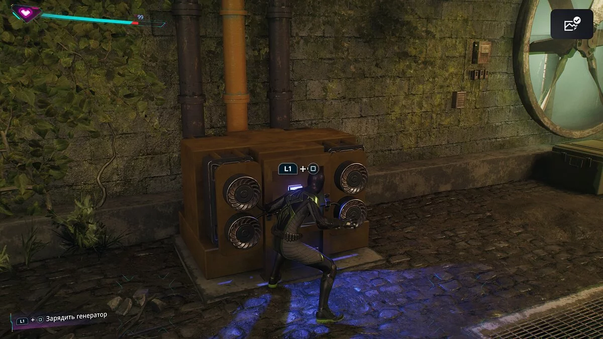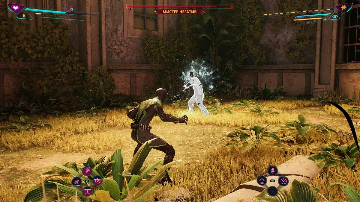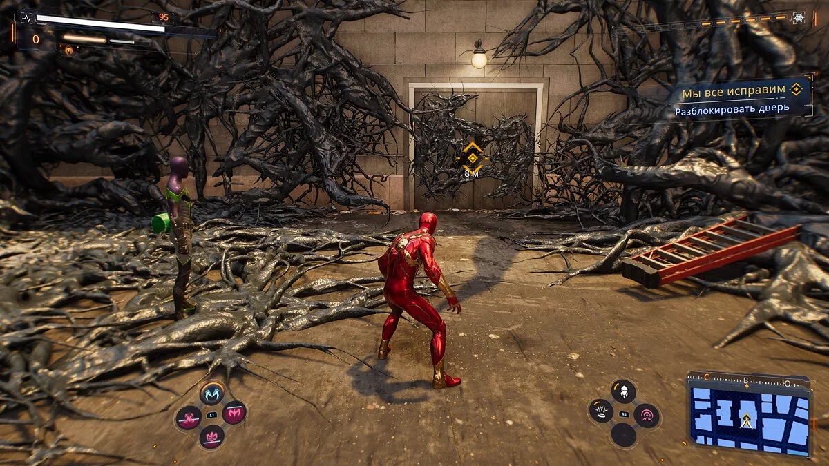 Управление переключится на Майлза Моралеса. Сочетание клавиш L1 + «квадрат» вызовет мощный биоудар по врагам. Воспользуйтесь им. Успешные удары будут заполнять шкалы концентрации. С её помощью вы сможете лечиться. Для этого нажмите кнопку «вниз» на крестовине. После победы над врагами нажмите L1+R1, чтобы выпустить воду, а затем — L2+R2. Таким образом вы подниметесь на этаж выше.