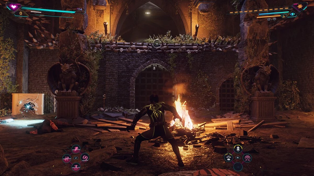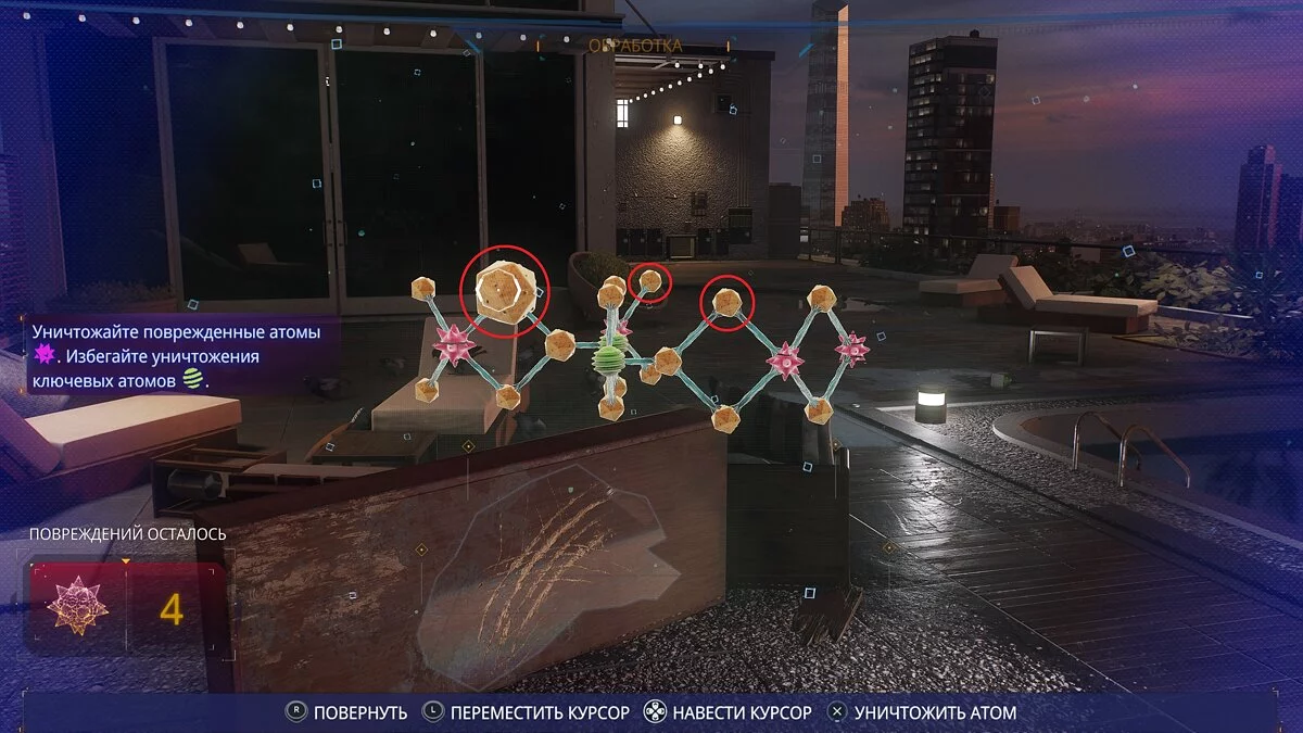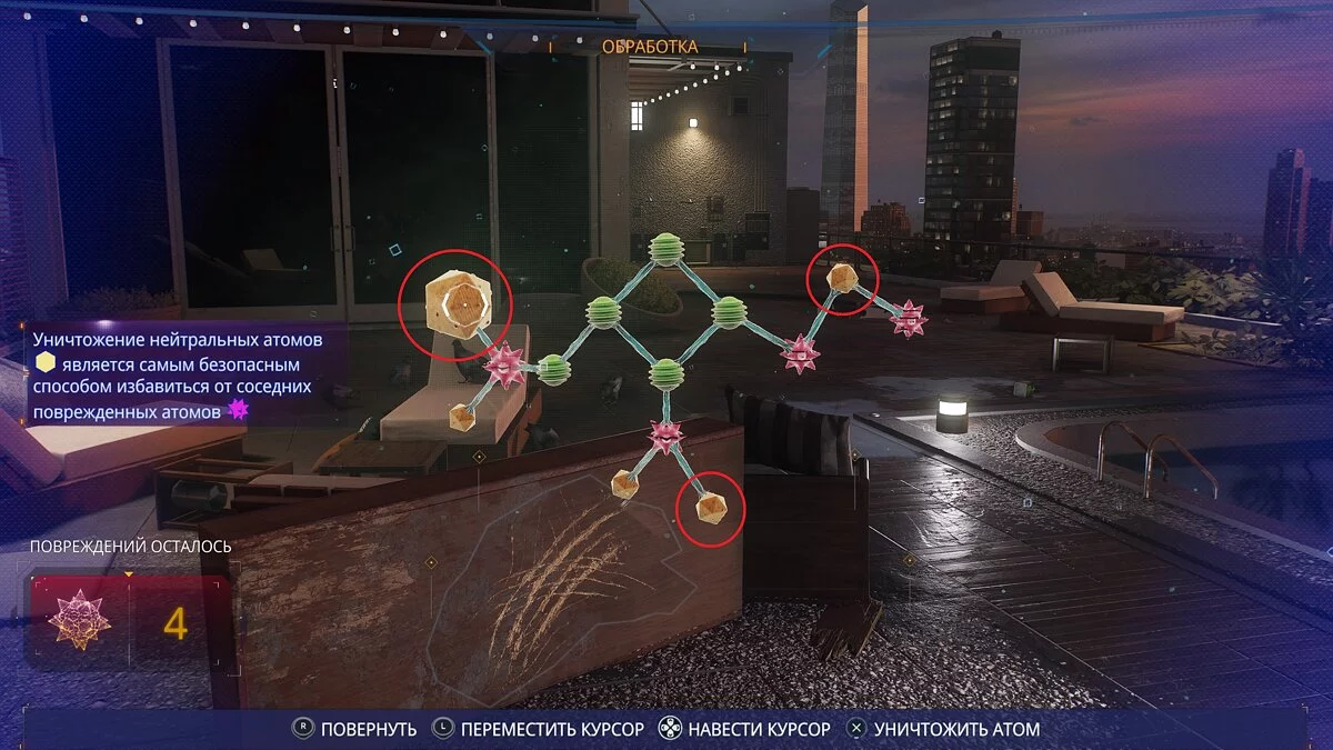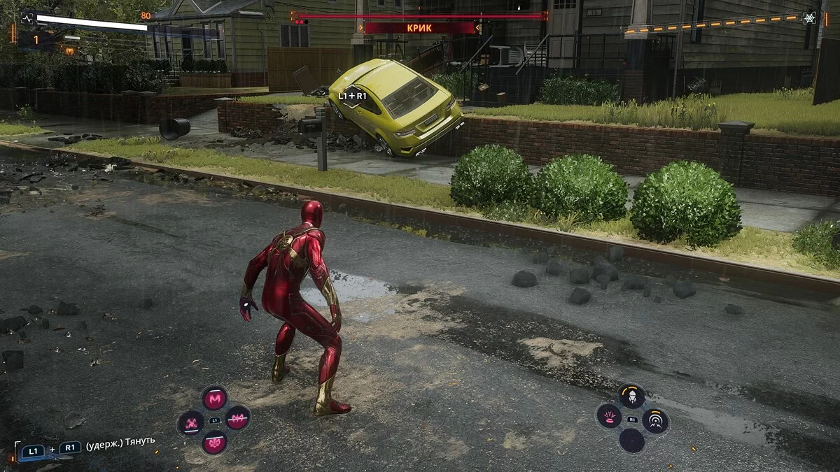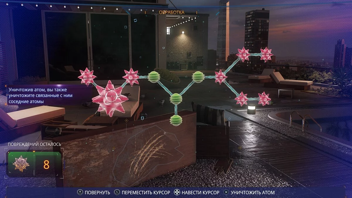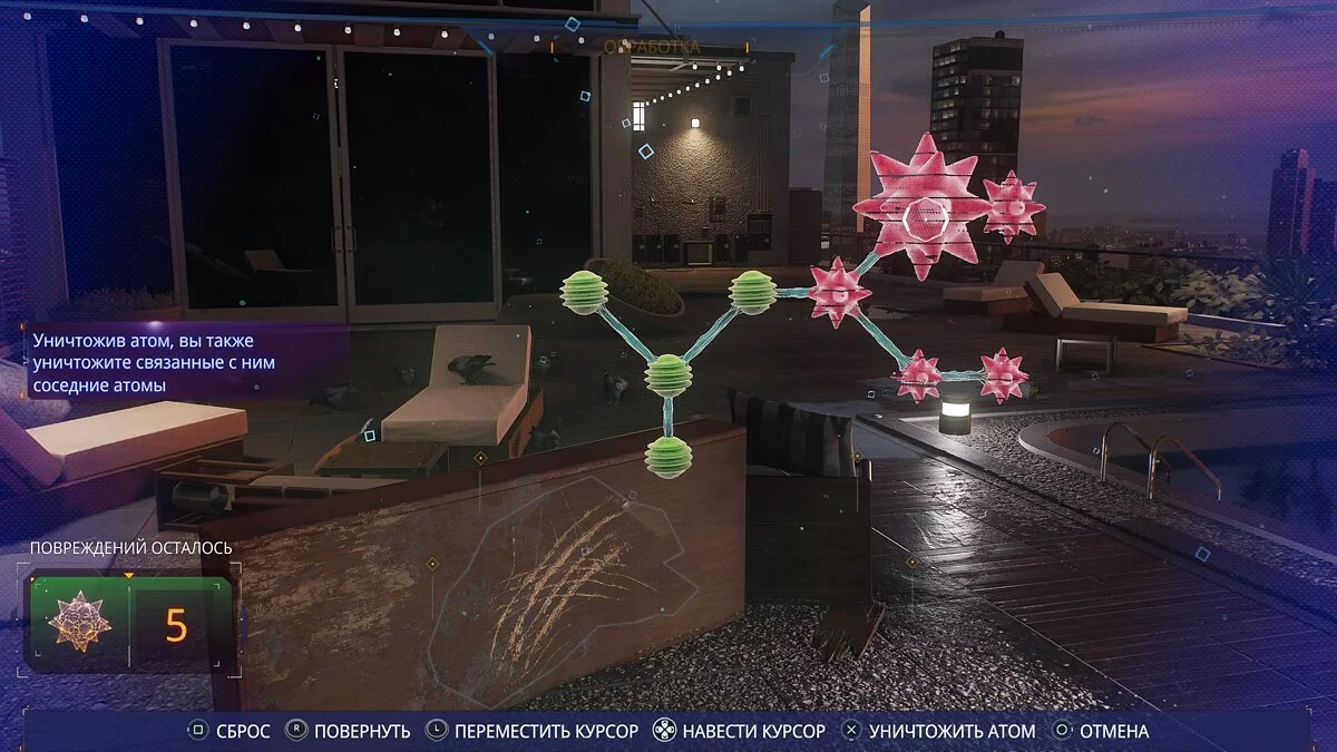 Управление переключится на Майлза Моралеса. Сочетание клавиш L1 + «квадрат» вызовет мощный биоудар по врагам. Воспользуйтесь им. Успешные удары будут заполнять шкалы концентрации. С её помощью вы сможете лечиться. Для этого нажмите кнопку «вниз» на крестовине. После победы над врагами нажмите L1+R1, чтобы выпустить воду, а затем — L2+R2. Таким образом вы подниметесь на этаж выше.