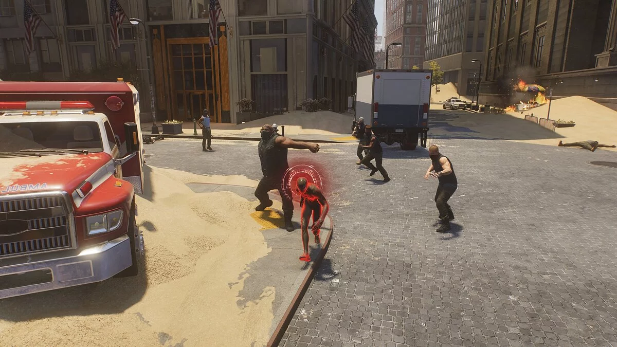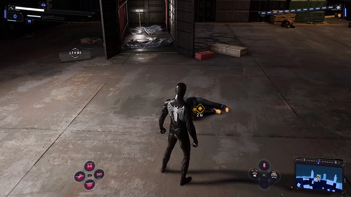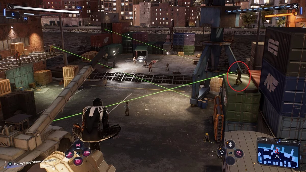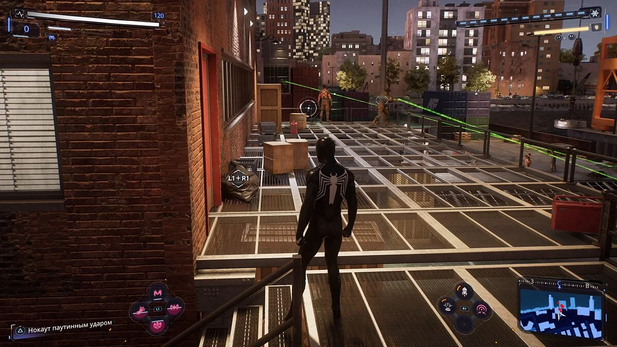 Пришло время испытать новую способность. Рядом с вами совершается преступление. Спланируйте вниз на паучьих крыльях и вступите в драку. Подбрасывайте головорезов и бейте их в рукопашную. От стрелков можно избавиться при помощи быстрой паутины (клавиша L1). Не забывайте уклоняться, когда видите белый луч, который направлен к вам. Если не успеете — получите автоматную очередь в спину.