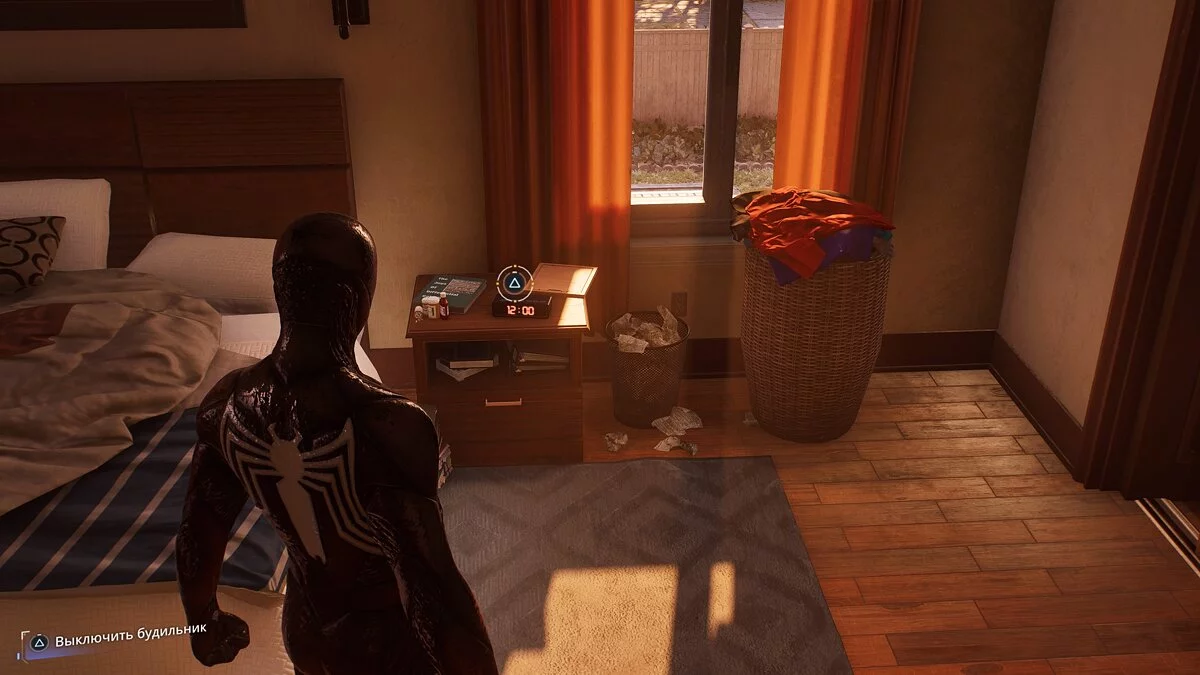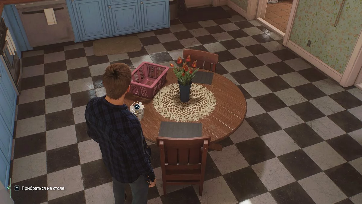 Двигайтесь на встречу с Мэри Джейн. После видеоролика нужно будет убраться в квартире. Осмотрите бумаги и коробки, выбросите в мусорку гнилые бананы и коробки из-под еды.