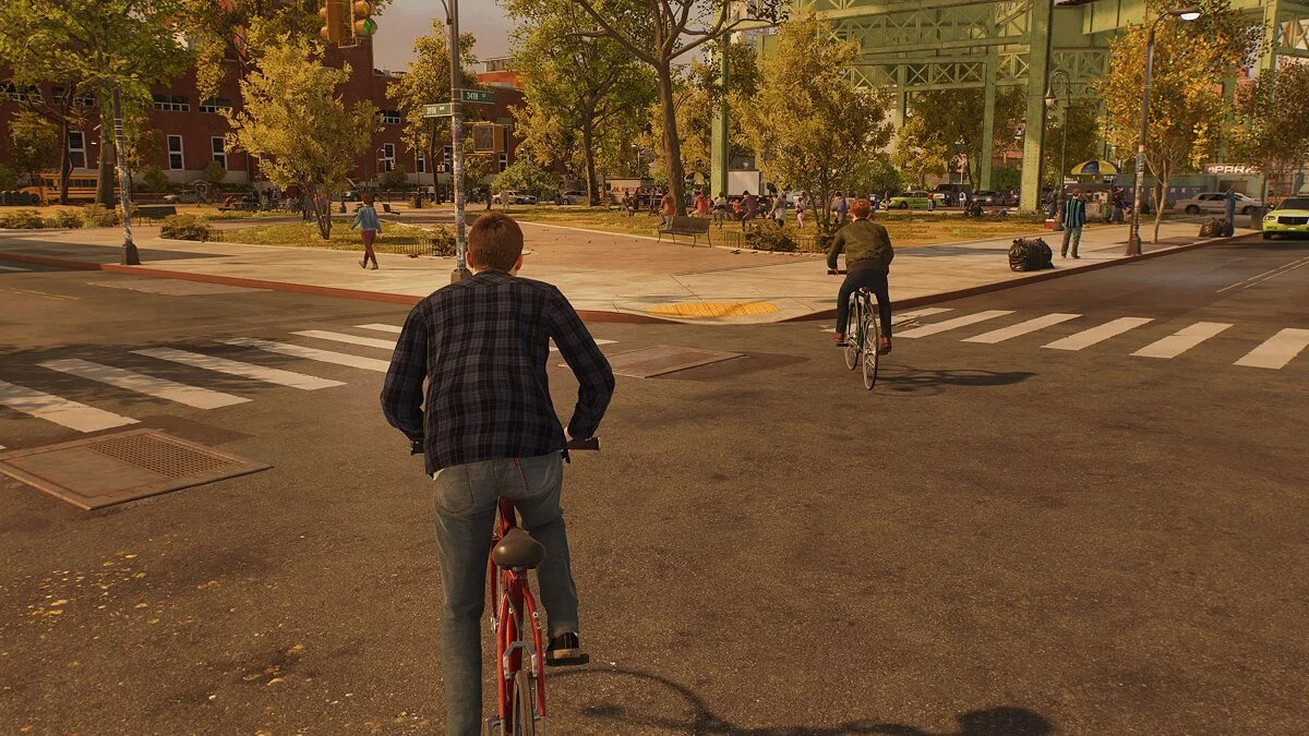 Затем спускайтесь вниз. Вам нужно будет ехать за Гарри на велосипеде. Нажимайте «крестик», чтобы ускорится.