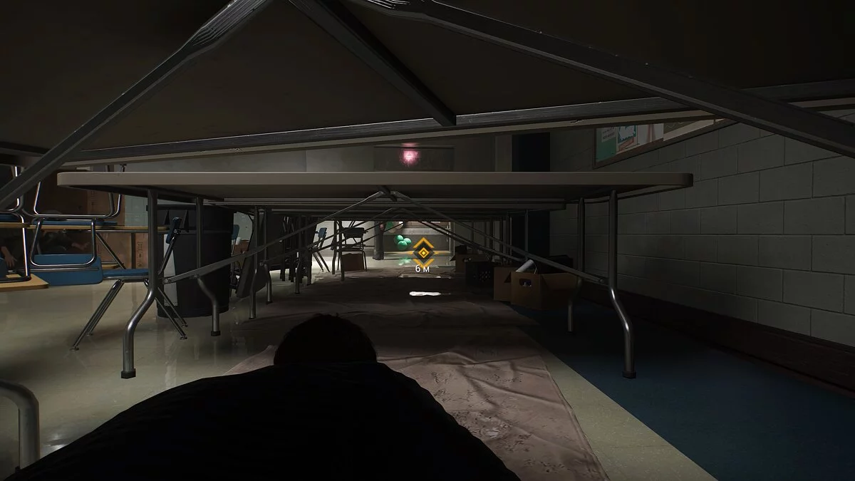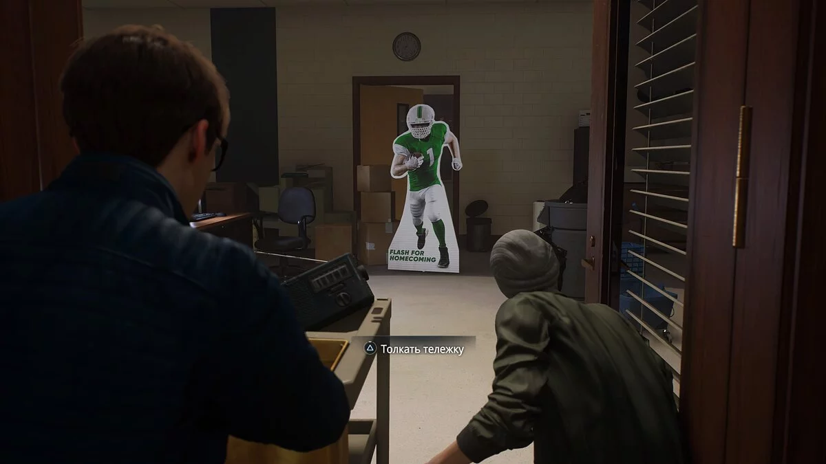 Когда вы доберётесь до школы, действие перенесётся на несколько лет назад. Вас ждёт небольшой стелс-эпизод. Возьмите тележку и направьте её на картонную фигуру футболиста.