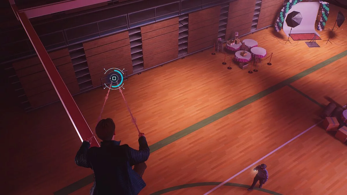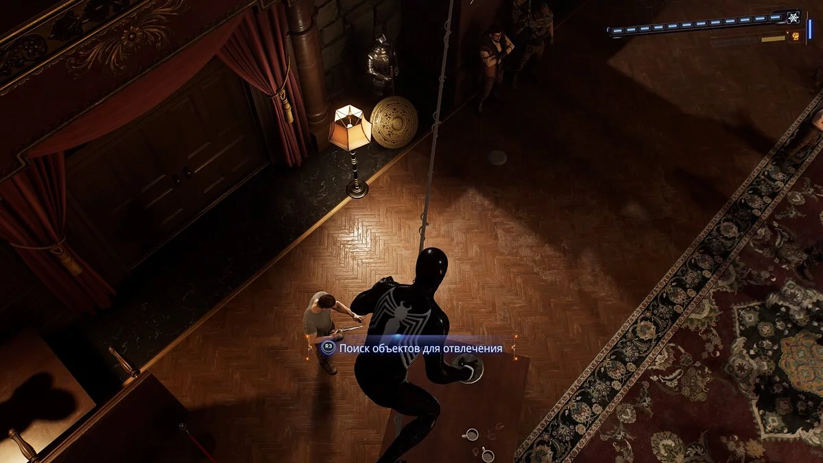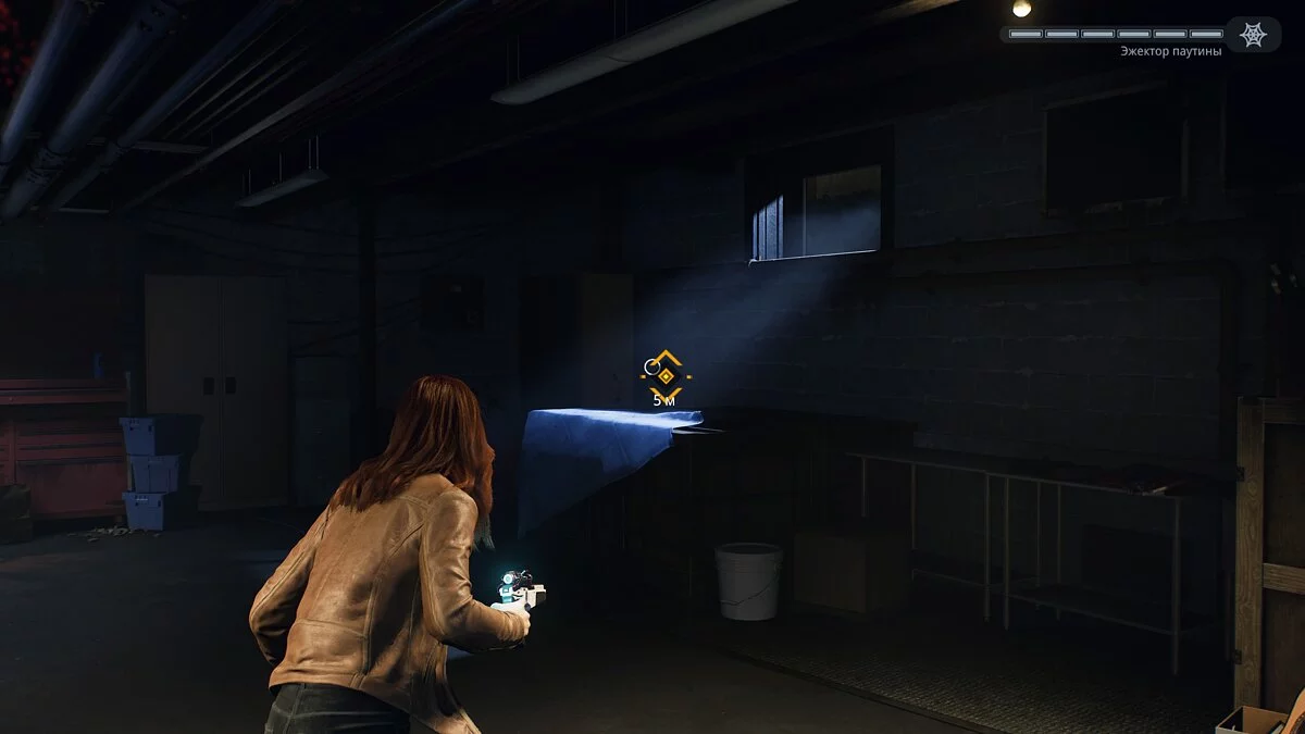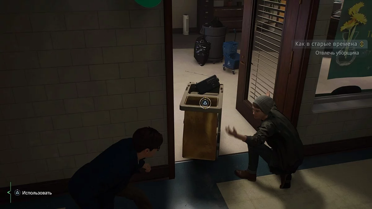 Выстрелите паутиной по телевизору, чтобы отвлечь охранника, после чего проскочите в коридор. Прыгайте на потолок и двигайтесь к жёлтому маркеру. Вам нужно будет опрокинуть мусорник, чтобы заставить уборщика отойти в сторону. Затем вы должны прыгнуть ему за спину.