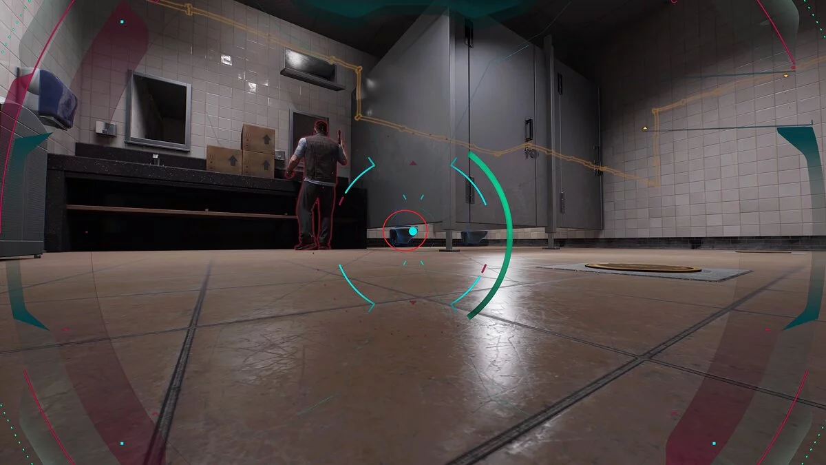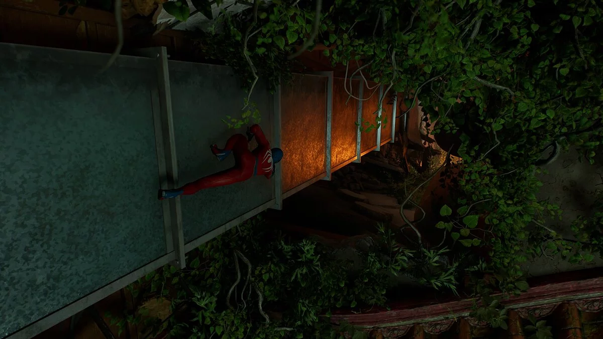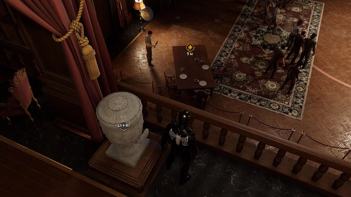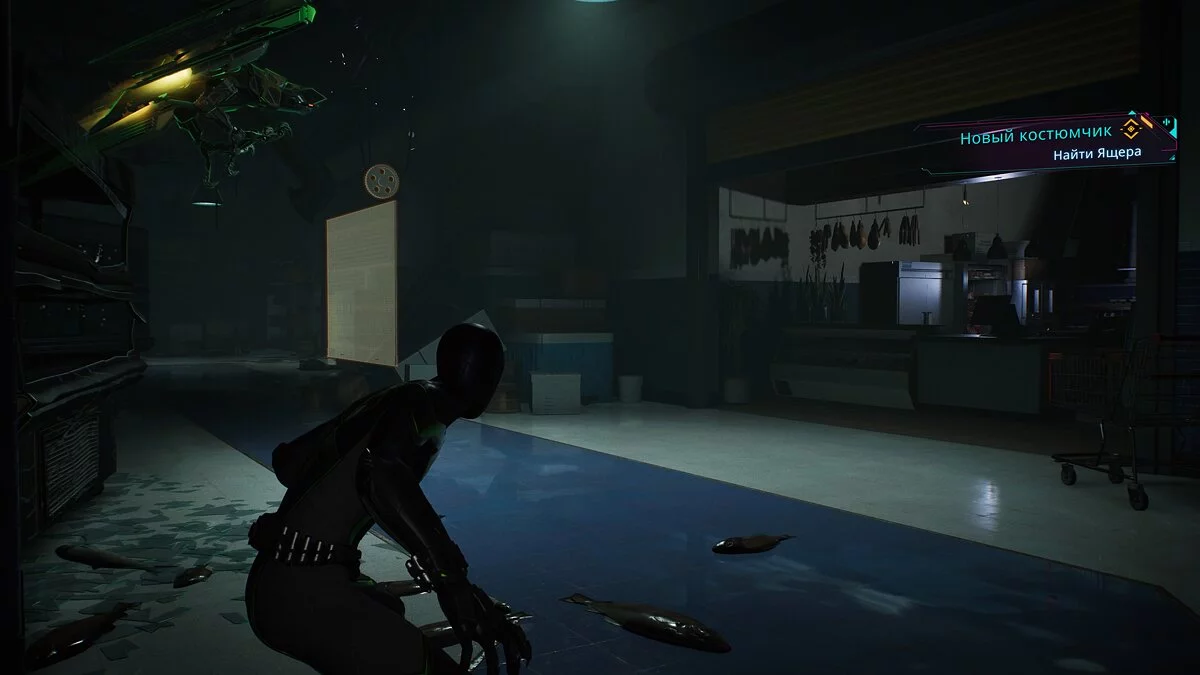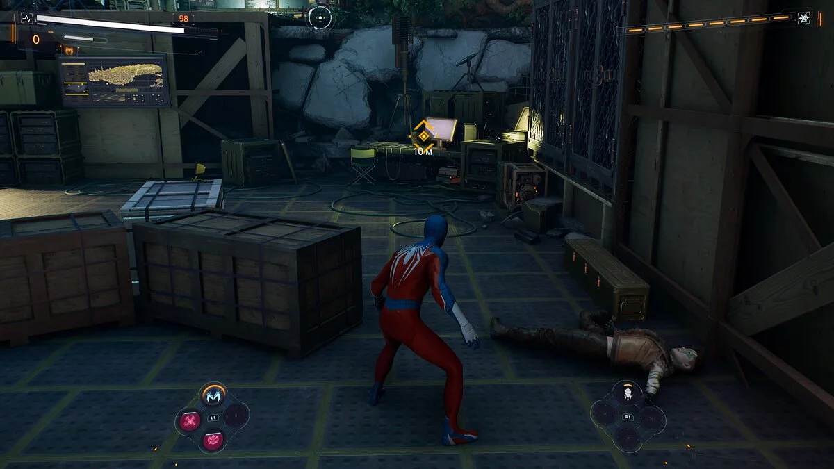 Выстрелите паутиной по телевизору, чтобы отвлечь охранника, после чего проскочите в коридор. Прыгайте на потолок и двигайтесь к жёлтому маркеру. Вам нужно будет опрокинуть мусорник, чтобы заставить уборщика отойти в сторону. Затем вы должны прыгнуть ему за спину.
