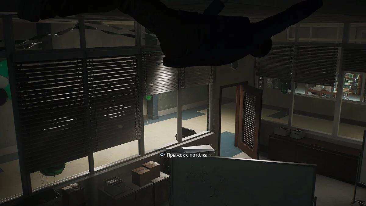 Если вы хотите и дальше действовать бесшумно — прыгайте на потолок и проникайте в соседнюю комнату. Любители открытого боя могут смело выбивать дверь.