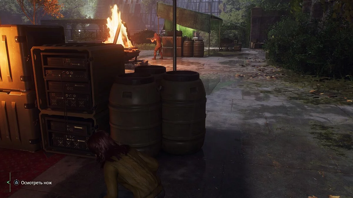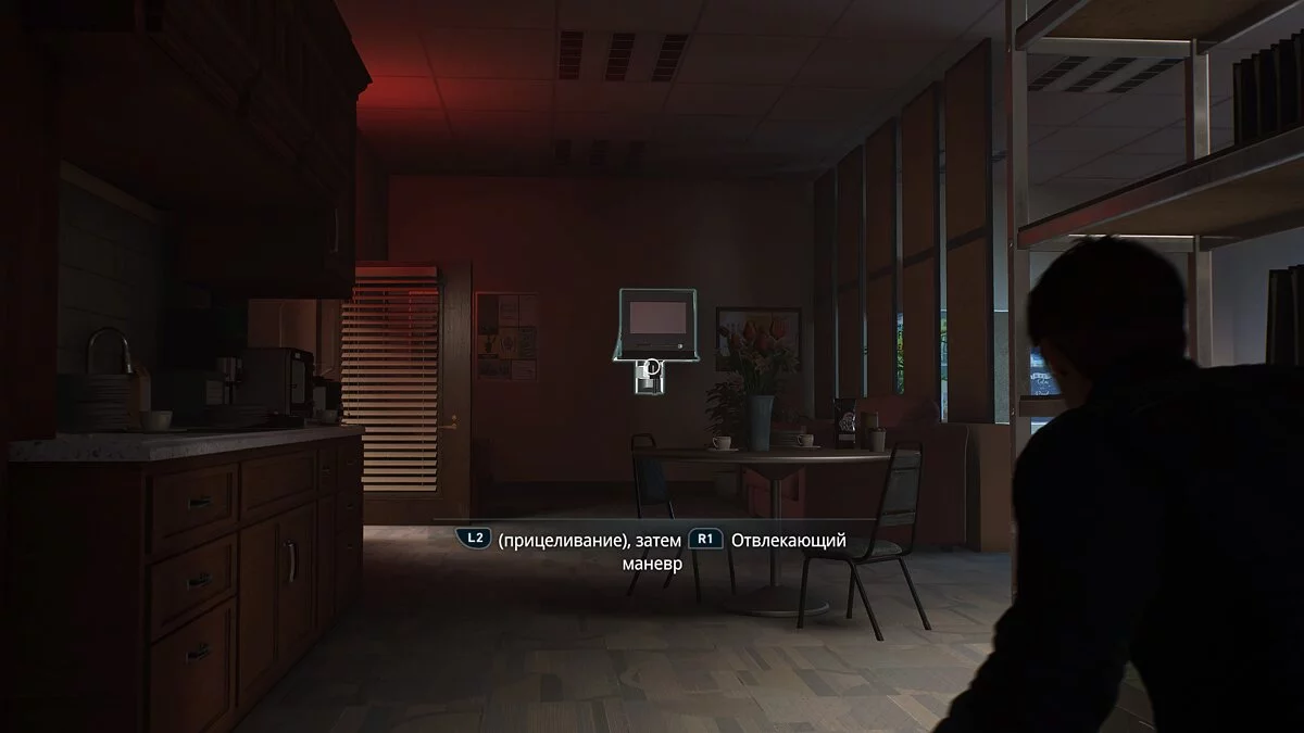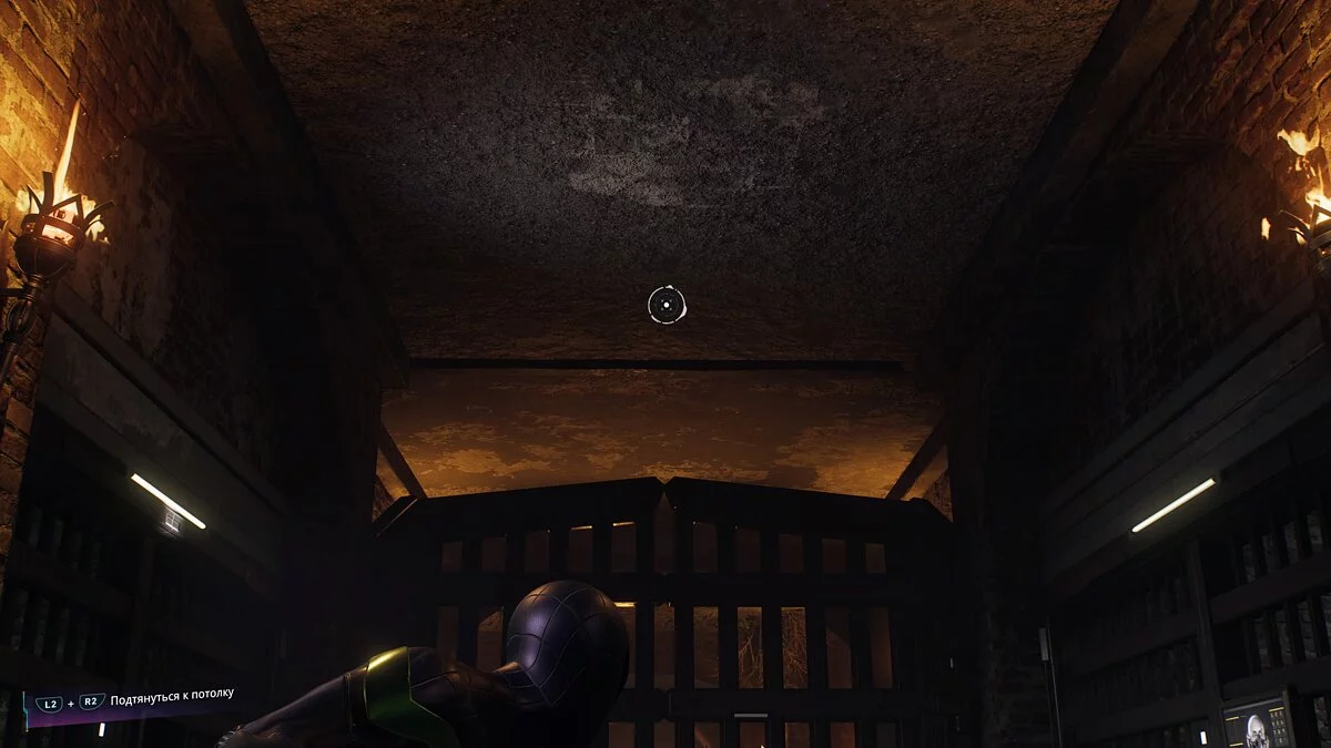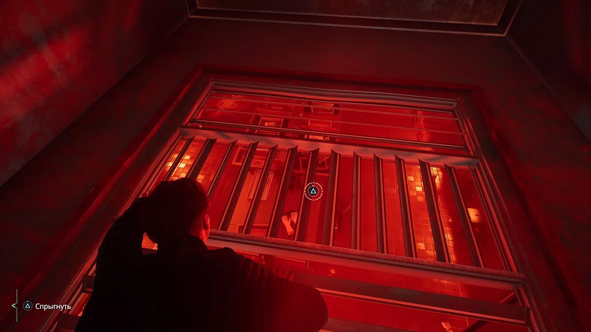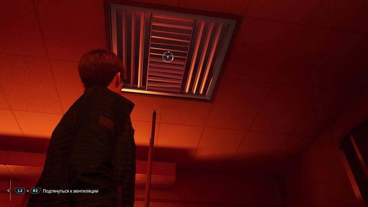 Охранник услышит вас. Резко прыгайте наверх сочетанием клавиш R2+«крестик». В центре комнаты есть вентиляционный люк. Воспользуйтесь им. Пройдите немного вперёд и спускайтесь вниз.