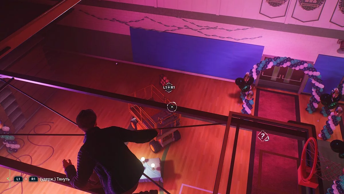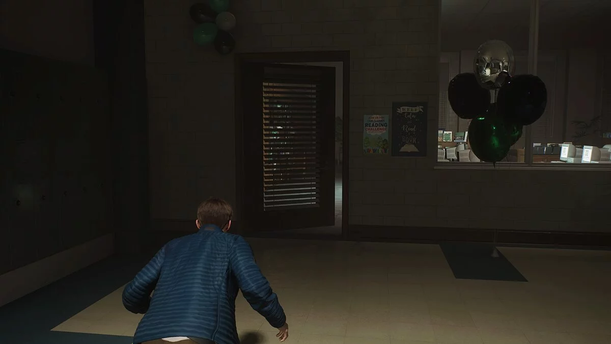 Снова вспоминаем события прошлого. Бегите за Гарри. Когда появится охранник, нужно будет проползти под столами справа. Выстрелите паутиной по воздушным шарикам, чтобы отвлечь мужчину. Выйдите из укрытия и заберите флэшку в вашем шкафчике.