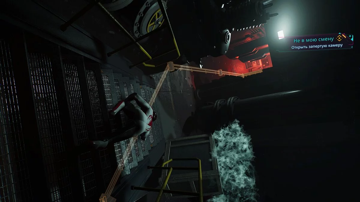 Прыгайте наверх, открывайте люк и стреляйте из инжектора паутины по вентилятору. Проползите между лопастями, откройте решётку и спуститесь вниз.